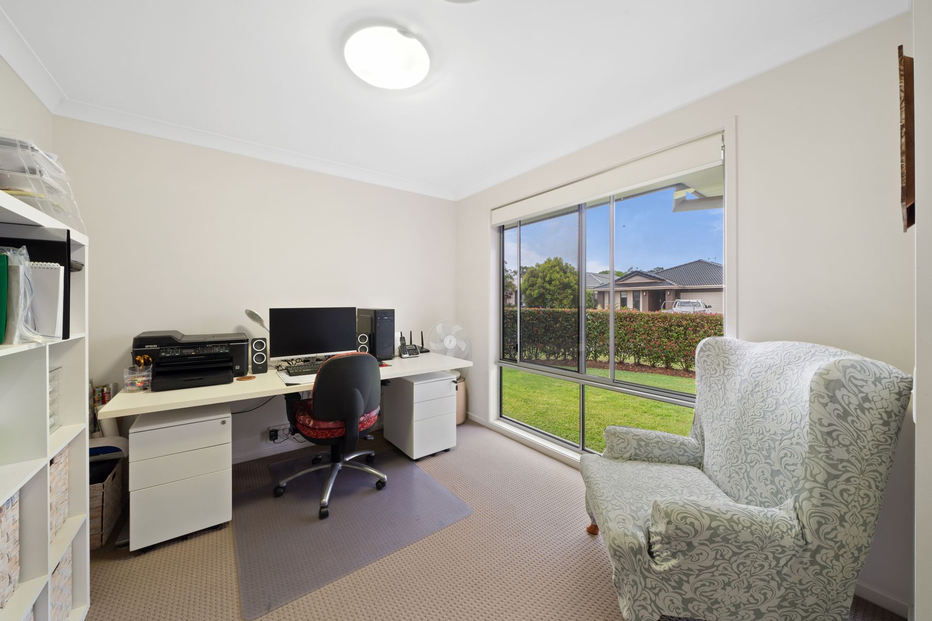 > The formal lounge room at the front of the home, currently set up as a home office features carpet flooring, oyster lighting and sliding windows with Crimsafe security screens and block out roller blinds.