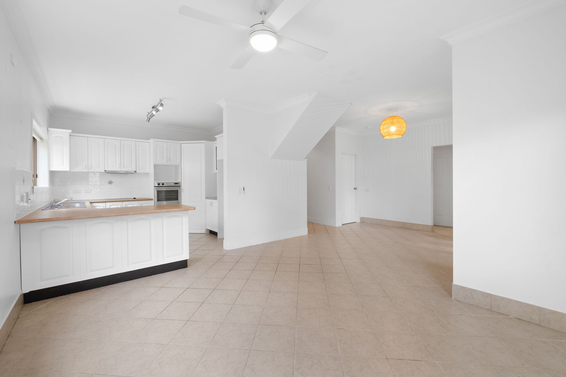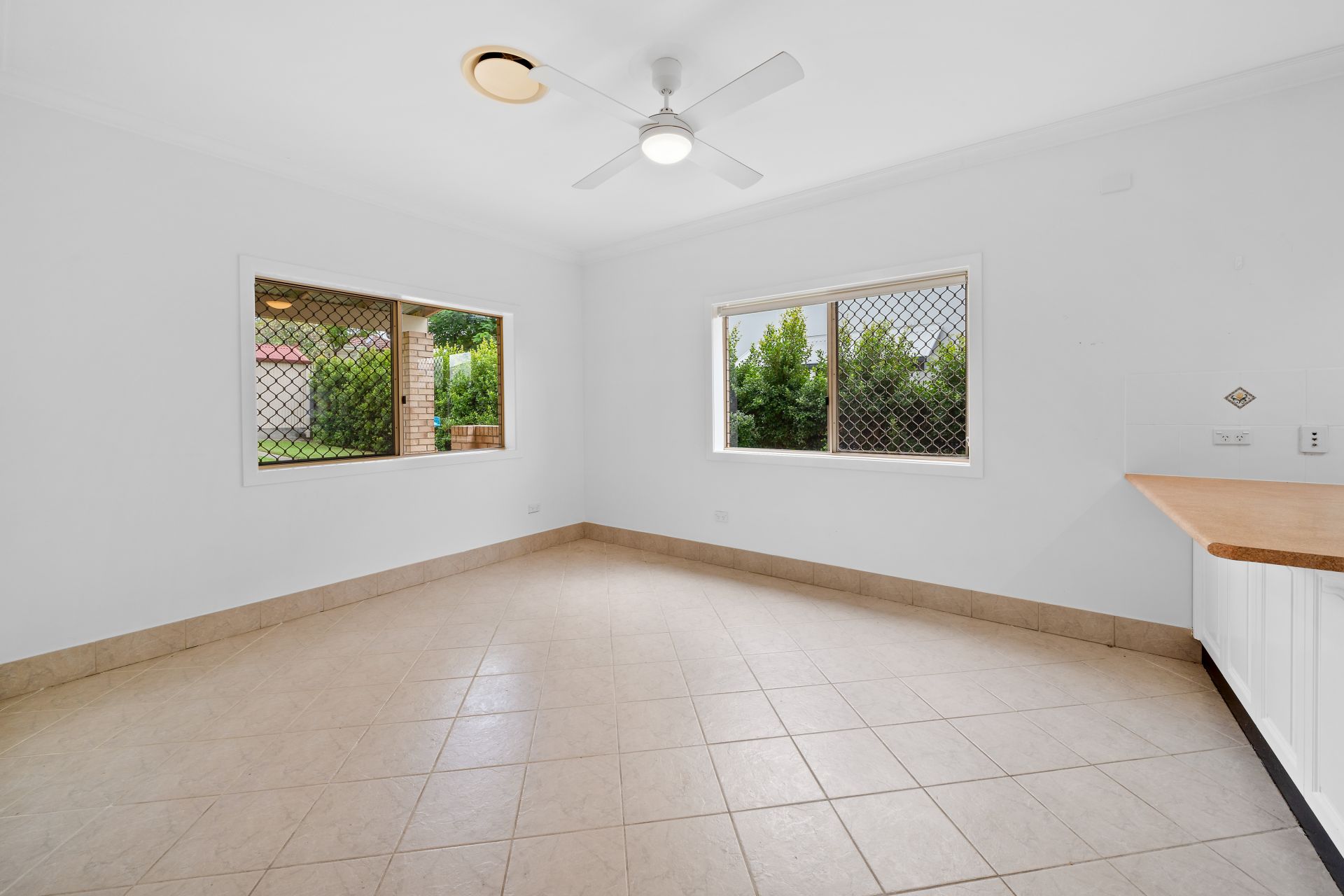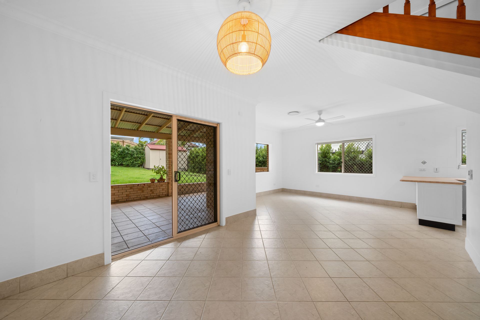 > The open plan family/dining areas located at the back of the house features extra high ceilings, ducted air-conditioning, tiled flooring, pendant lighting, ceiling fan with in-built lighting, roller blinds, sliding windows and doors with fly screens, and security grilles giving you access to outdoor entertaining area and yard.