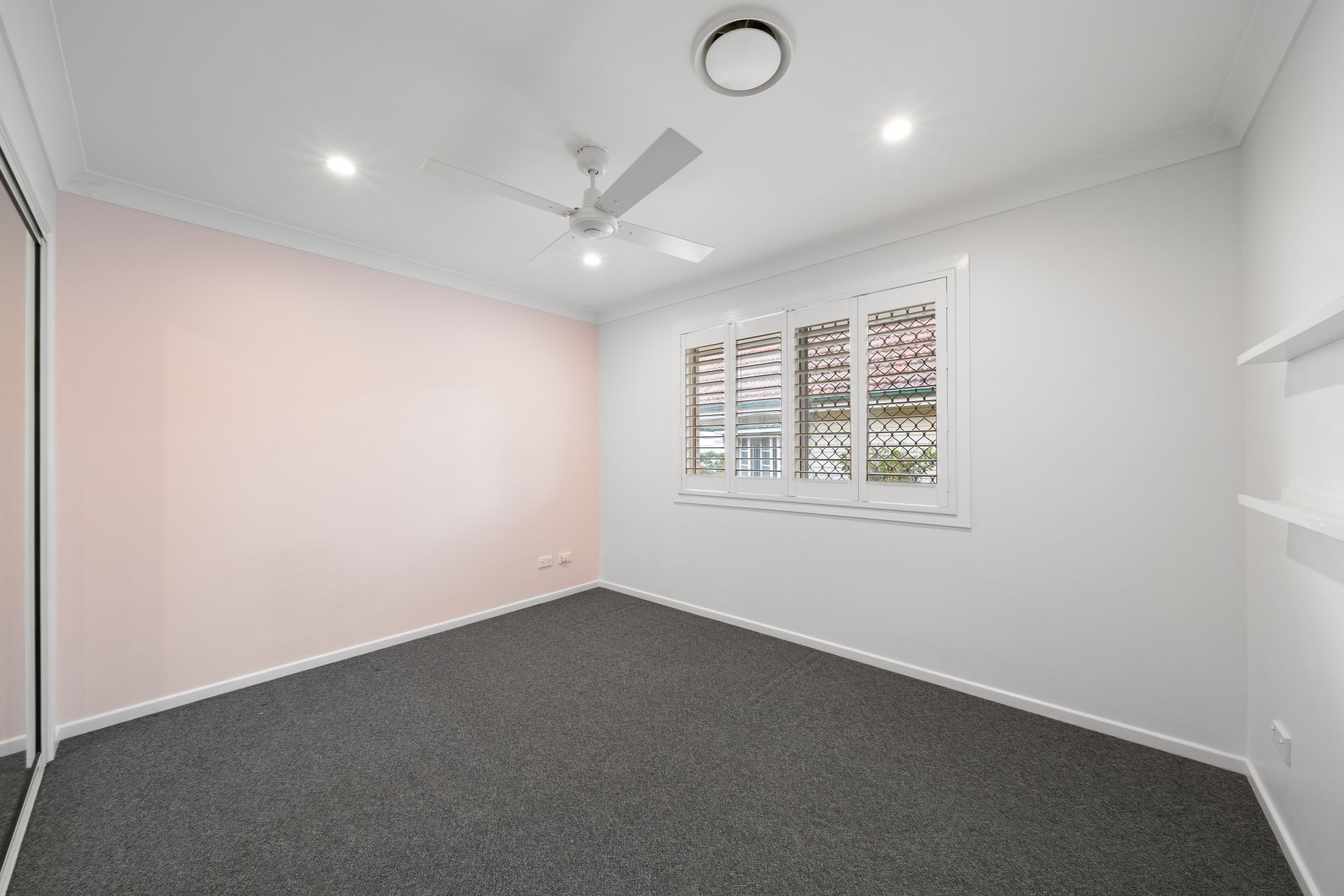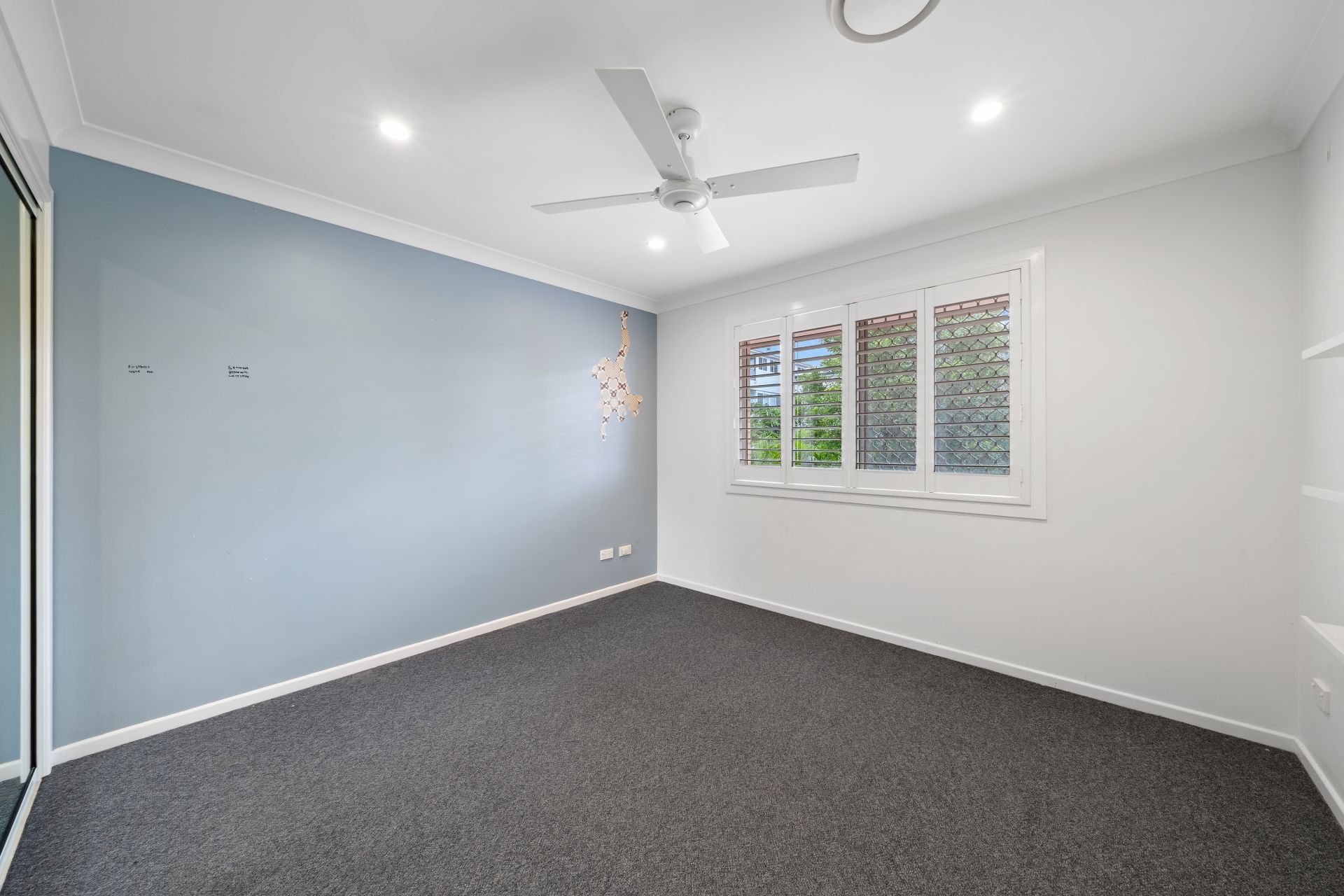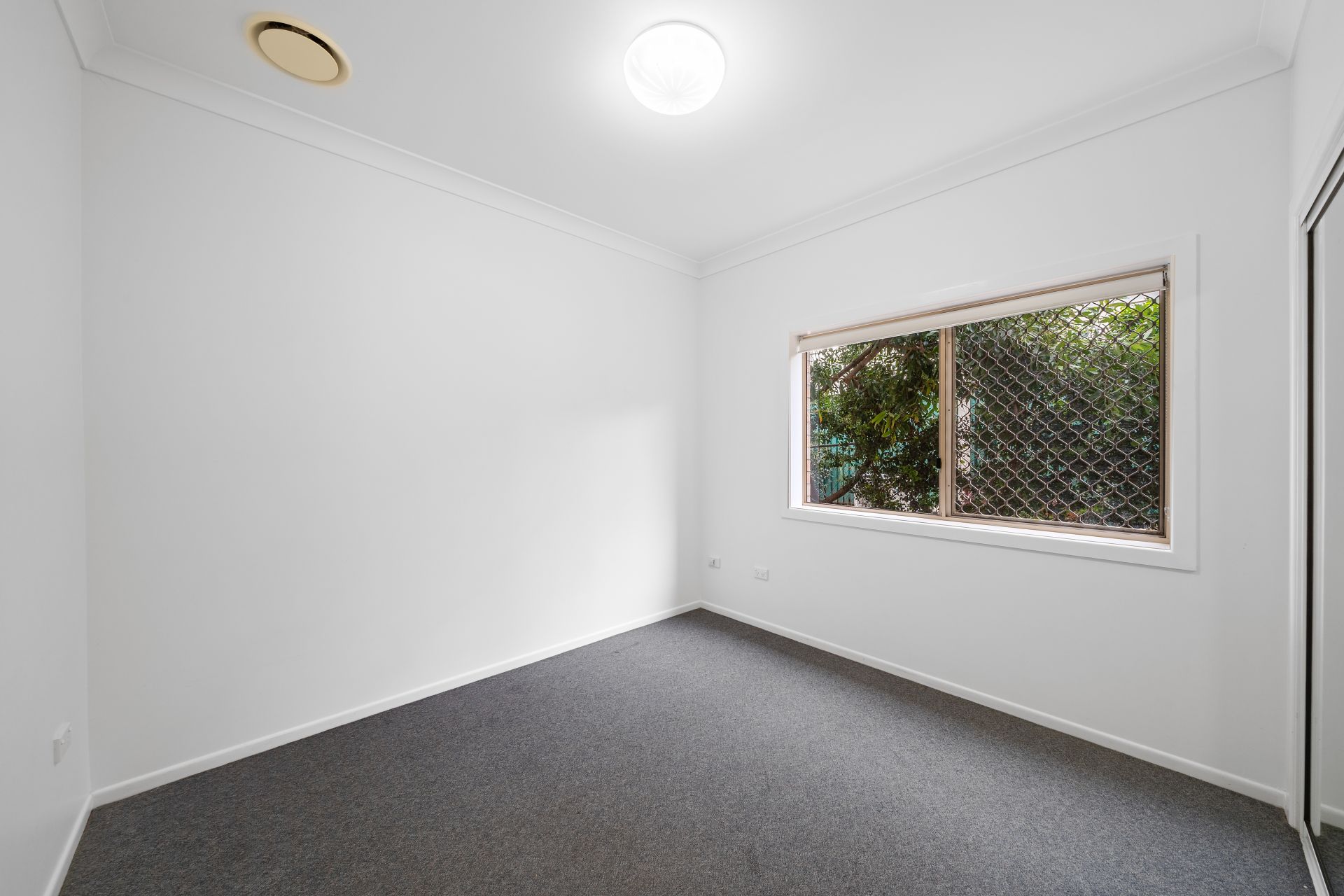 > Bedroom 5 located on the entry level offers extra-high ceilings, ducted air-conditioning, oyster lighting, carpet flooring, built-in robe and sliding window with fly screens, security grilles and roller blinds.