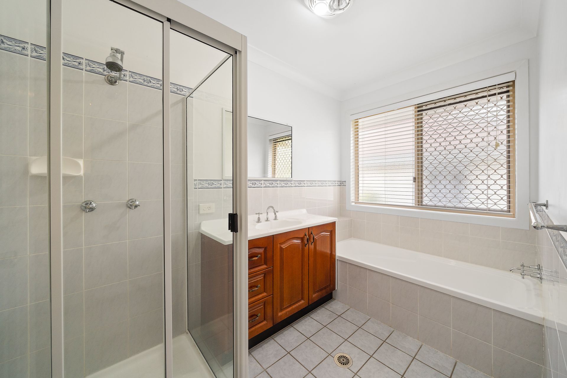 > The main bathroom features separate bath configuration, shower with standard showerhead, single basin vanity with plenty of storage, vanity mirror, extractor/heat/fan combination, towel rail, frosted sliding windows with security grille with venetian blind and separate powder room.