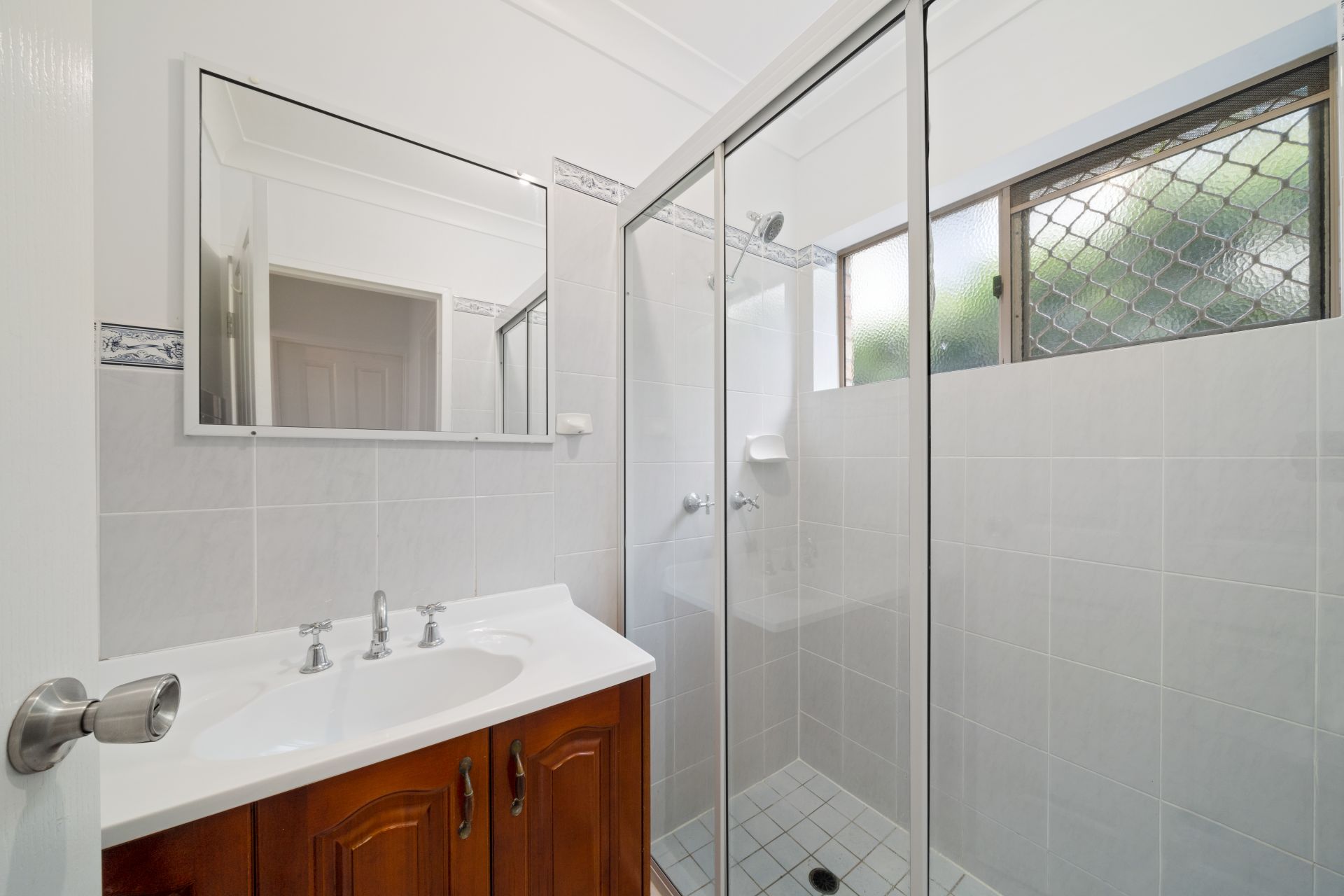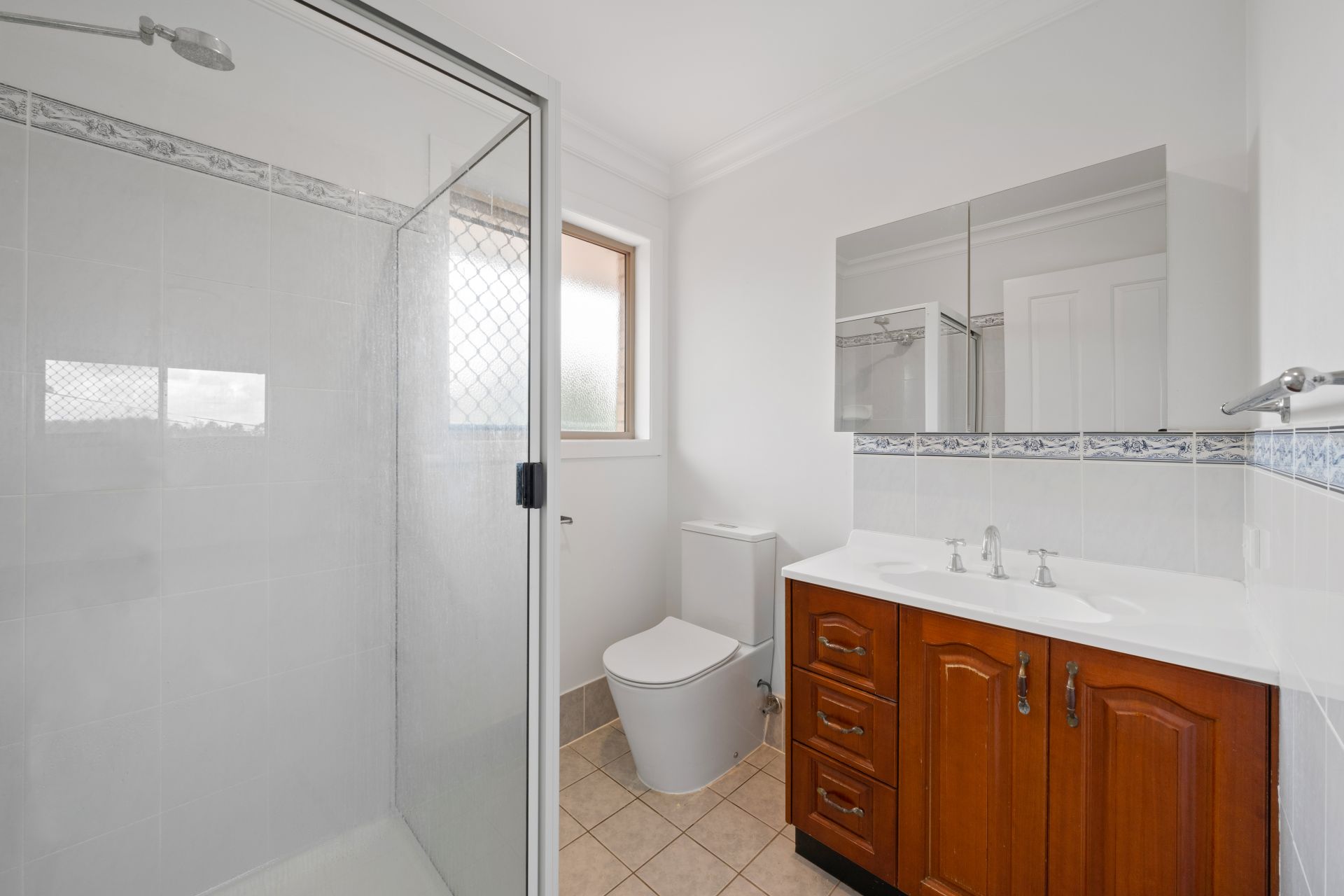 > The ensuite to the master features shower with standard showerhead, single basin vanity with plenty of storage, mirrored cabinet, extractor/heat/fan combination, towel rail, frosted sliding windows with security grille and toilet.