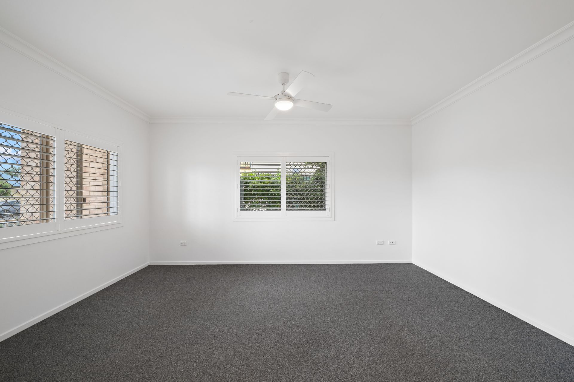 > Bedrooms 2 and 3 enjoy ducted air-conditioning, ceiling fans, down lighting, carpet flooring, built-in robes and sliding windows with fly screens, security grilles with plantation shutters.