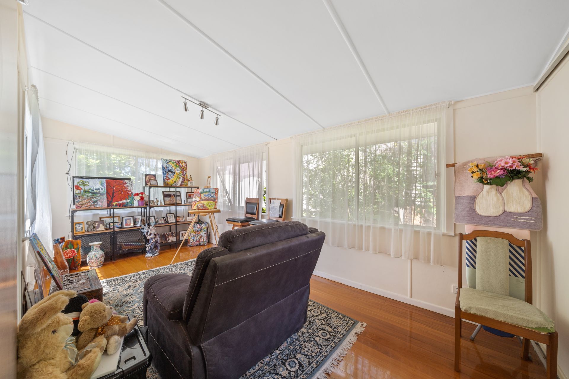 > Additional living area located at the rear of the home features raked ceiling, sliding windows, adjustable spotlights, sheer curtains, rich timber flooring and external access to rear deck.
