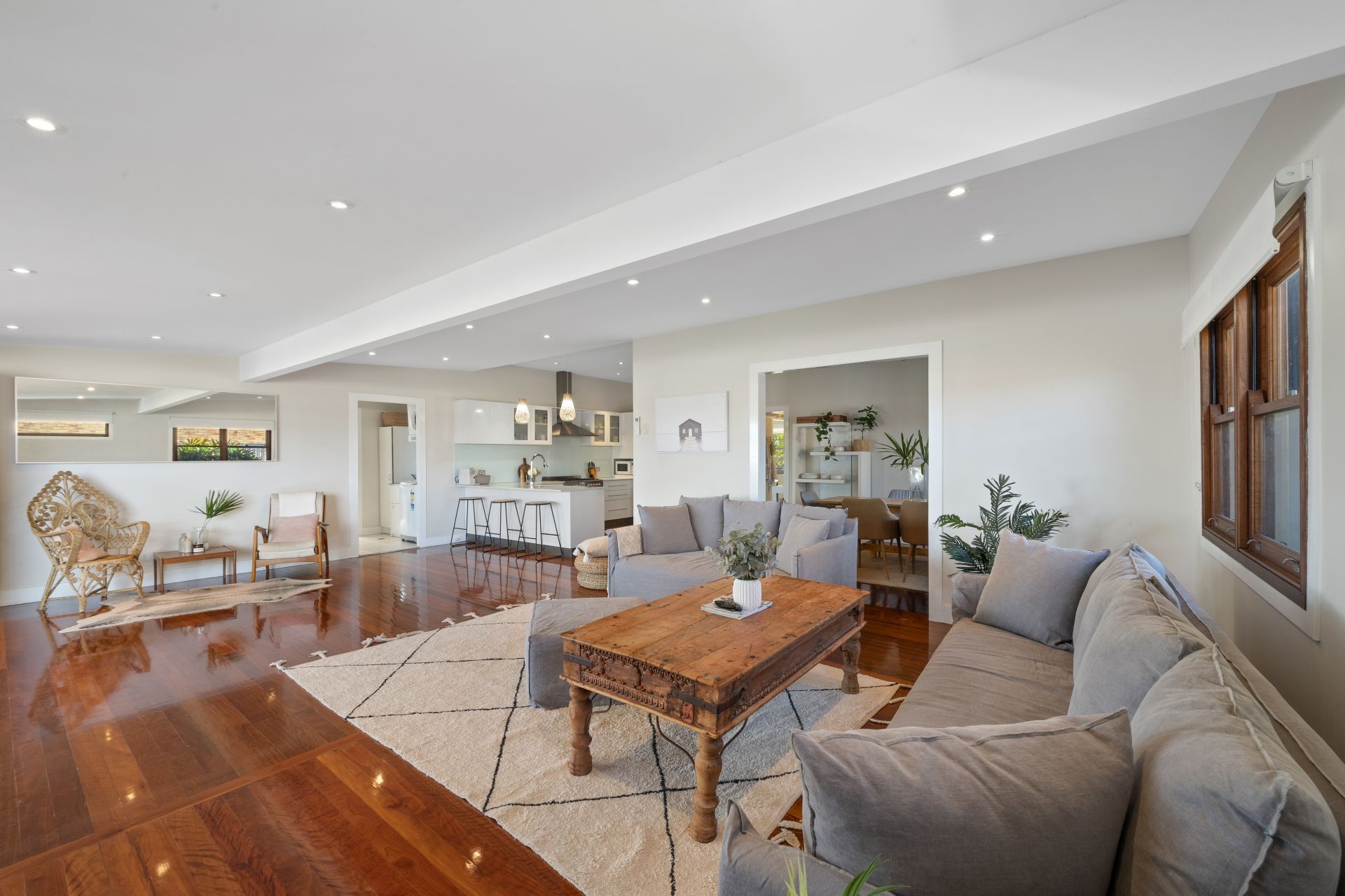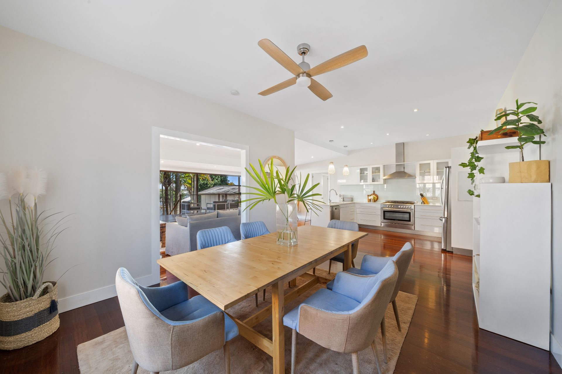 - Dining room is perfectly positioned beside the chef's kitchen and large enough for the biggest of tables. The dining room features polished timber floors, neutral tones and a wooden ceiling