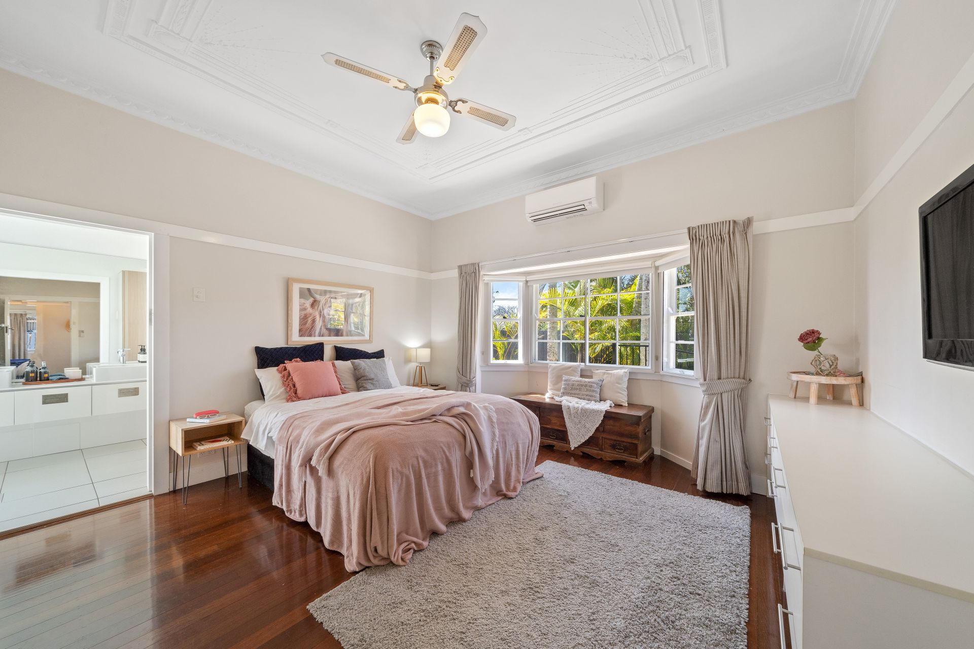 The Master bedroom is located at the front of the home and features double glazed bay windows, block-out curtains, ceiling fan, split-system air-conditioner, polished timber floors, classic picture rail, built-in storage, stunning ceiling details and a walk-in robe perfect for any fashionista