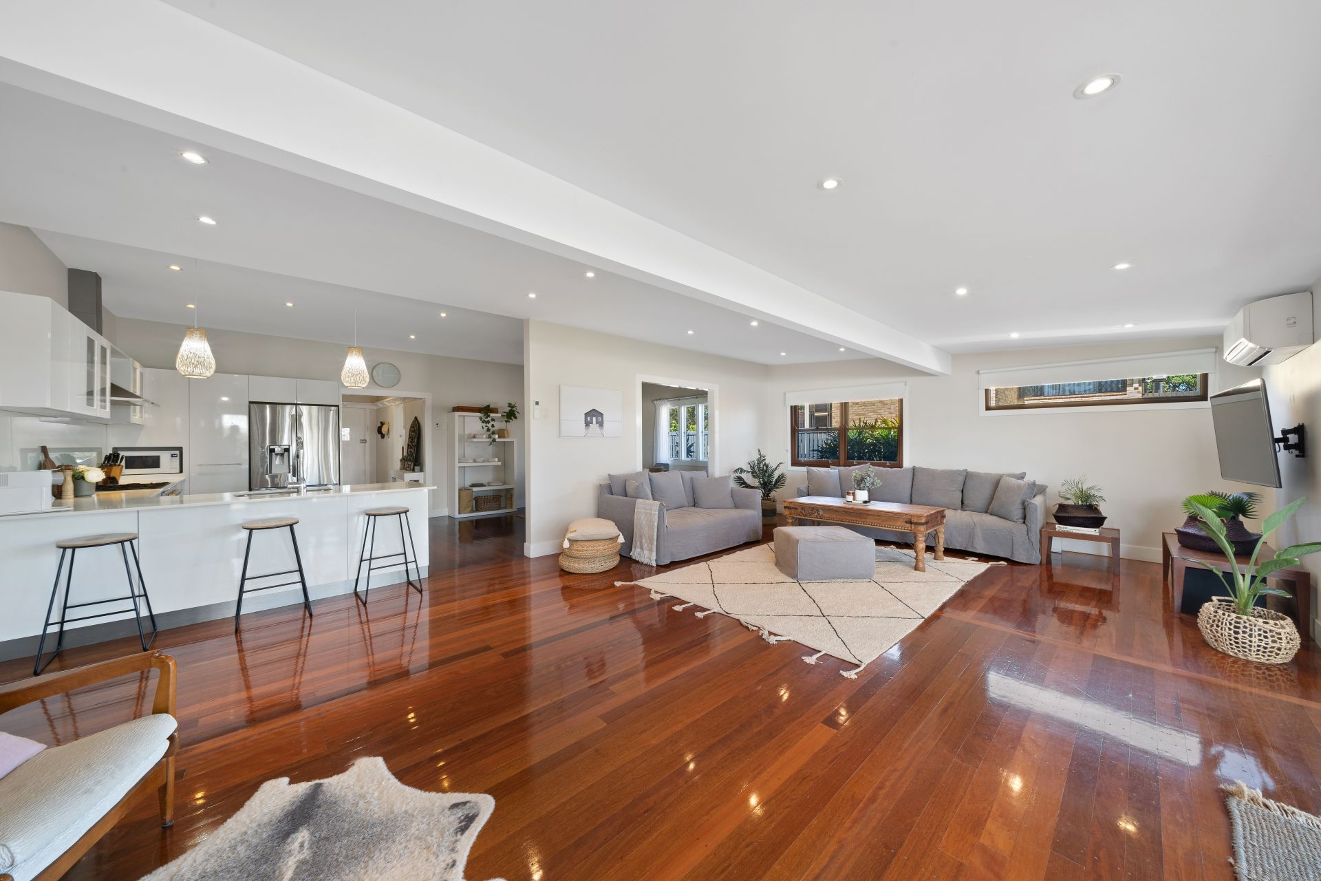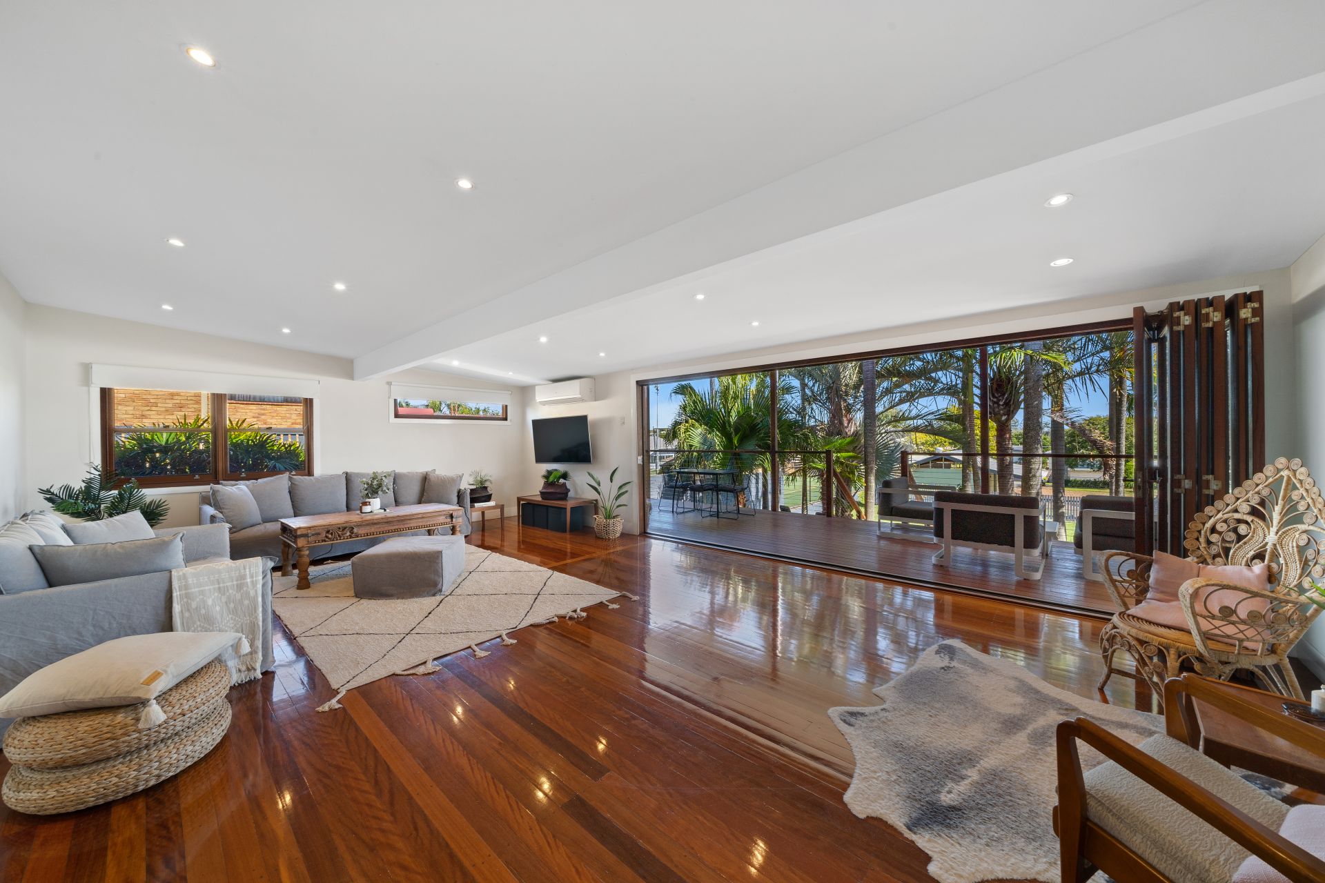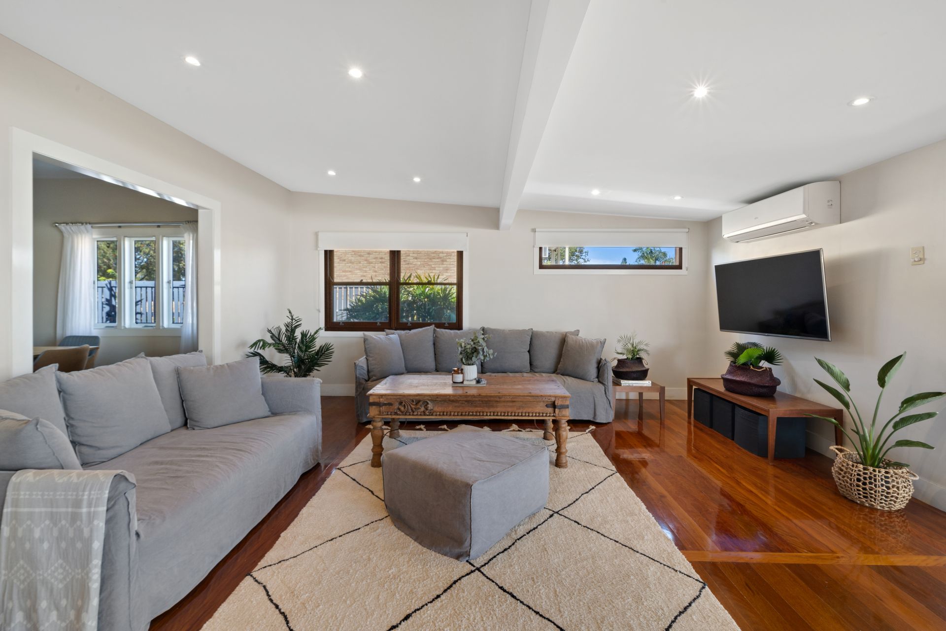 - Summer living at its best with almost one-half of the home being able to be opened to the covered outdoor entertaining area. Flowing from the oversized lounge room with a split-system air-conditioner the polished timber floors and neutral tones blur the indoor/outdoor lines