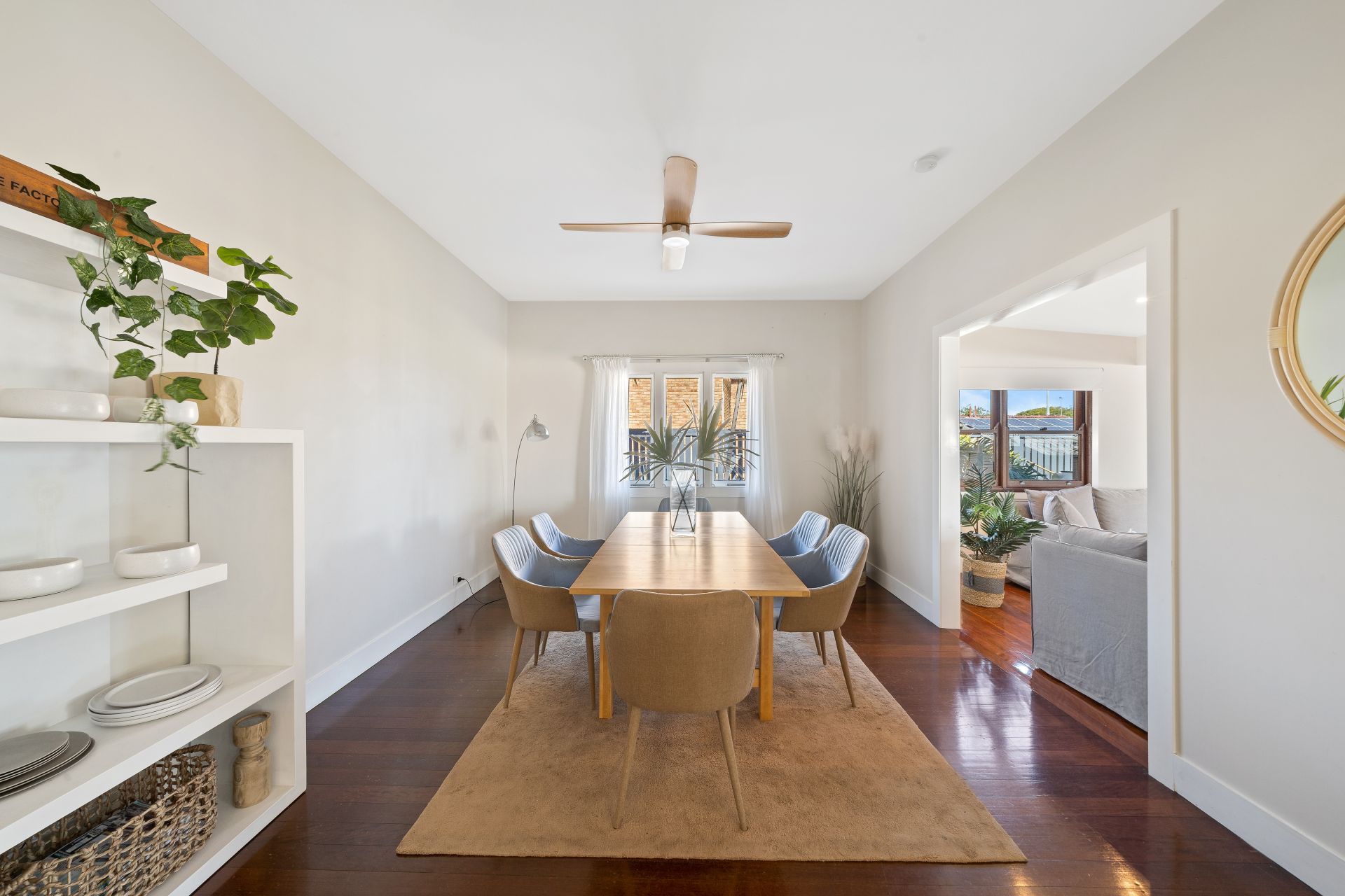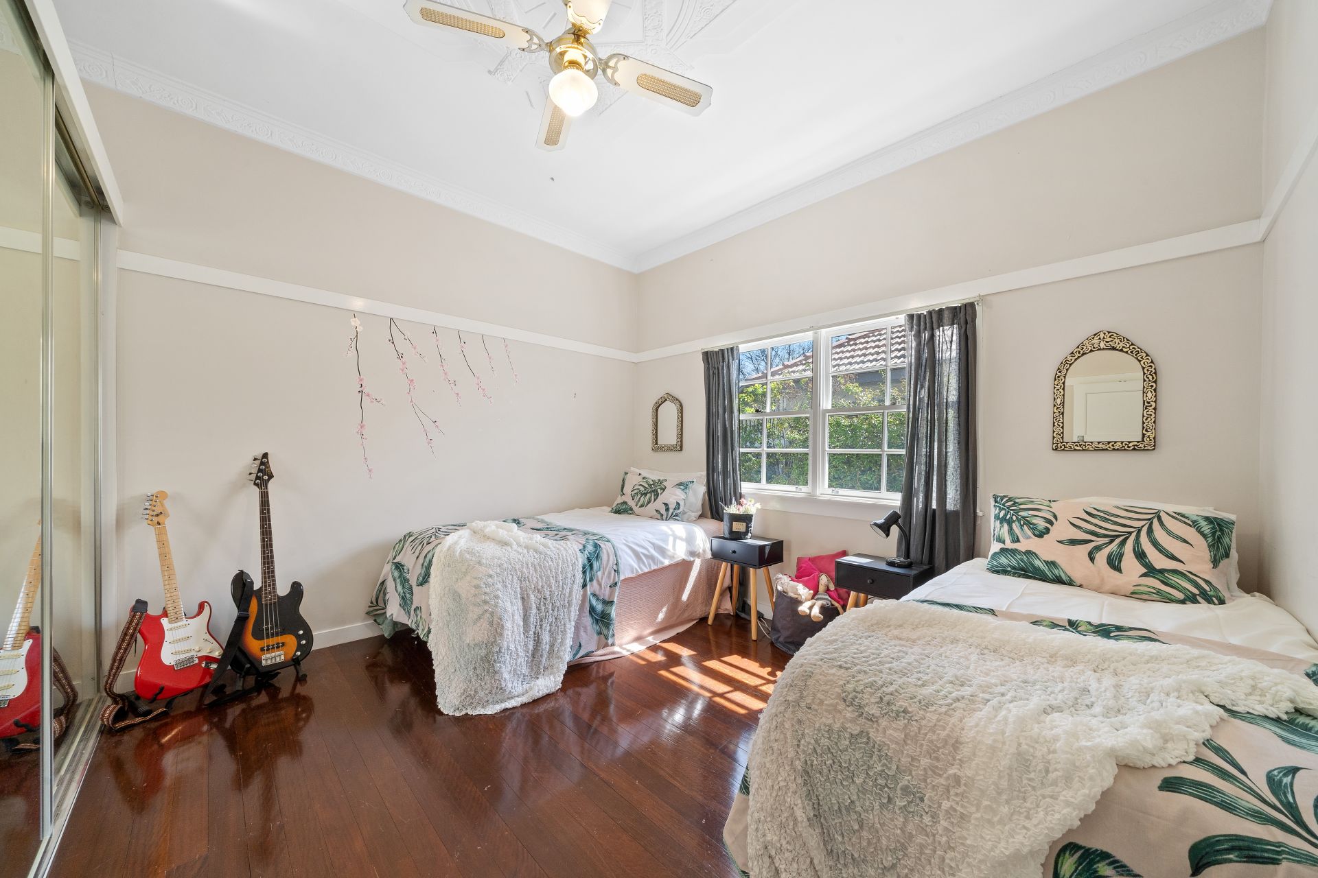 Bedroom three is just as impressive with a ceiling fan, beautiful ceiling details, curtains, polished timber floors, picture rail and mirrored double wardrobes