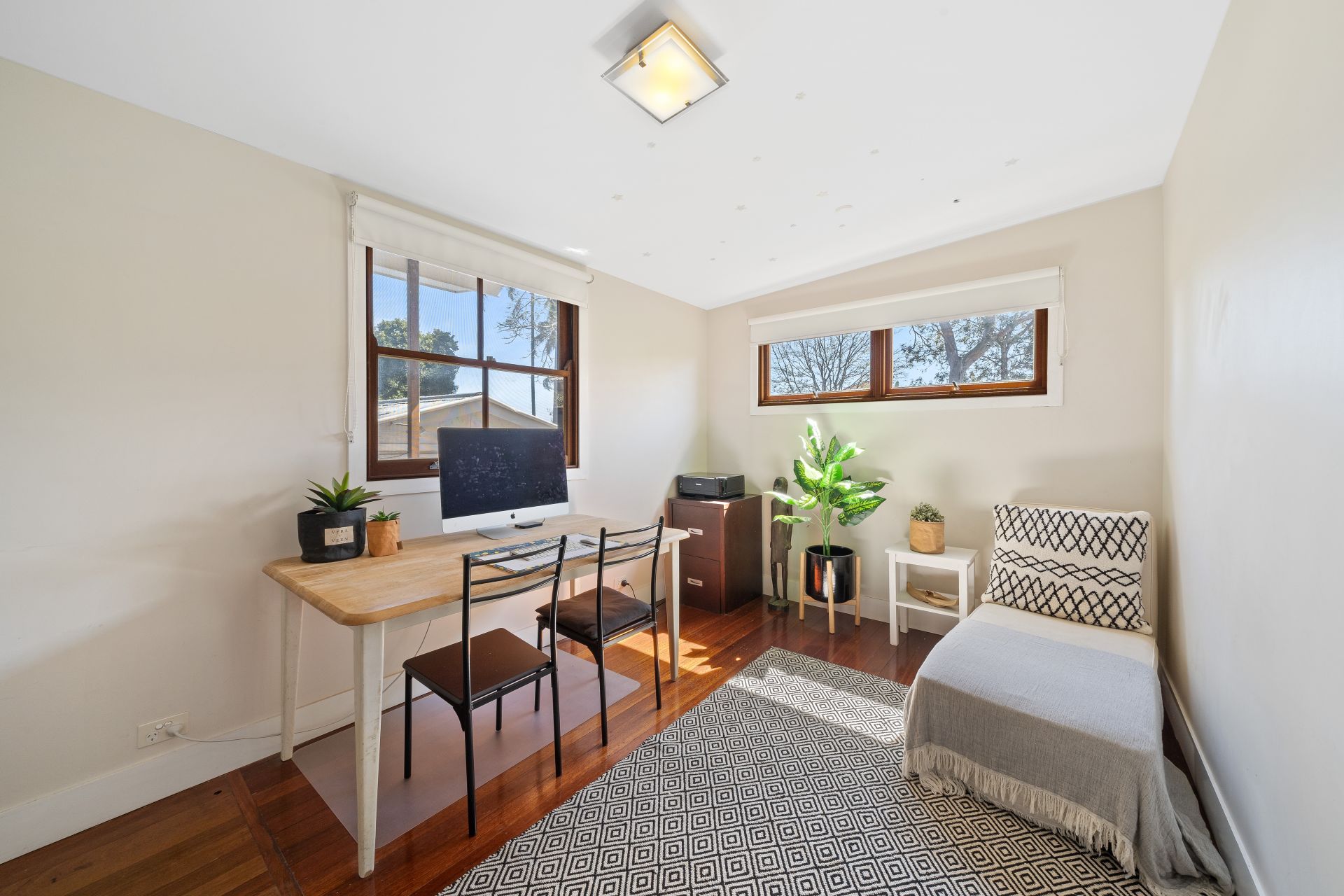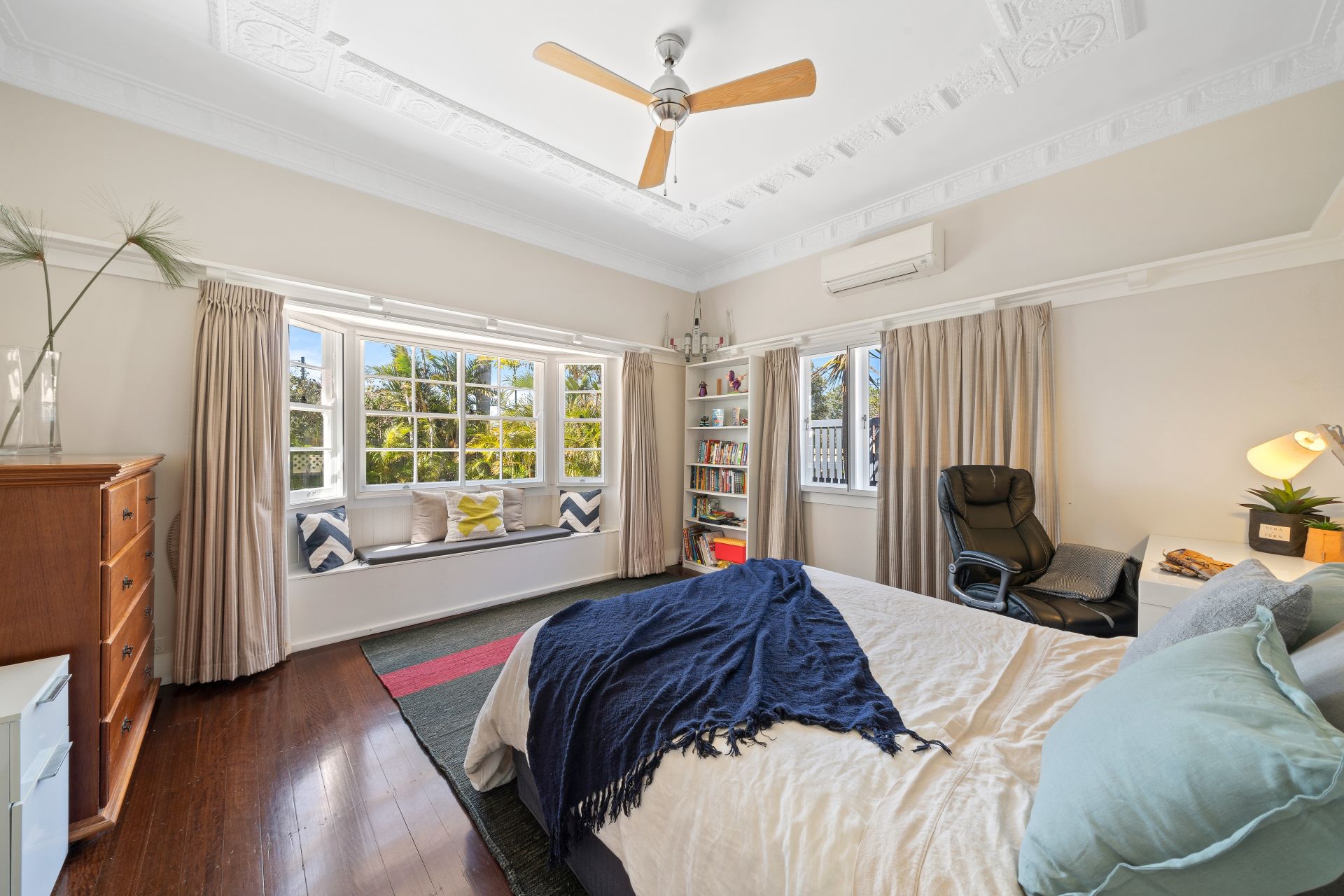 Bedroom two overlooks the pool and the beautiful bay window with double glazing makes this room a perfect second bedroom. Polished timber floors, ceiling fan, split-system air-conditioner, stunning ceiling details, classic picture rail and block-out curtains complete the room