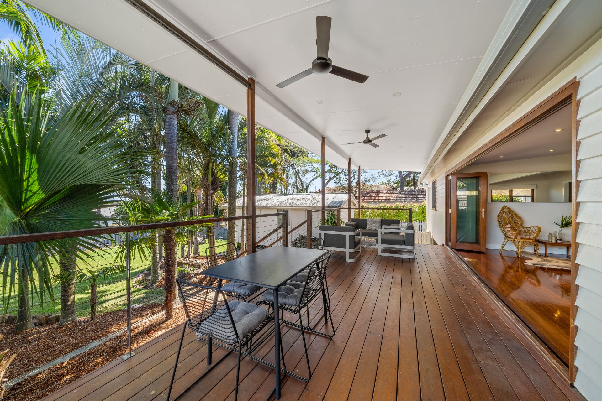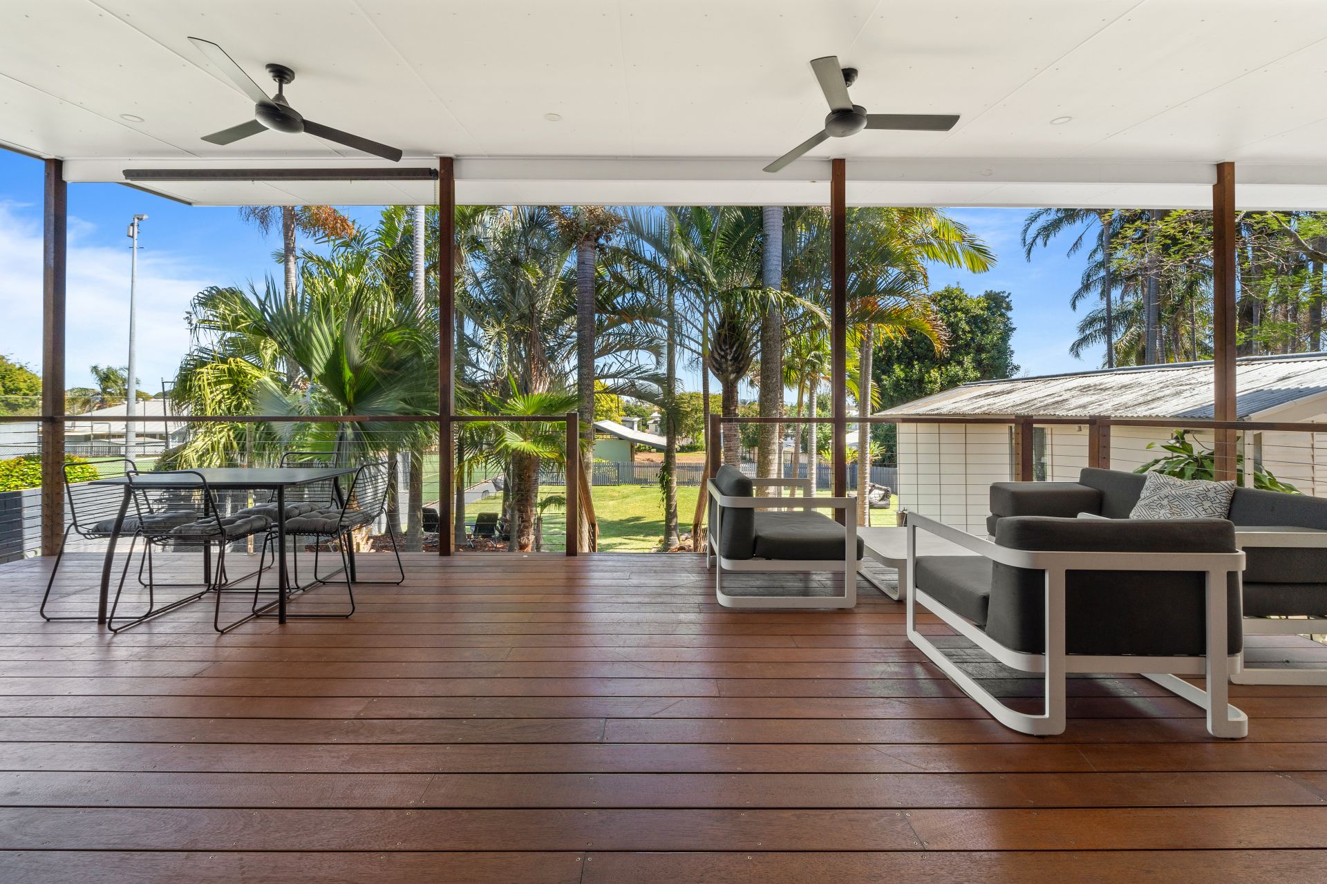 - Outdoor entertaining will be a breeze with the stunning covered deck which flows to the lush fully-fenced grassed area large enough to play frisbee with a few friends. The private area thanks to trees and roll-down blinds this area is a perfect place to watch the sunset