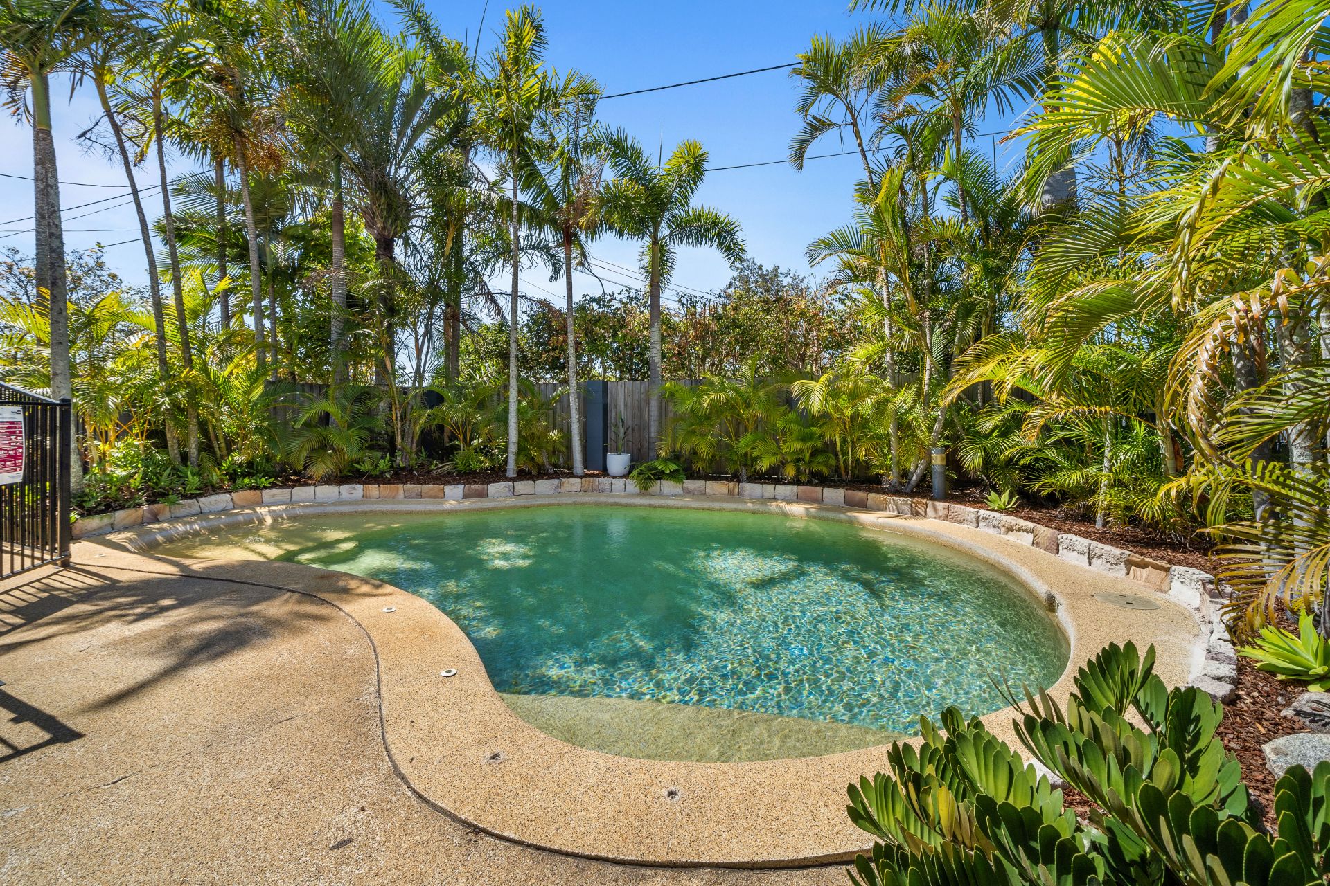 - The resort-style pool is located at the front of the home, tucked behind a large fence. Although an unconventional location it simply works for summer.