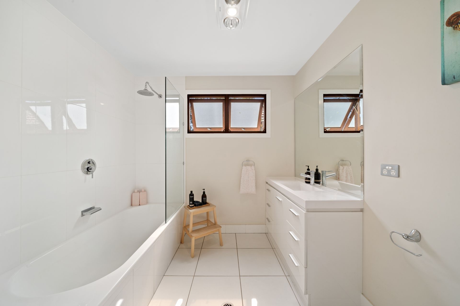 The main bathroom is perfectly position for the family. A large shower over bath, vanity with loads of storage and large mirror make this elegantly simple bathroom a pleasure to start the day