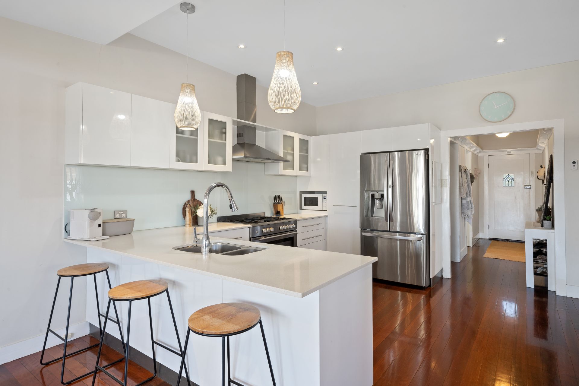 The breakfast bar will be the perfect morning hangout and the stone benches, crisp white cabinetry matches perfectly with the warm polished timber floors. The large 6 burner gas cooktop, electric oven, stainless steel range hood, dishwasher and large plumbed fridge space make this the perfect family-friendly kitchen