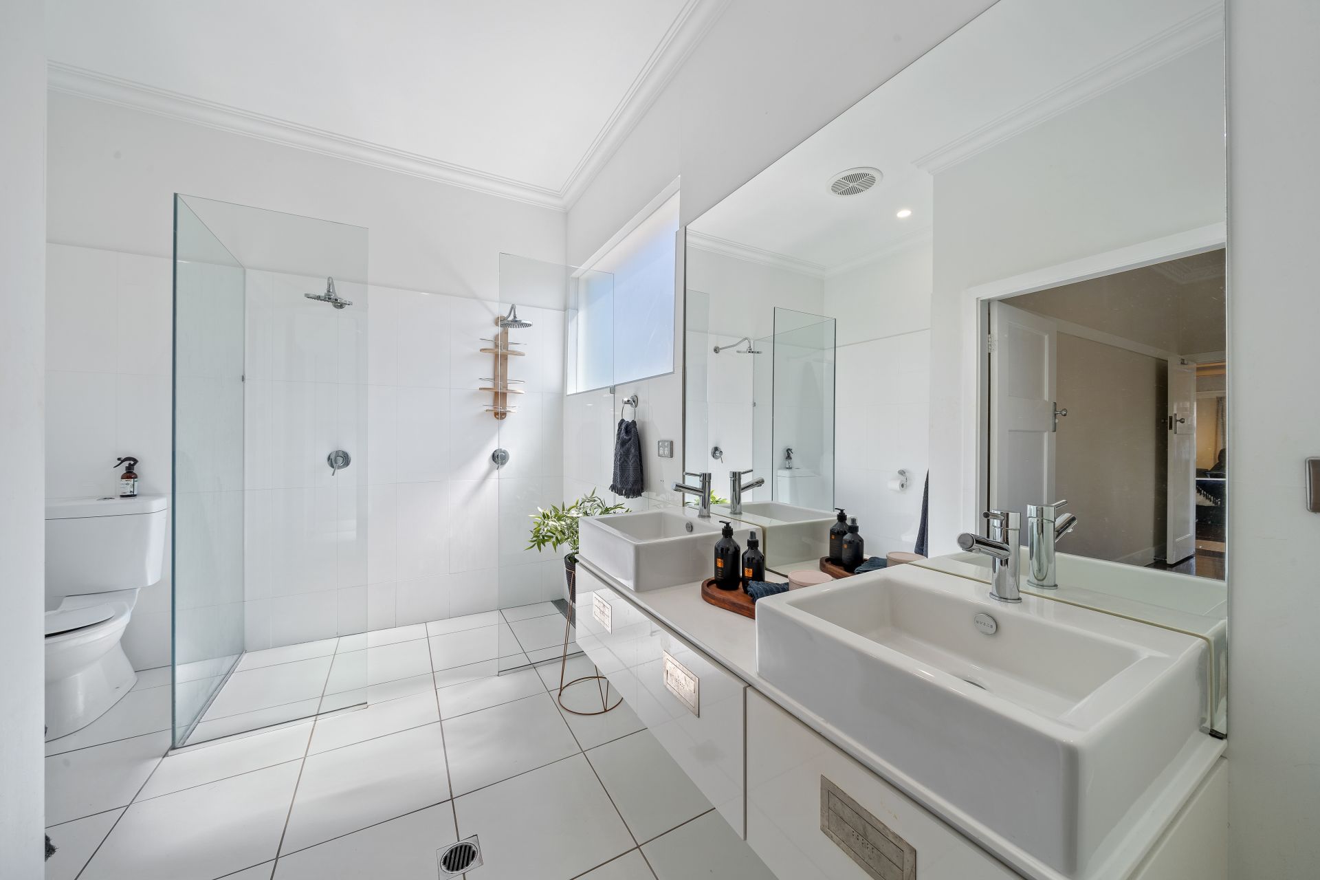 The ensuite is nothing short of perfection. Stunning white tiles and paintwork with a large north-facing glass panel designed to bring the morning sun in whilst you shower in the dual showers. Double vanity with drawers, large frameless mirror and toilet