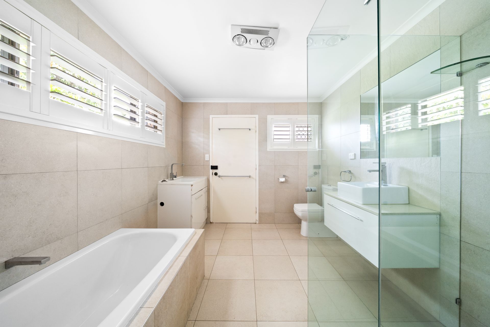 > The well-appointed European bathroom features a shower with detachable and raindrop showerheads, tiled flooring, separate bath, single basin vanity with plenty of storage, wall mounted vanity mirror, floor-to-ceiling tiles, towel and hand towel rails, sliding windows with plantation shutters, toilet, fan/heater/light combo and external access to the backyard