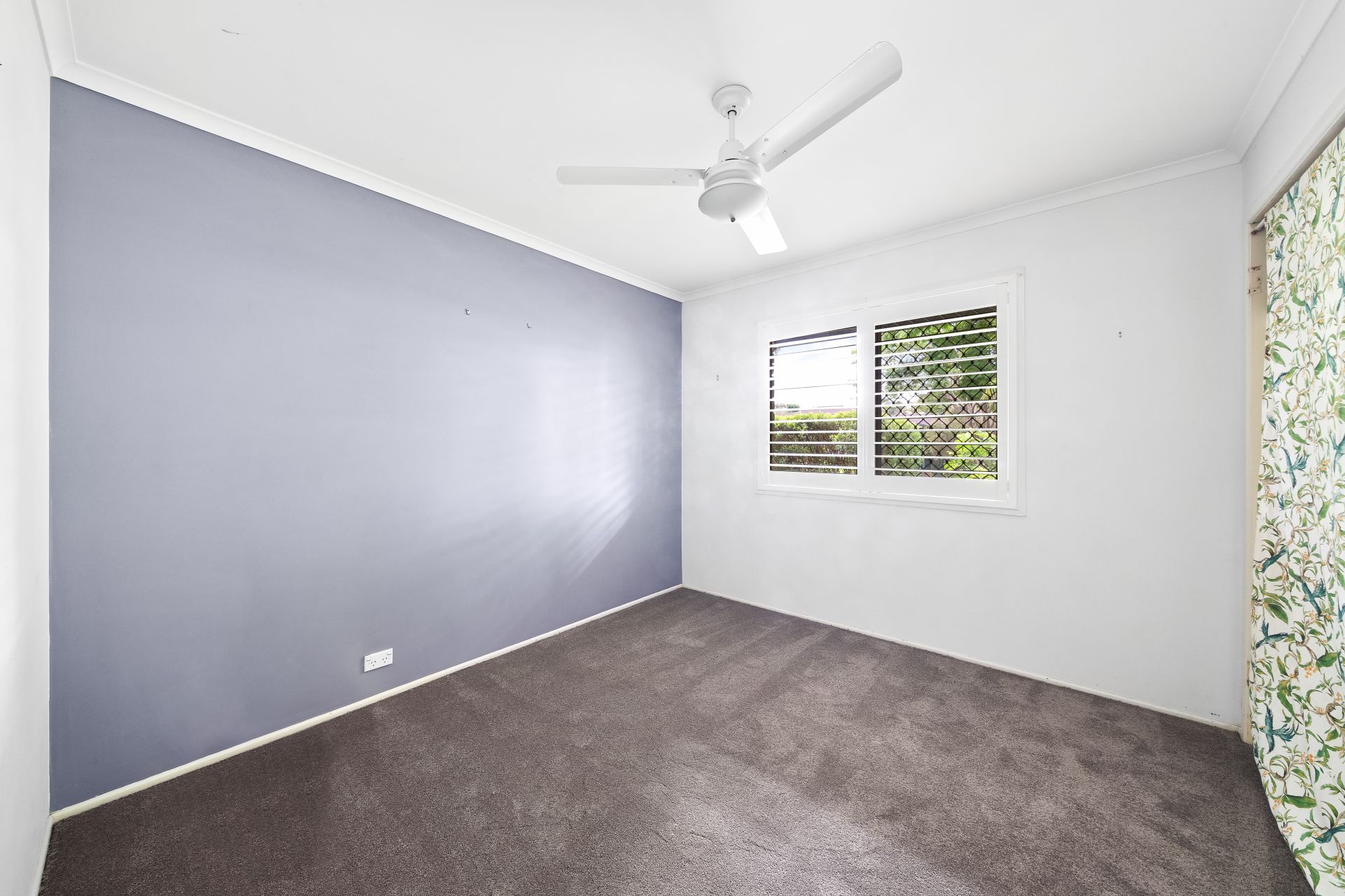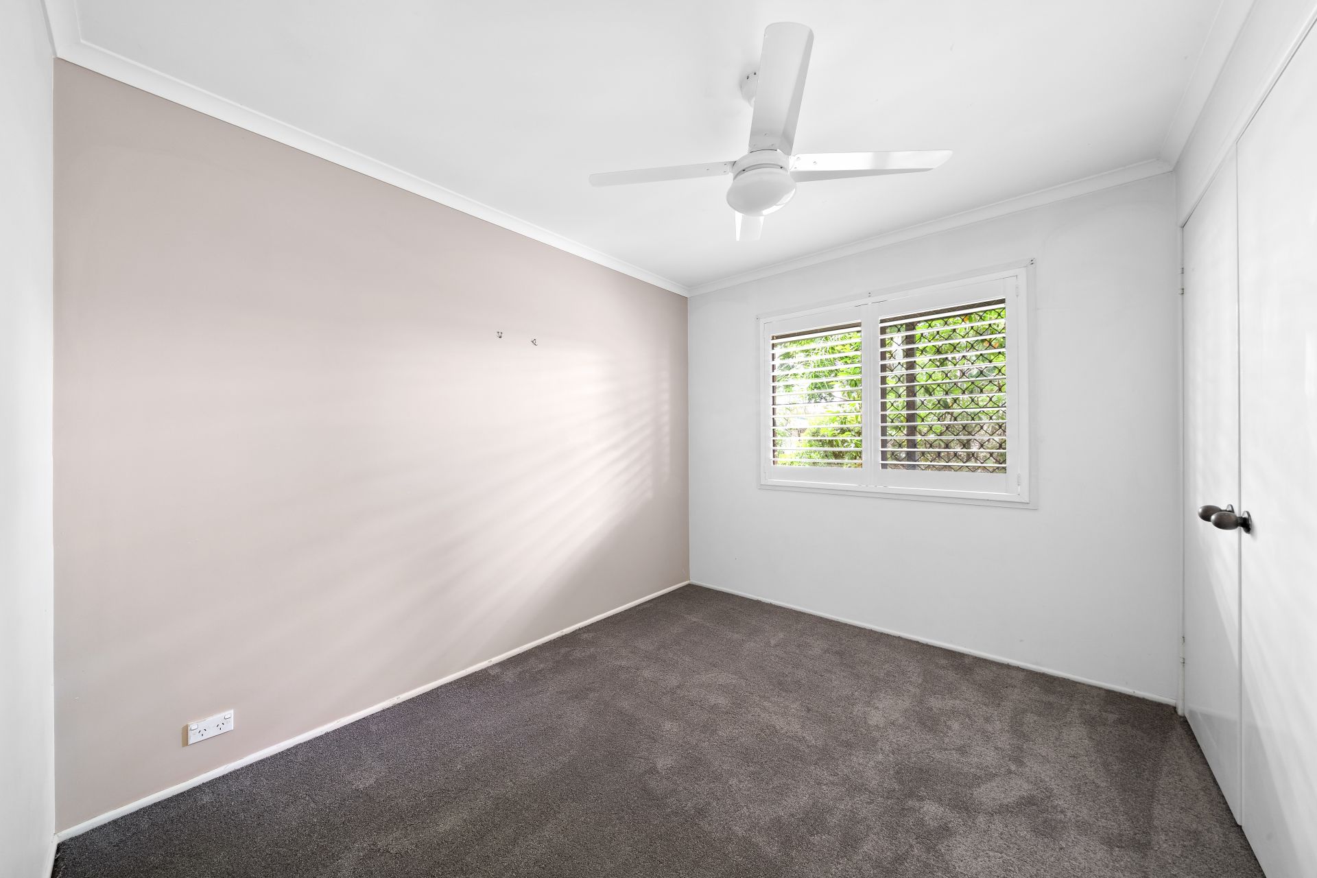 > Bedroom four features carpet flooring, a combination of sliding and awning windows with plantation shutters, ceiling fan with built-in lighting, large built-in-robe