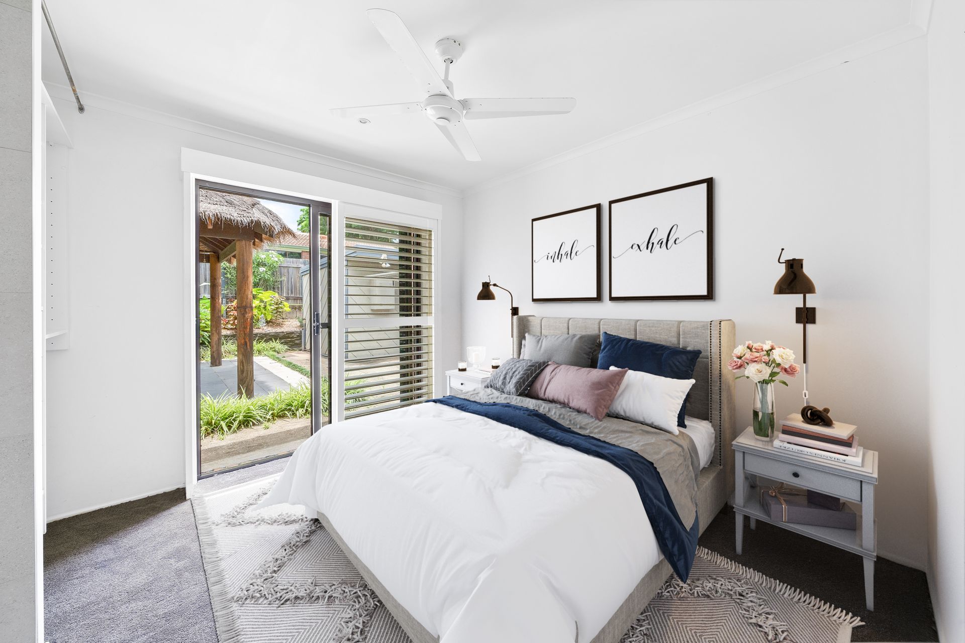 > Bedrooms two and three features carpet flooring, sliding windows with plantation shutters, ceiling fan with built-in lighting, large built-in-robes