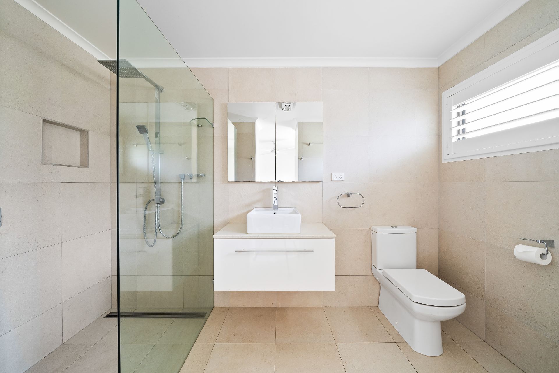 > The master ensuite features a shower with detachable and raindrop showerheads, tiled flooring, single basin vanity with plenty of storage, mirrored cabinet, floor-to-ceiling tiles, sliding windows with plantation shutters, towel and hand towel rails, fan/heater/light combo and toilet.
