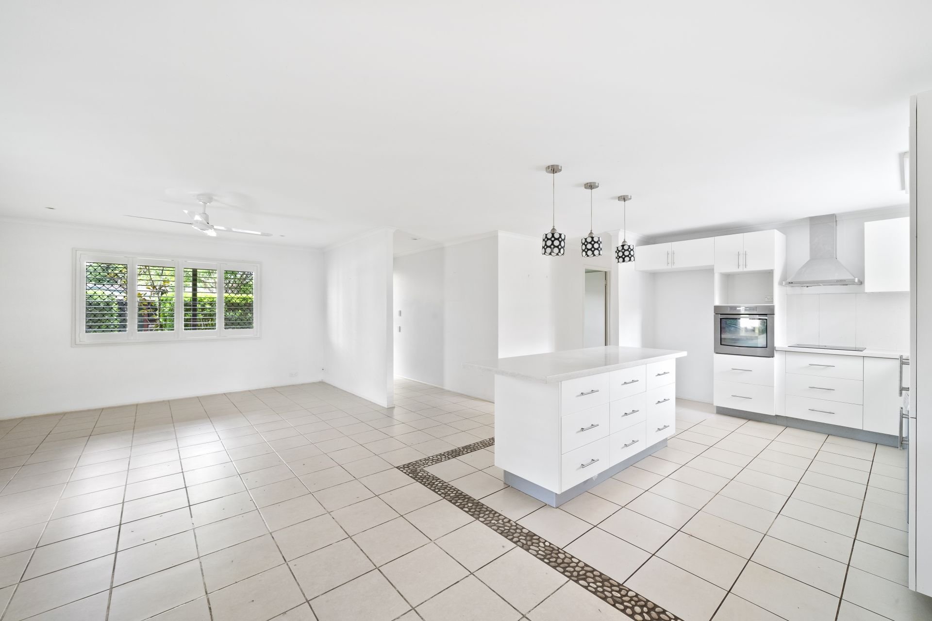 - Modern kitchen with stone benchtops, island bench with loads of storage space, Omega electric cooktop, Omega dishwasher, Westinghouse electric wall oven, electric glass cooktop, SLM stainless-steel rangehood, dual basin stainless-steel sink, pendant and fluorescent lighting, large fridge space, loads of natural light, tiled flooring, sliding windows with plantation shutters