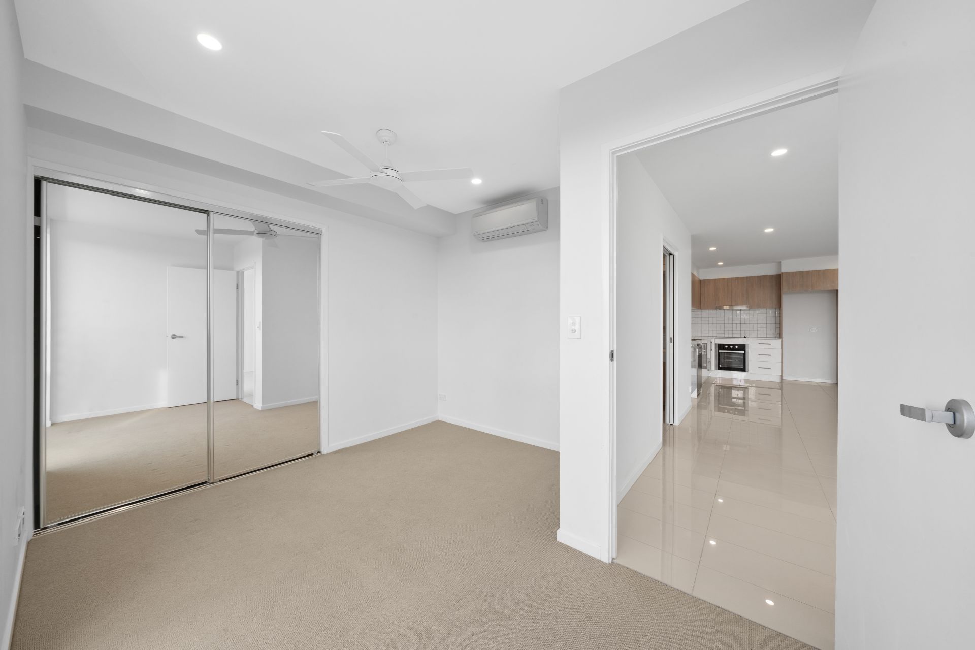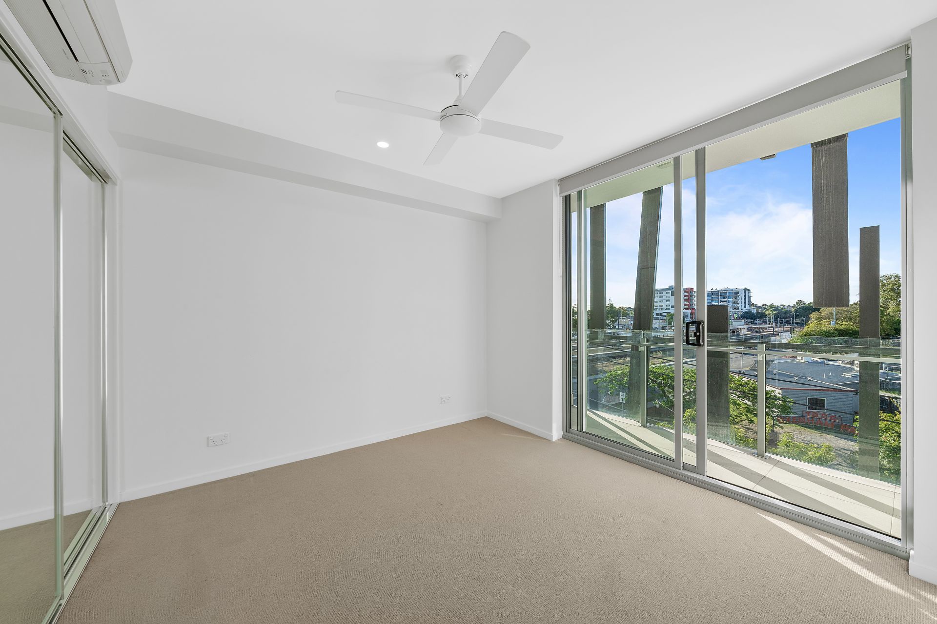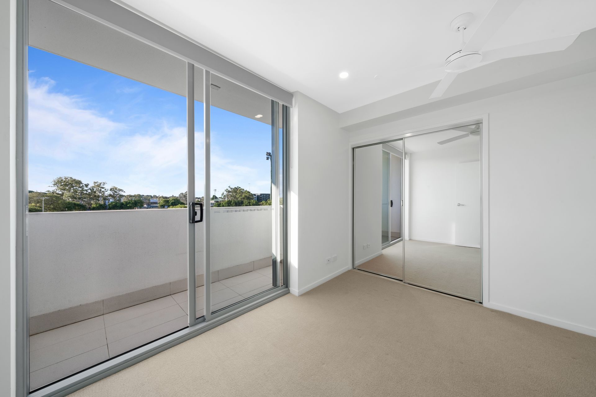 - Bedroom two featuring mirrored built-in wardrobe, carpeted flooring, ceiling fan, split-system air-conditioner, block-out roller blinds and private balcony