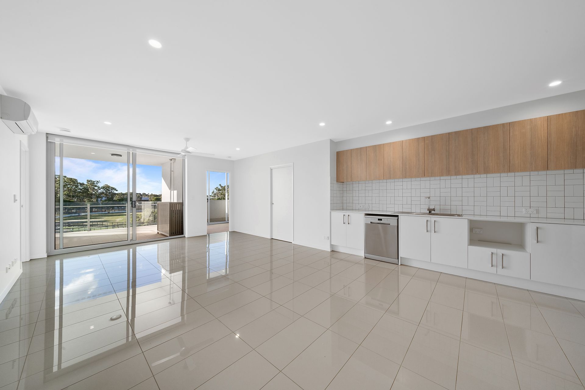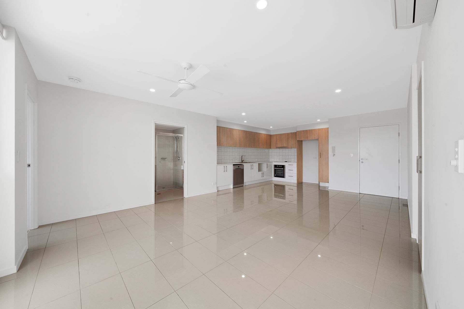 > Large flexible open-plan living area with air-conditioning, ceiling fan and high gloss tiled floors