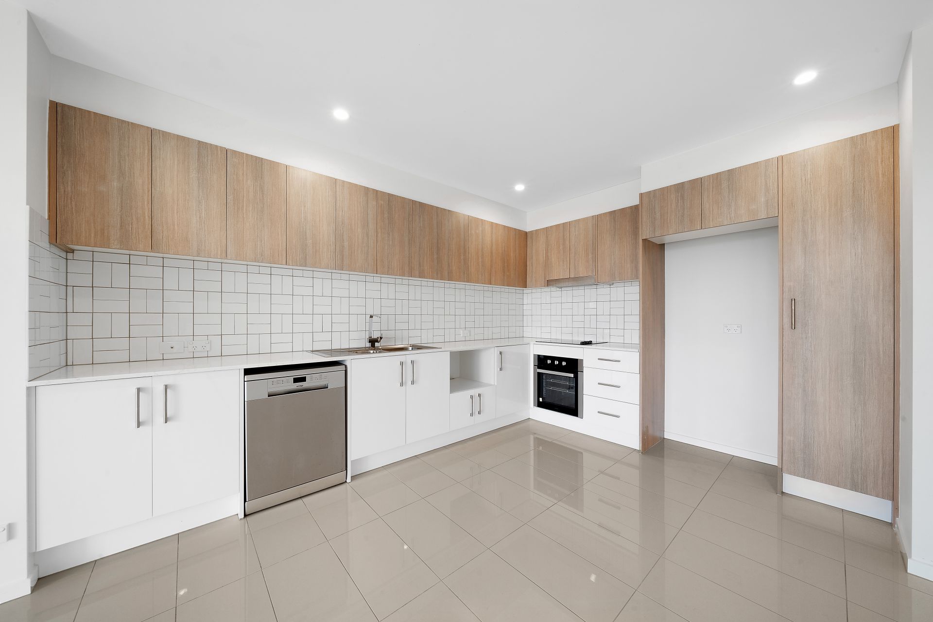> The kitchen is open with the living area is lit by an abundance of natural light and flowing seamlessly to the entertainment balcony. The kitchen has been finished with stone benches, Omega electric stainless-steel oven, Omega electric glass cooktop, modern two-tone cabinetry, subway tile splashback, plenty of cupboards and tiled floorings