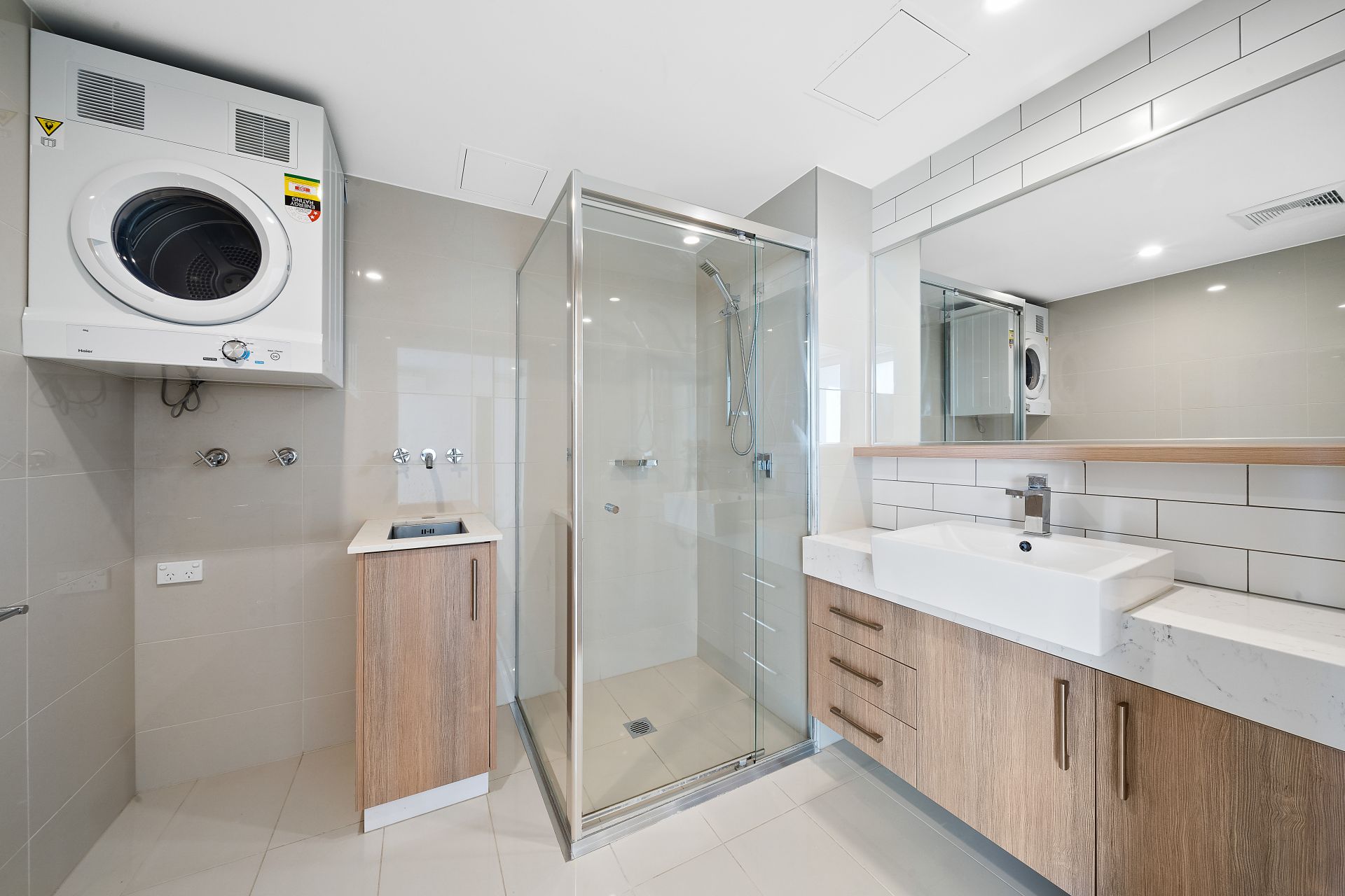 - The main bathroom features an ensuite with a walk-in shower, adjustable shower rose, single vanity with stone benches, large mirror and under bench storage, laundry tub and dryer