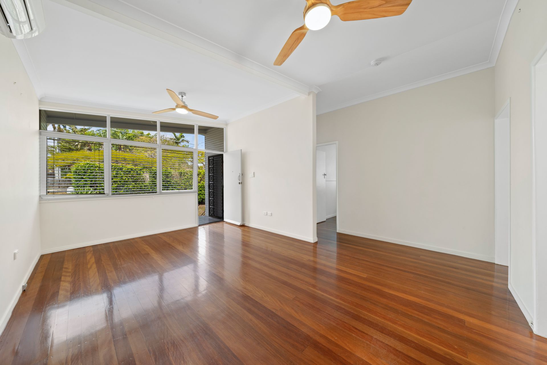 > The living area features a stunning vaulted ceiling allowing for natural light in spades. The large flexible space features ceiling fans, a split-system air conditioner, blinds and direct access to the front patio and a security screen door.