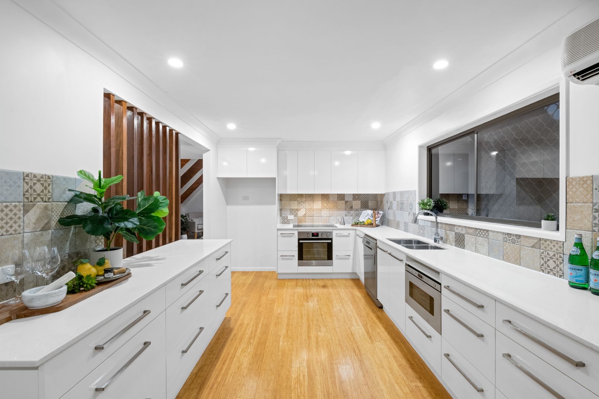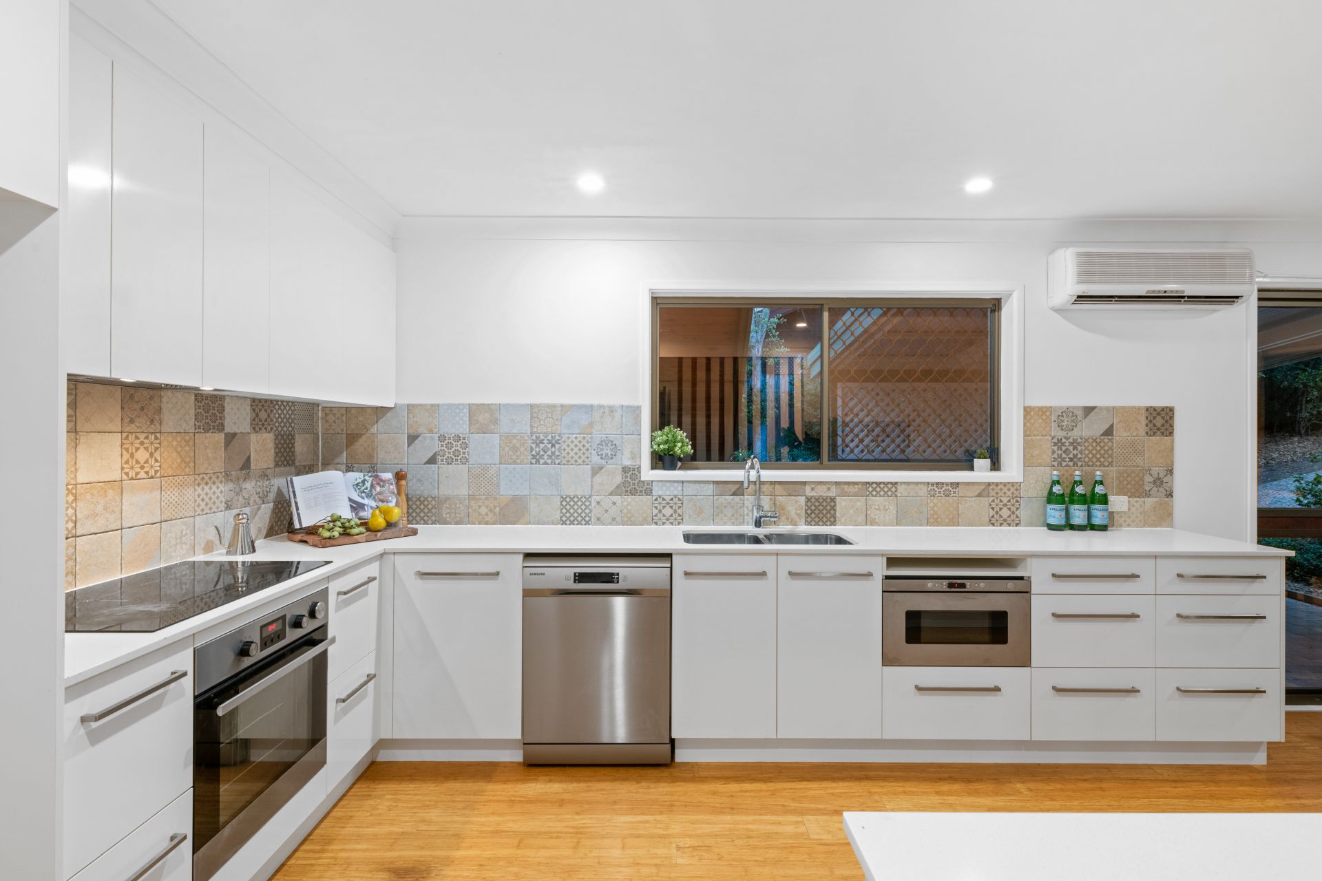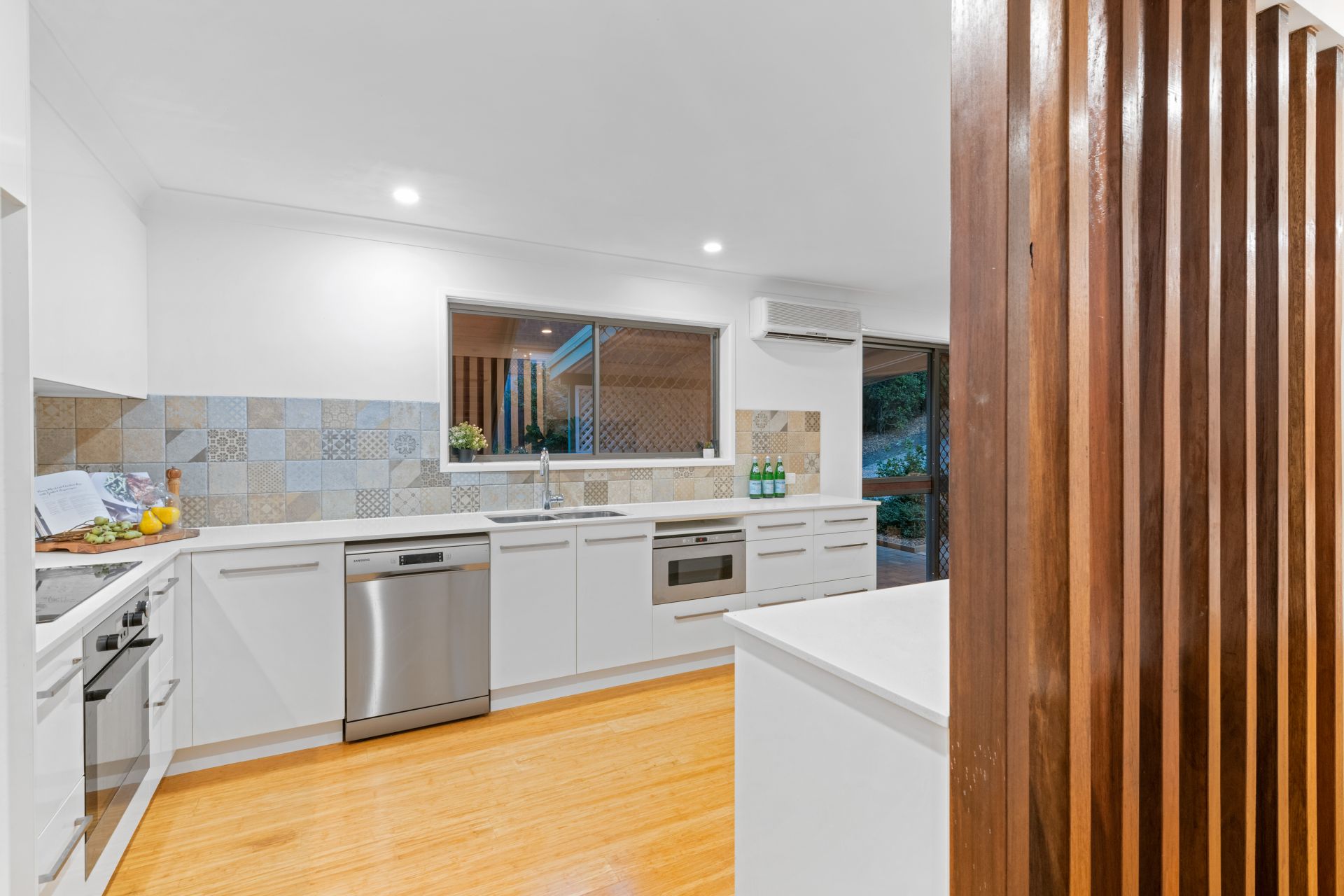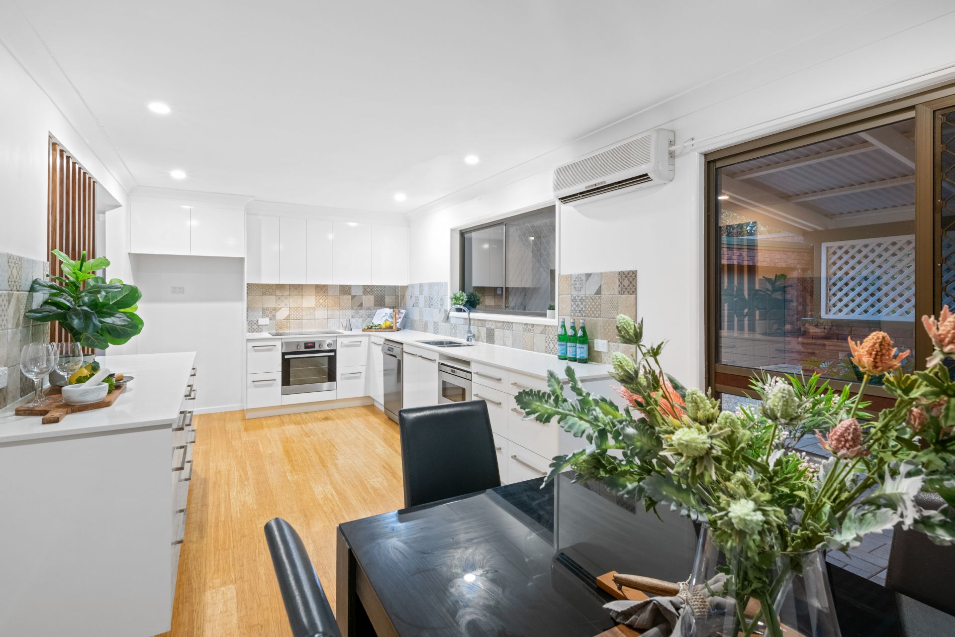 - Dining area shares an open space adjacent the home's magnificent kitchen and features polished bamboo flooring, split system air-conditioning and access to the front covered courtyard.