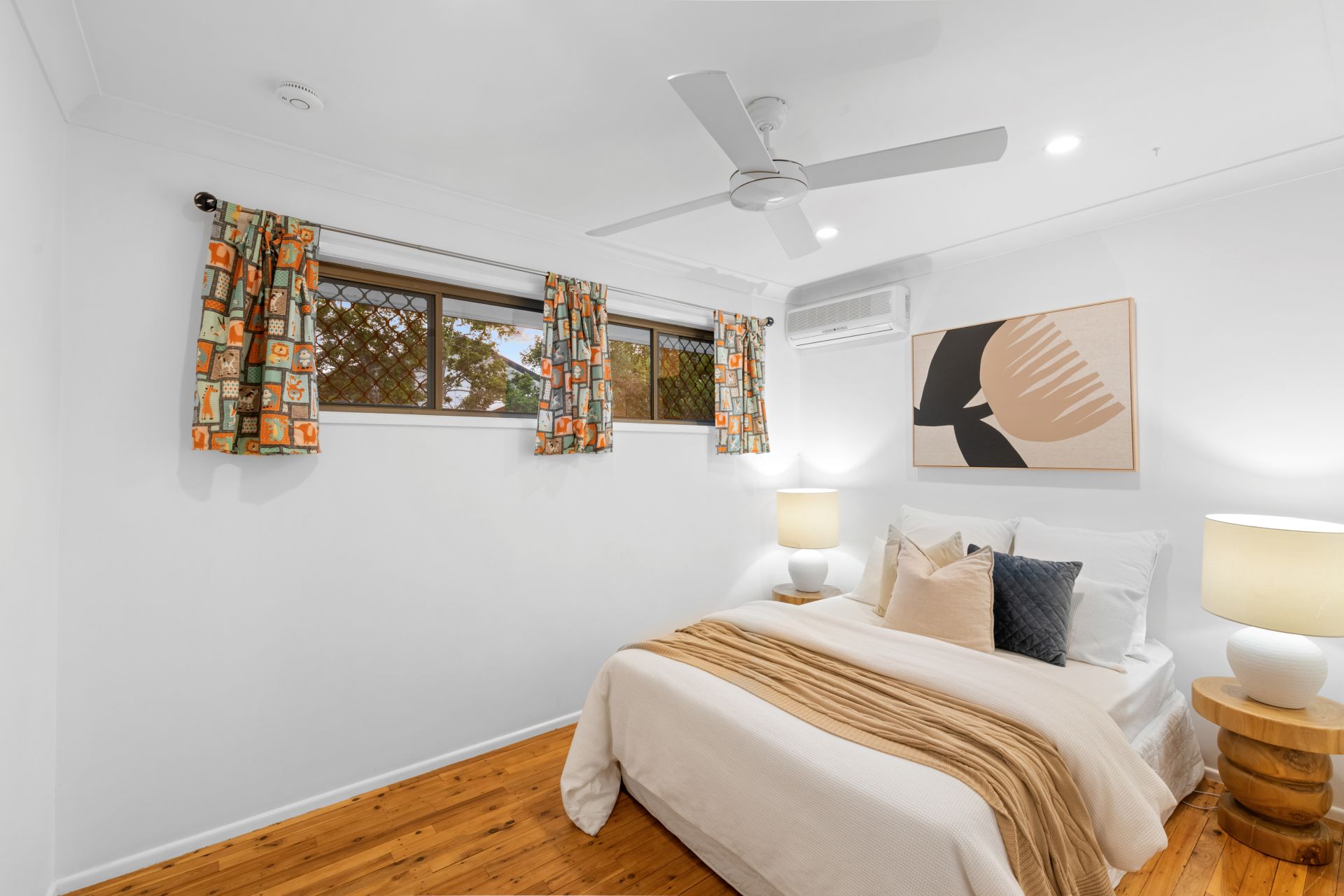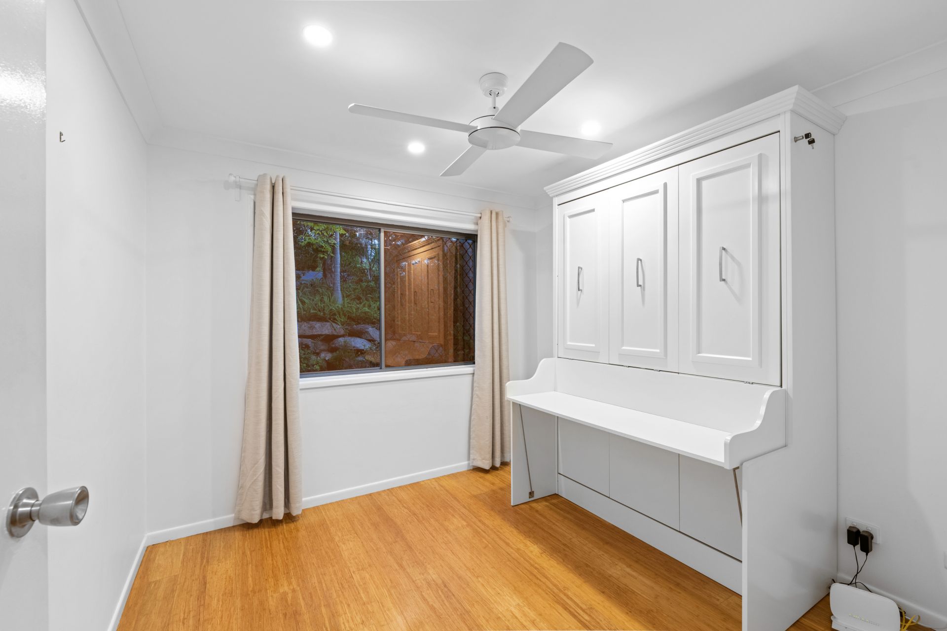 - Bedroom three is conveniently located on the ground floor. Overlooking the leafy front yard, it functions perfectly as a home office or bedroom, featuring polished bamboo flooring, split system air-conditioning, ceiling fan and custom desk/wall retracting bed providing the best of both worlds.