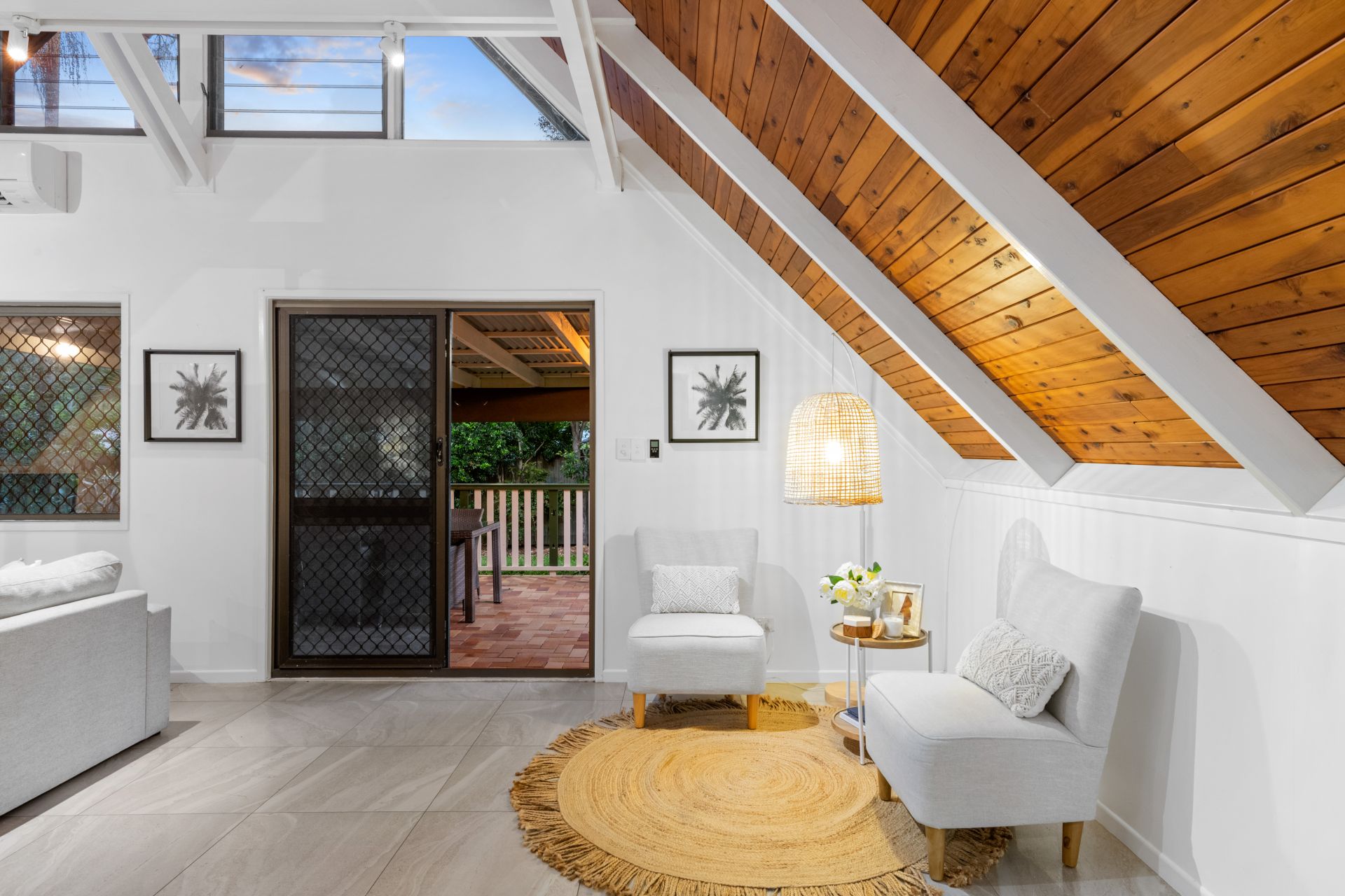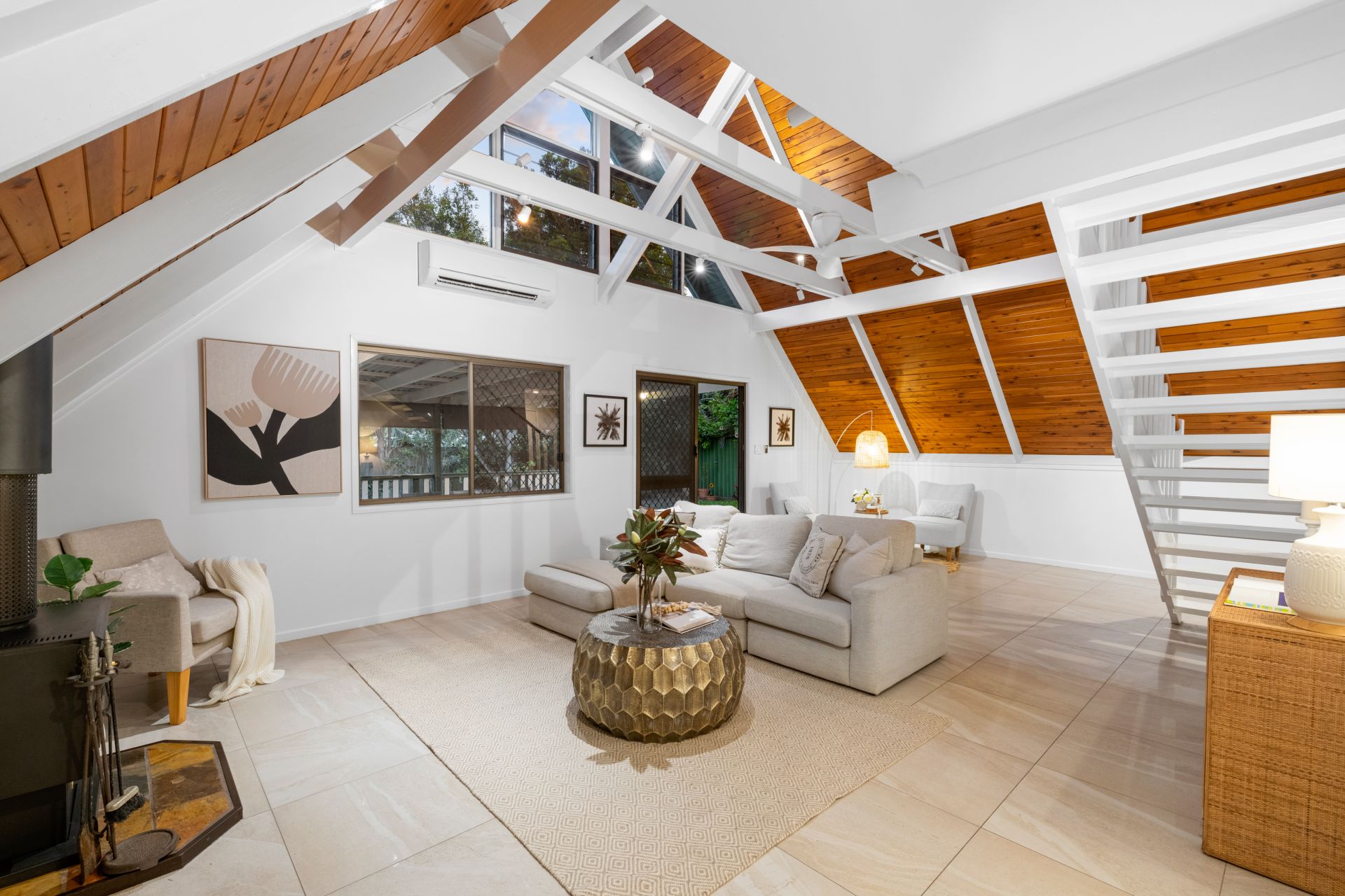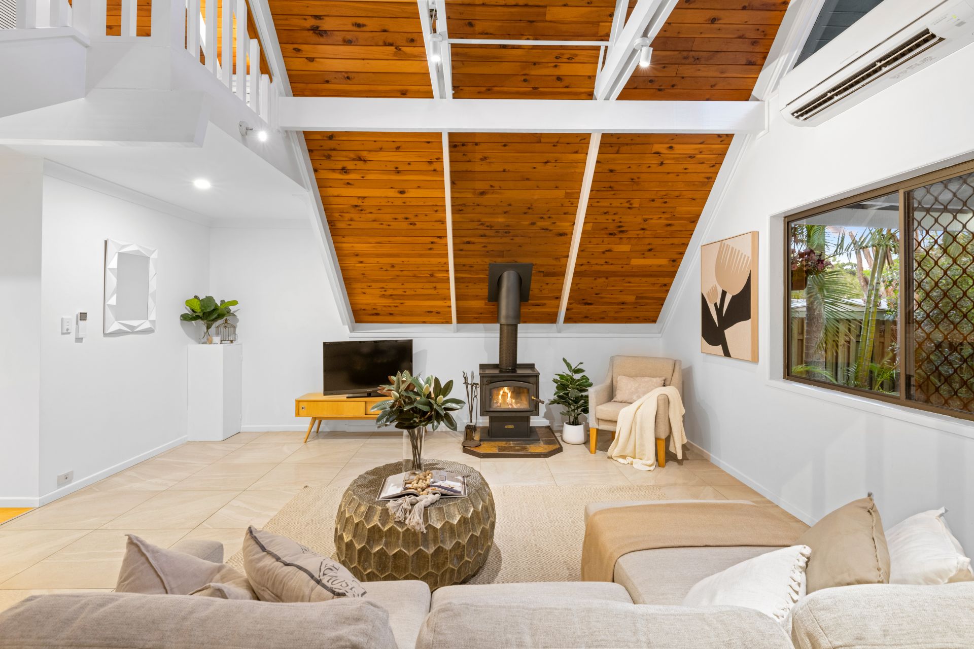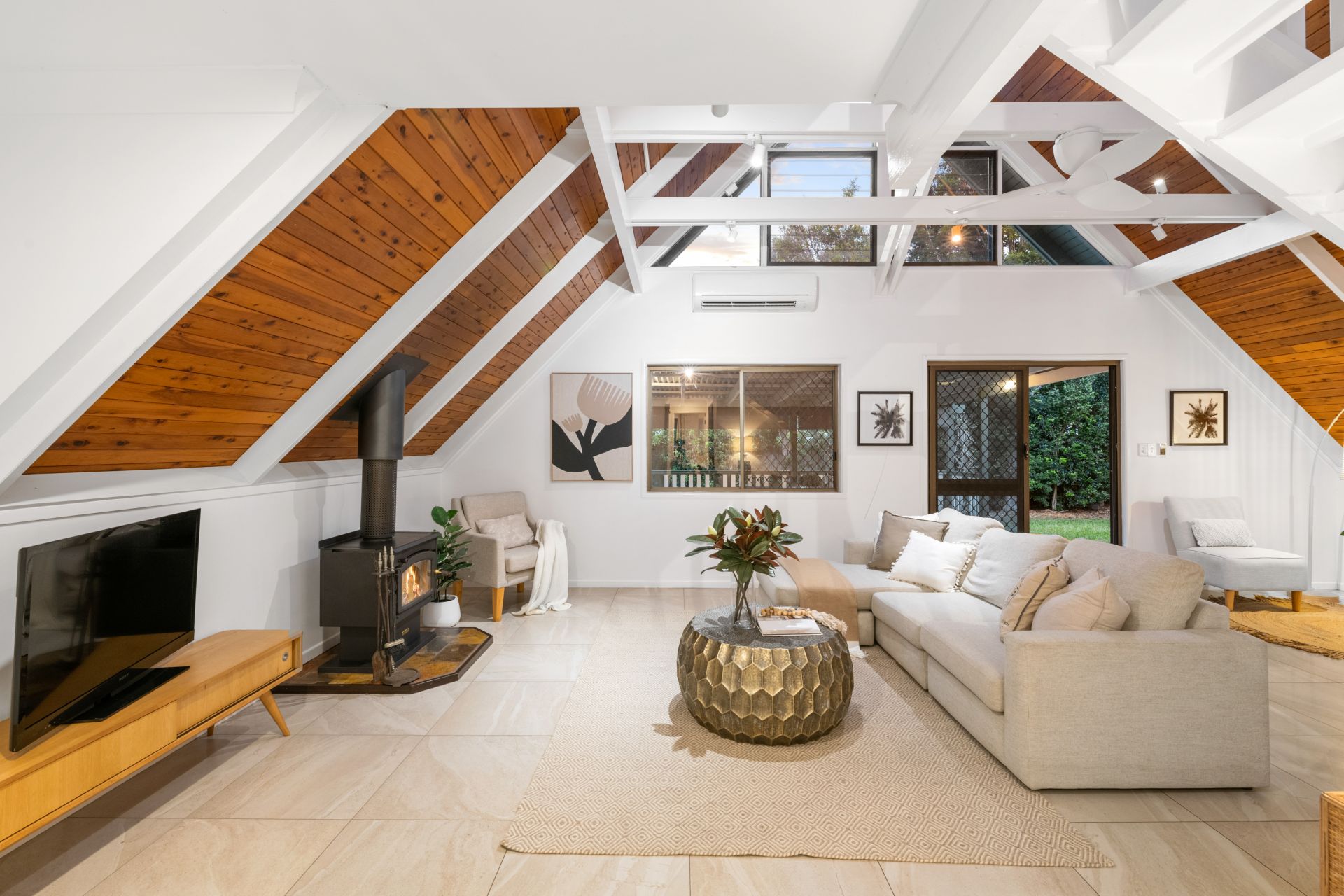 - The stunning living room looks out over the private back patio and features tiled flooring, soaring 5.6m high cathedral ceiling, split system air-conditioning, ceiling fan, pot belly fireplace and access to the backyard and outdoor entertaining area.