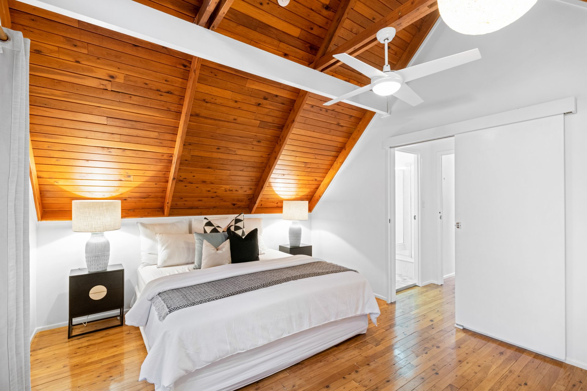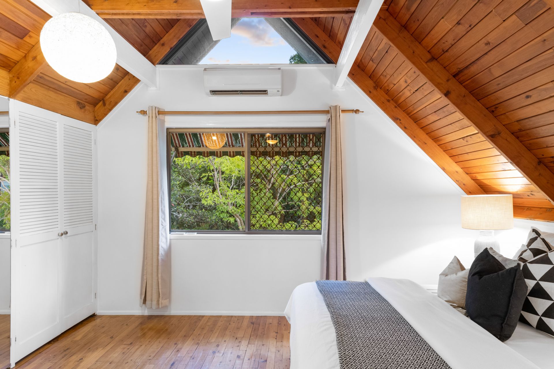 - Bedroom one is the homes beautiful master bedroom located on the upper level. This large bedroom features polished timber flooring, stunning cathedral ceiling, split system air-conditioning, ceiling fan and large built-in-robe.