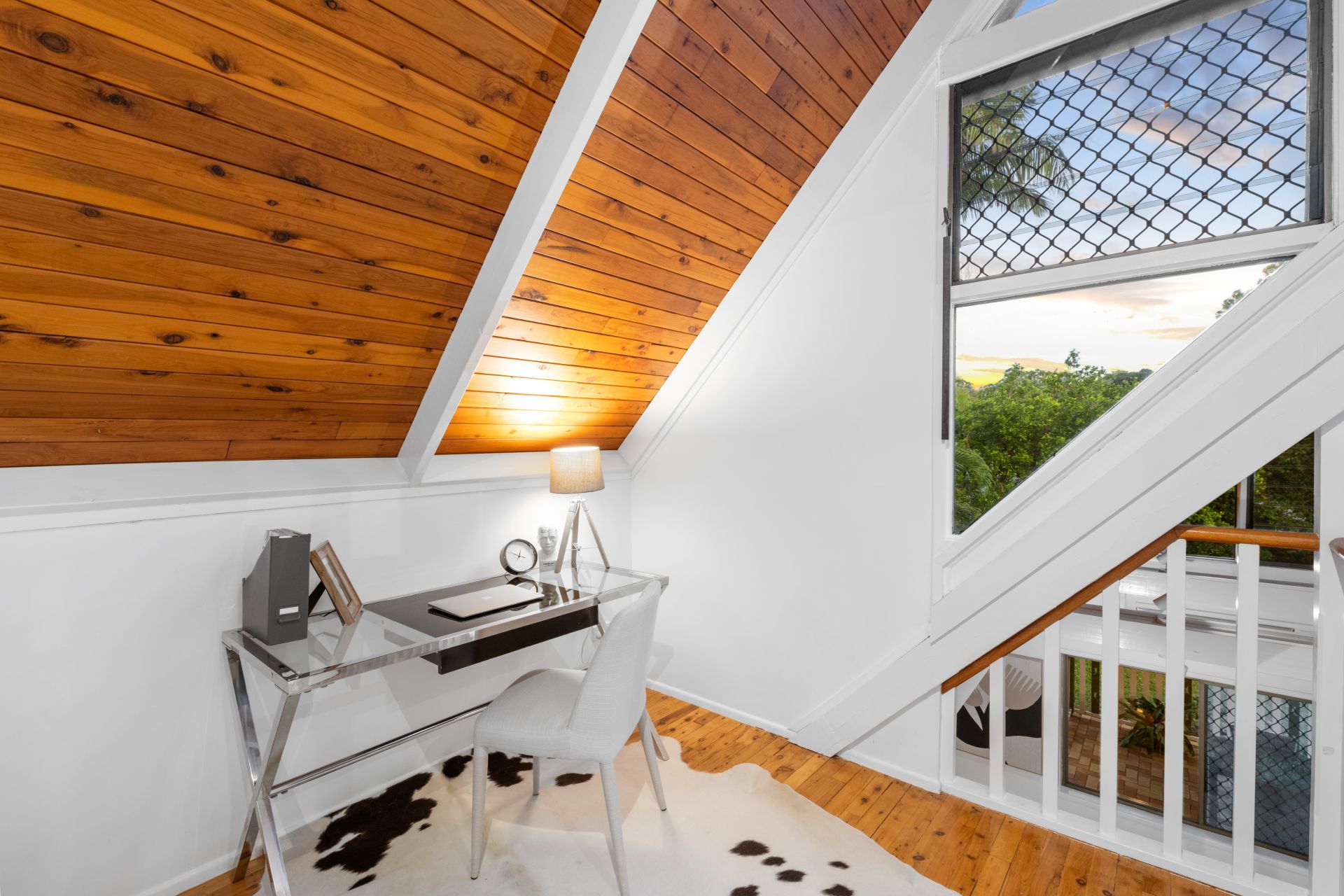 - Study nook located at the top of the stairs features polished bamboo flooring, raked ceiling and good storage.