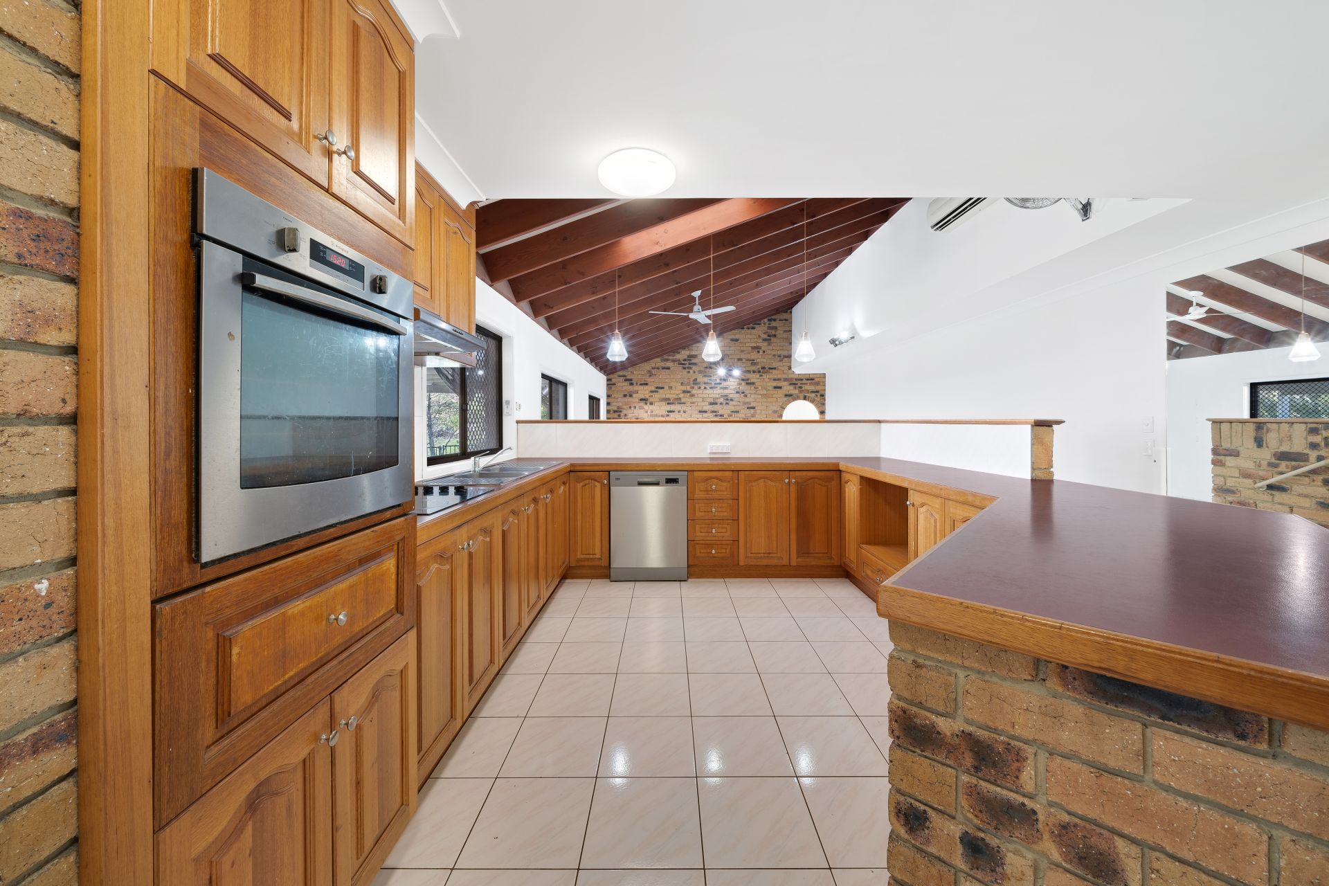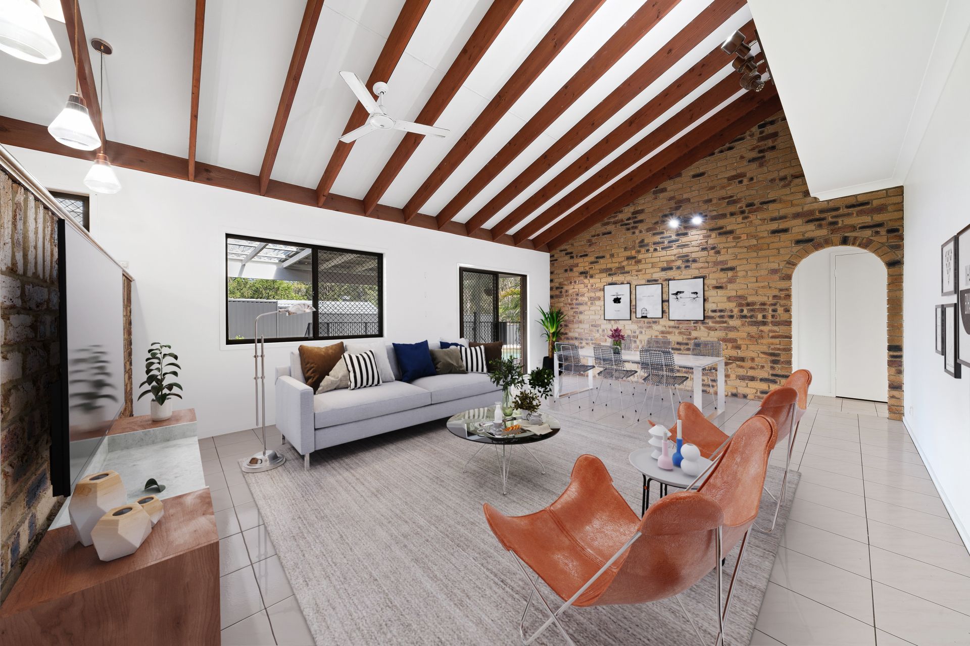 > Living and dining area feature a stunning raked ceiling with skylight, split-system air-conditioner, feature brick wall, ceiling fan and access to the large covered outdoor area overlooking the swimming pool