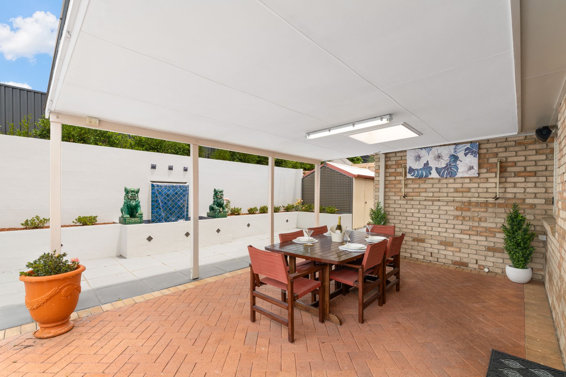 - The covered outdoor entertaining area is very private and the perfect place to relax and unwind. Surrounded by low maintenance garden beds and a tranquil waterfall, it also features lighting, power outlets and a convenient wall-mounted fold-down clothesline.