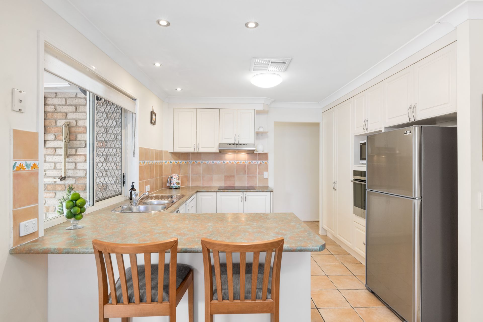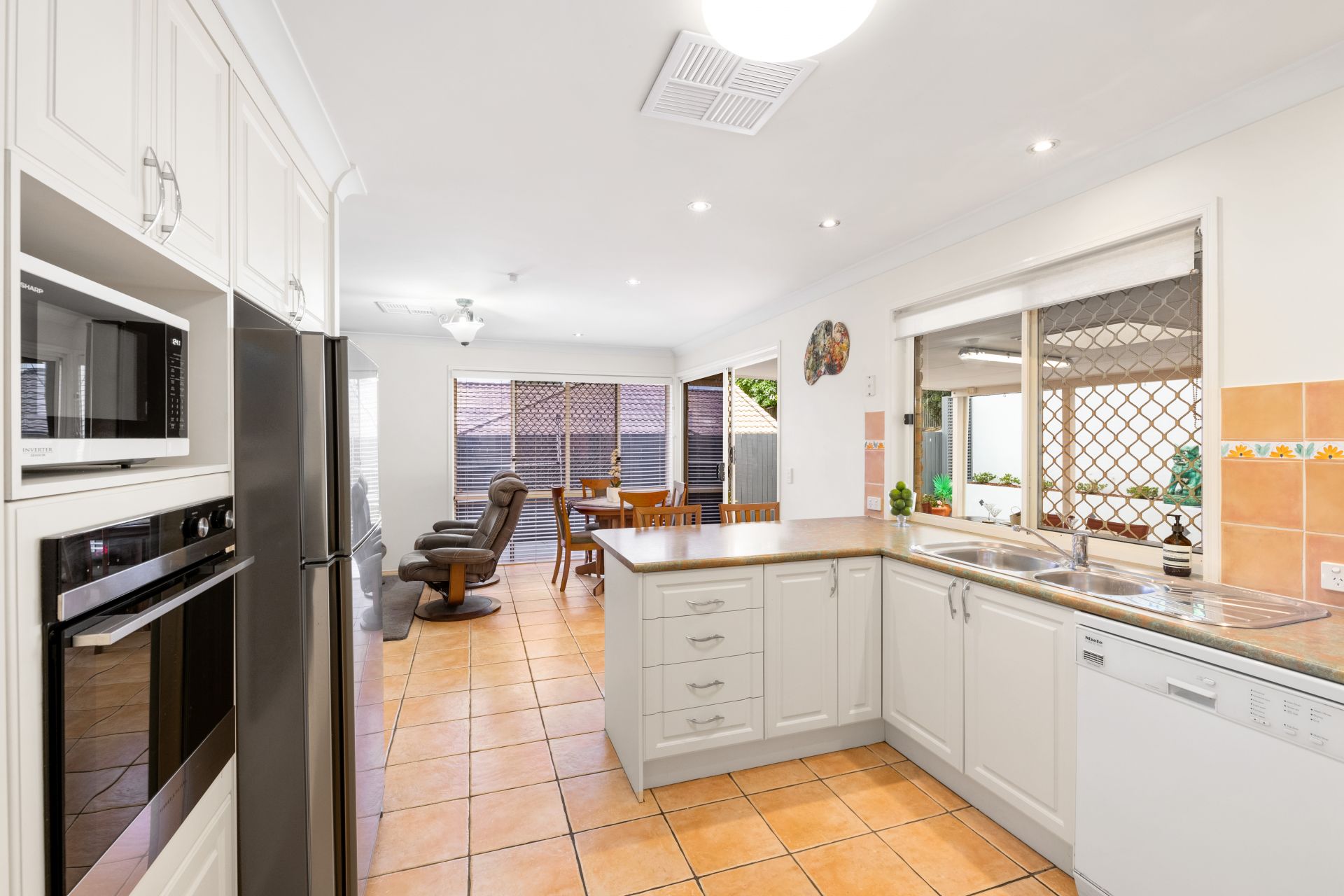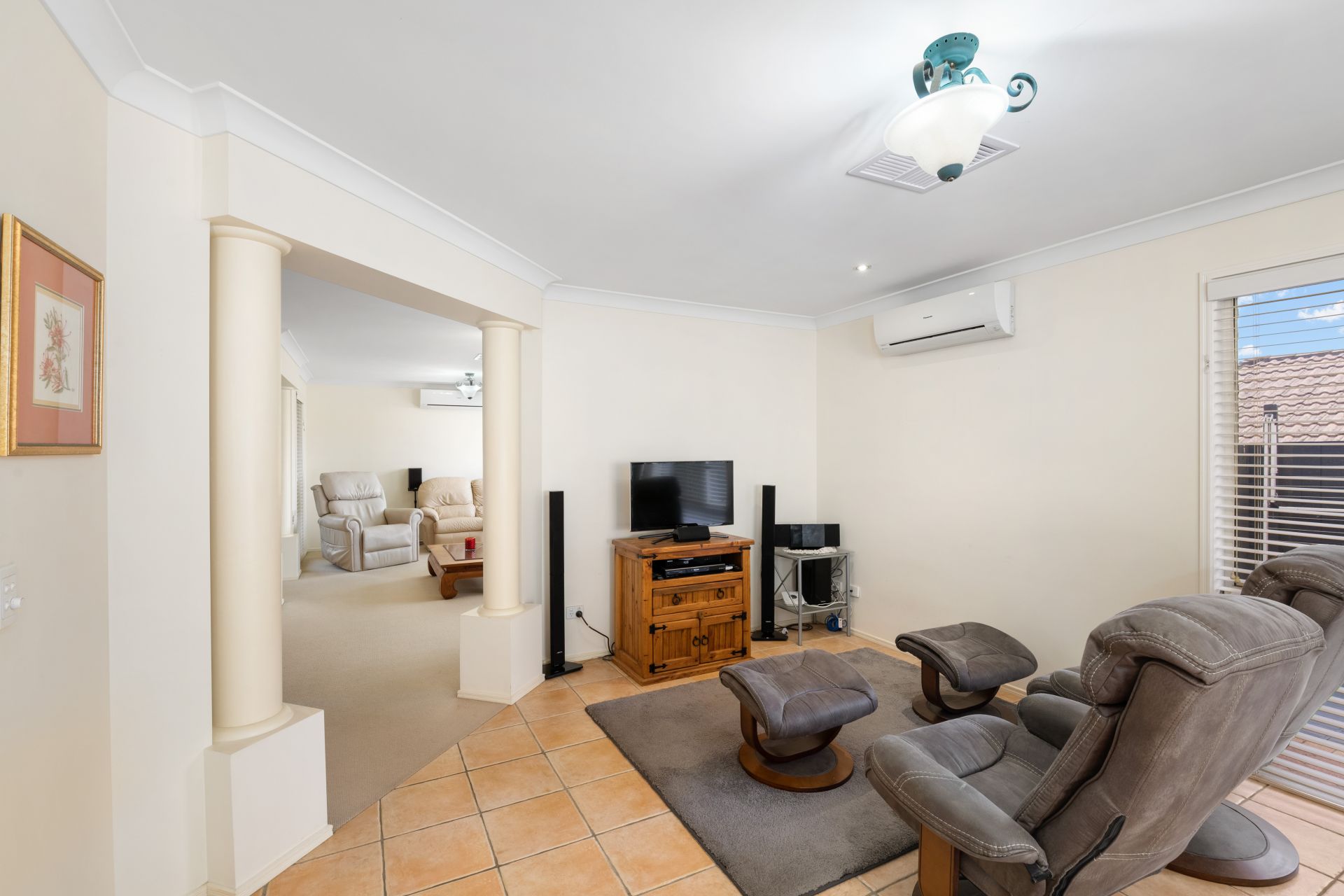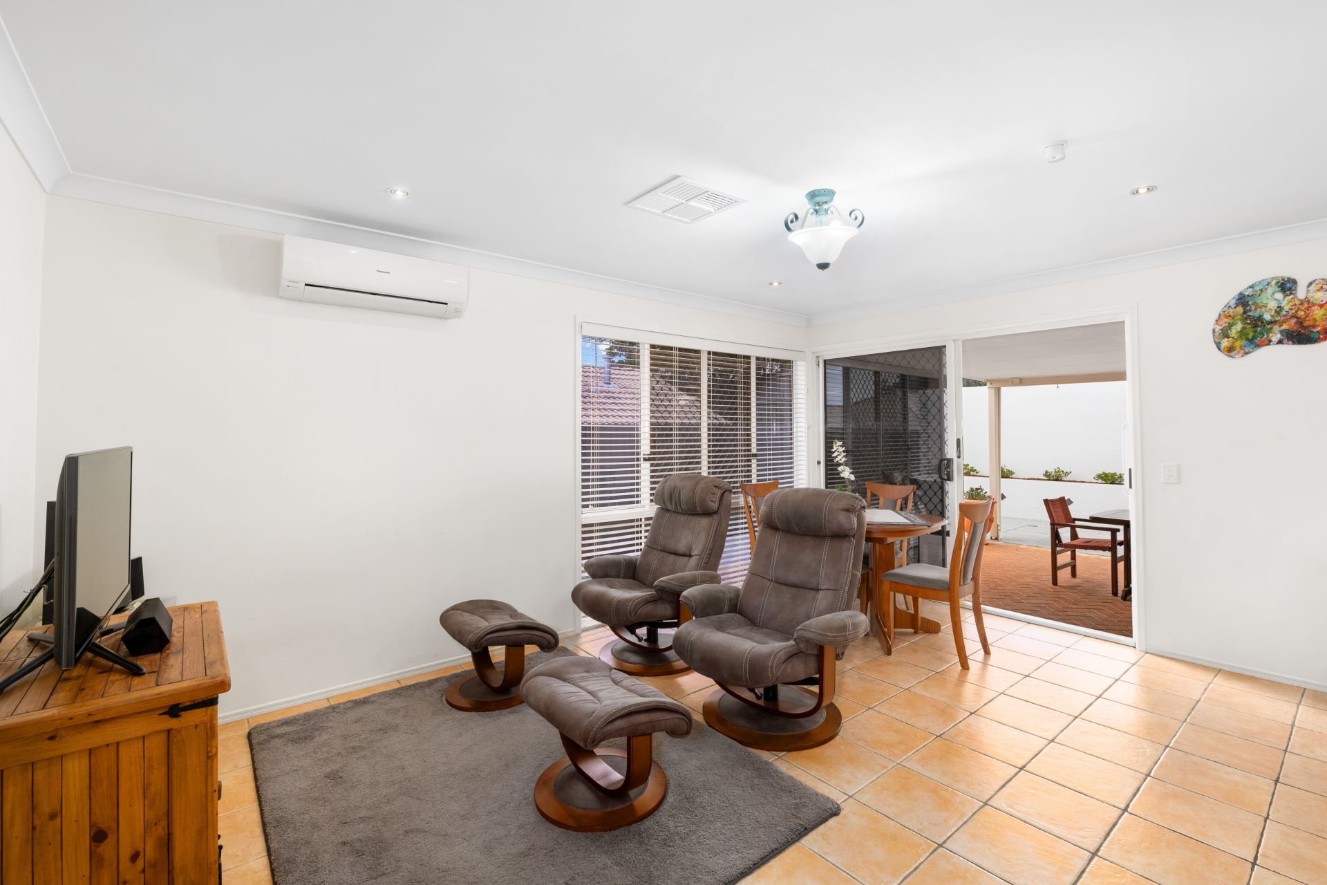 - The living room and meals area is conveniently located beside the homes kitchen and features tiled flooring, split system air-conditioning and access to the covered outdoor entertaining area.