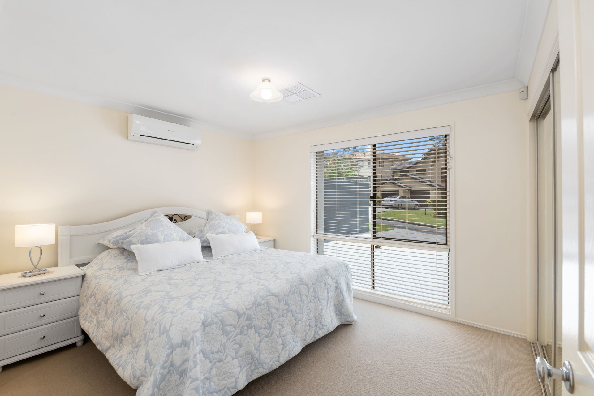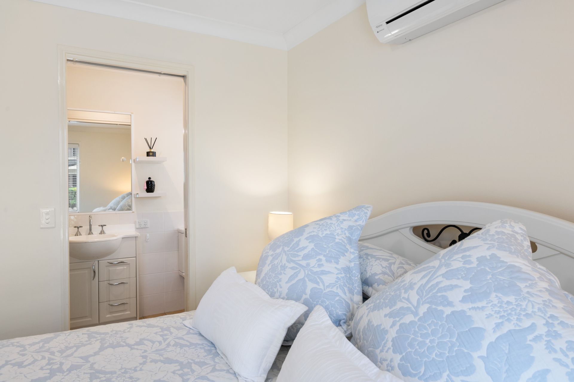 - Bedroom one is the homes master bedroom. This large bedroom features carpeted flooring, ensuite, walk-in-robe with mirrored doors and split system air-conditioning.