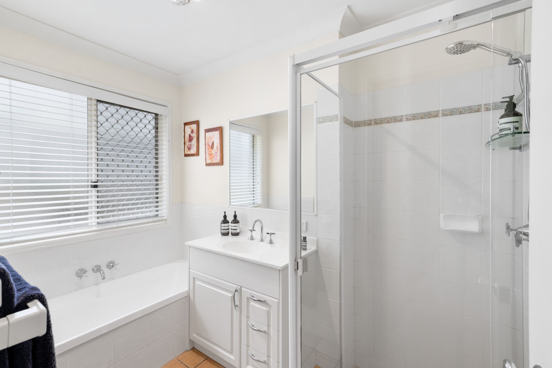 - Bathroom one is the homes main bathroom and features tiled flooring, shower, bath, single vanity and separate toilet.