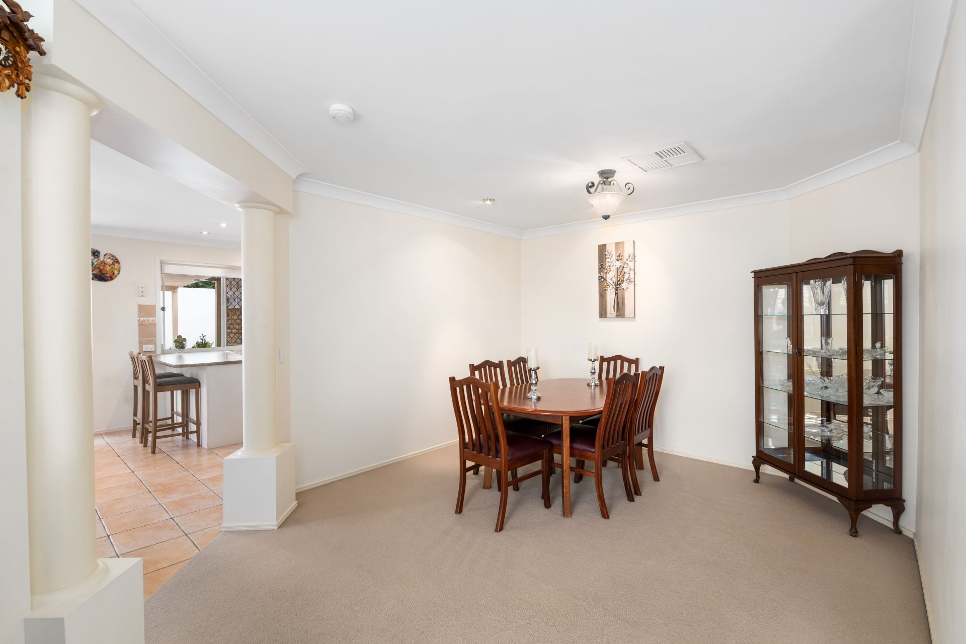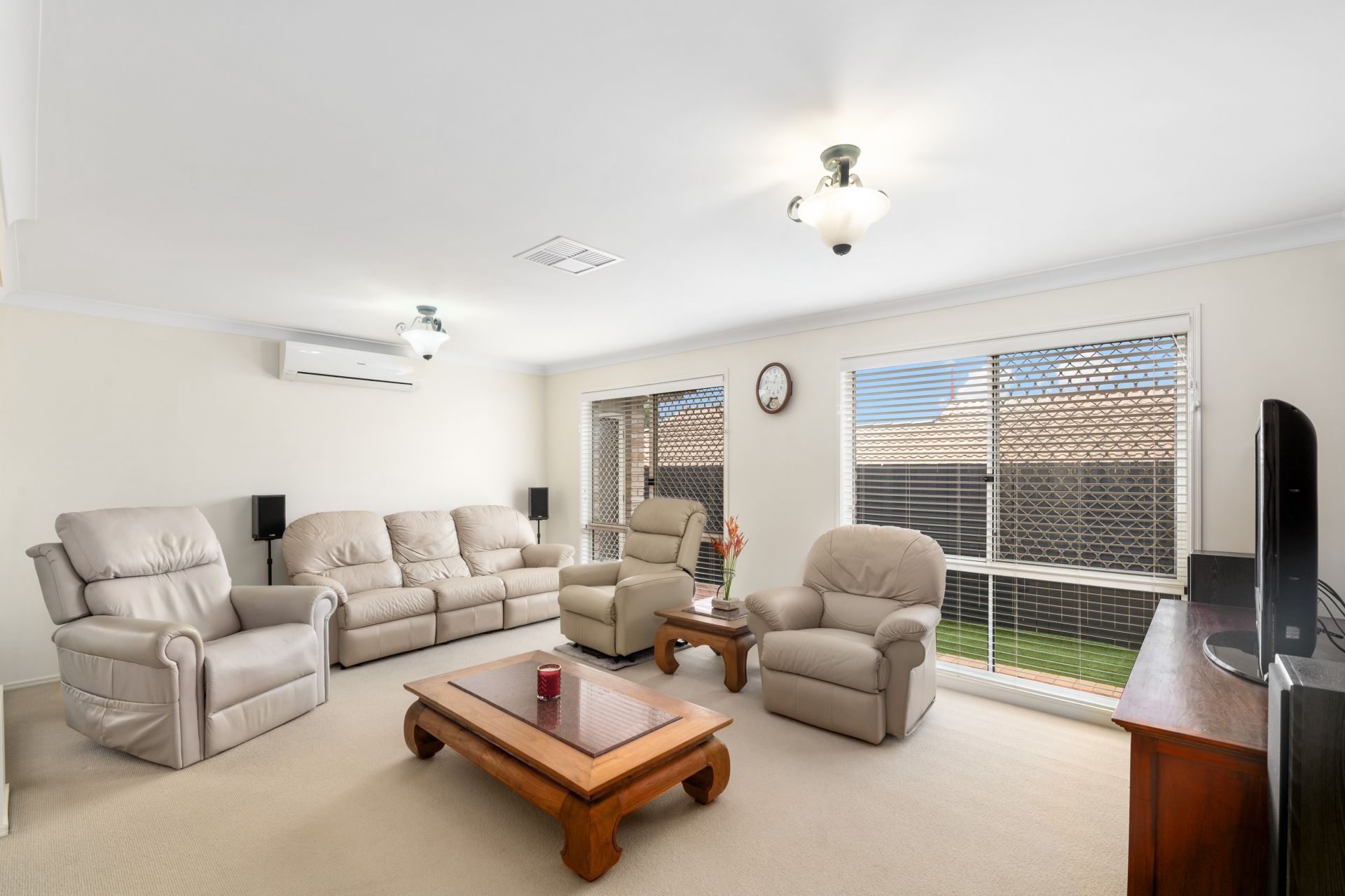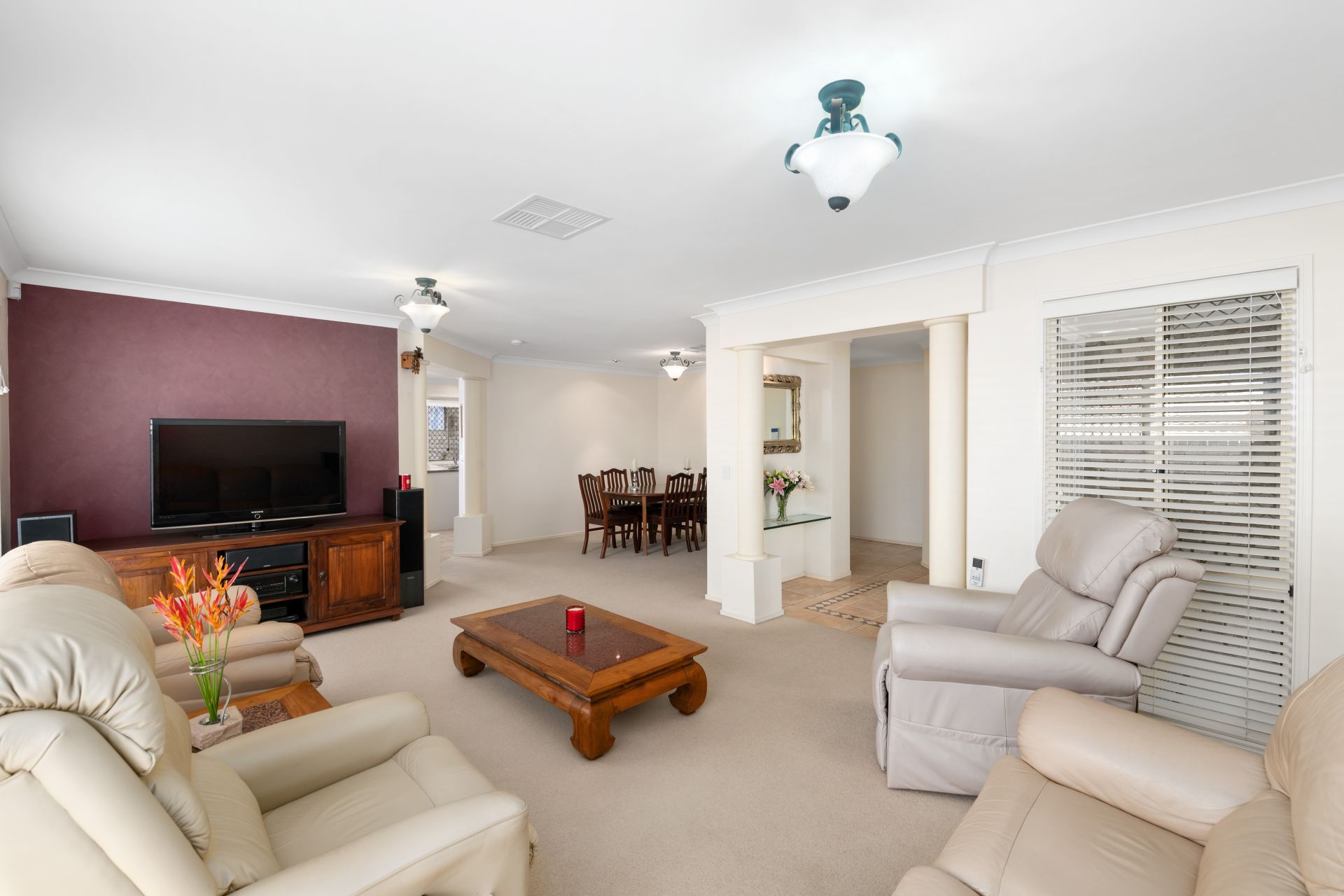 - Formal lounge room and dining share a large open space at the front of the home and features carpeted flooring and split system air-conditioning.