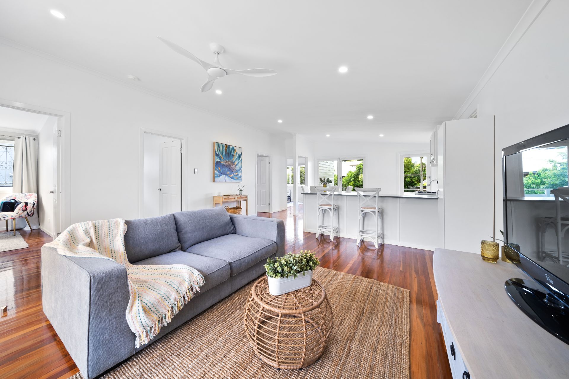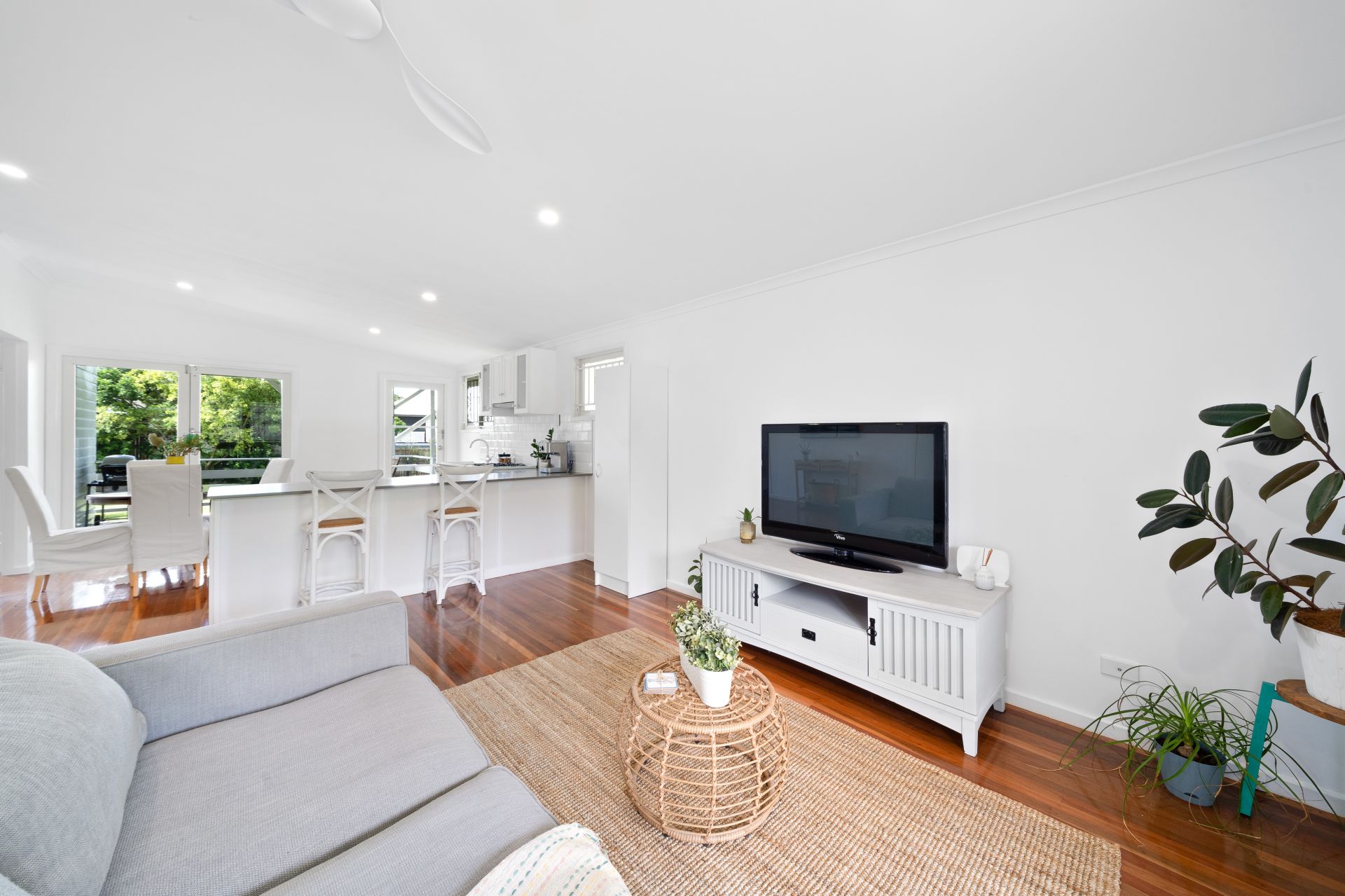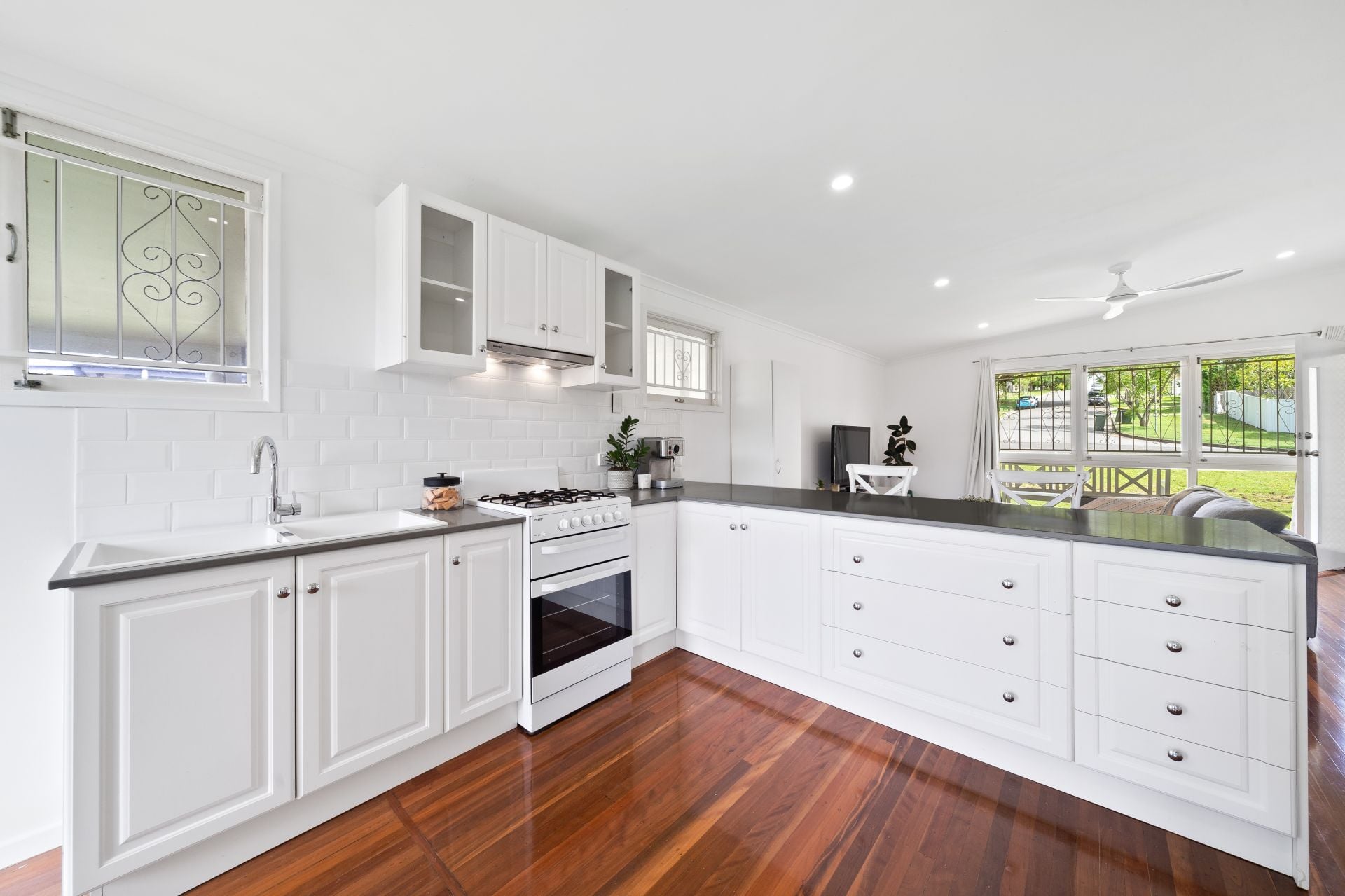 > The living area flows effortlessly to the kitchen/dining and through to the rear deck. Featuring raked ceiling, polished timber flooring, down-lighting, casement and fixed windows, security bars, curtains, and with access to the front porch a seamless flow of living space.