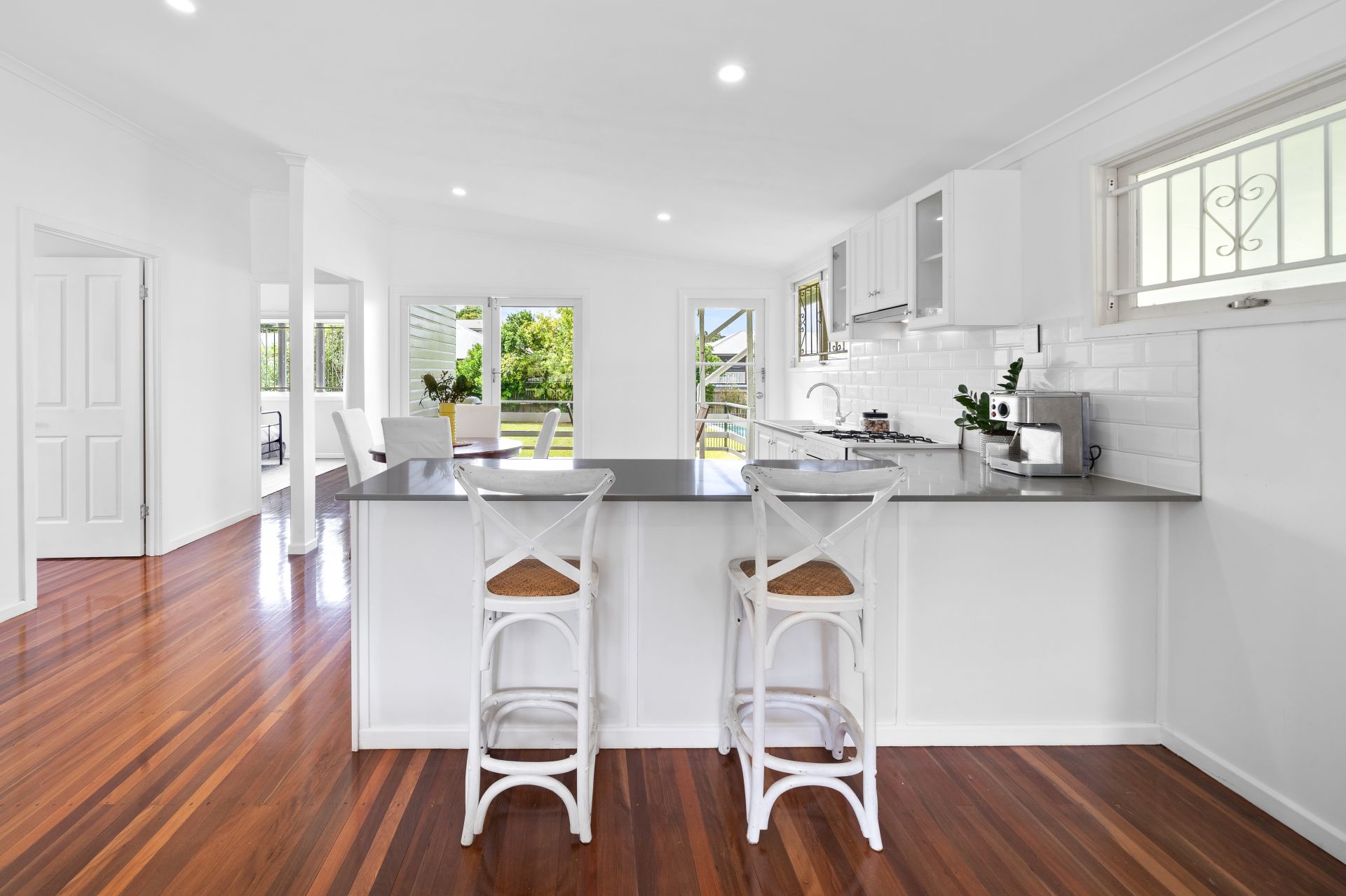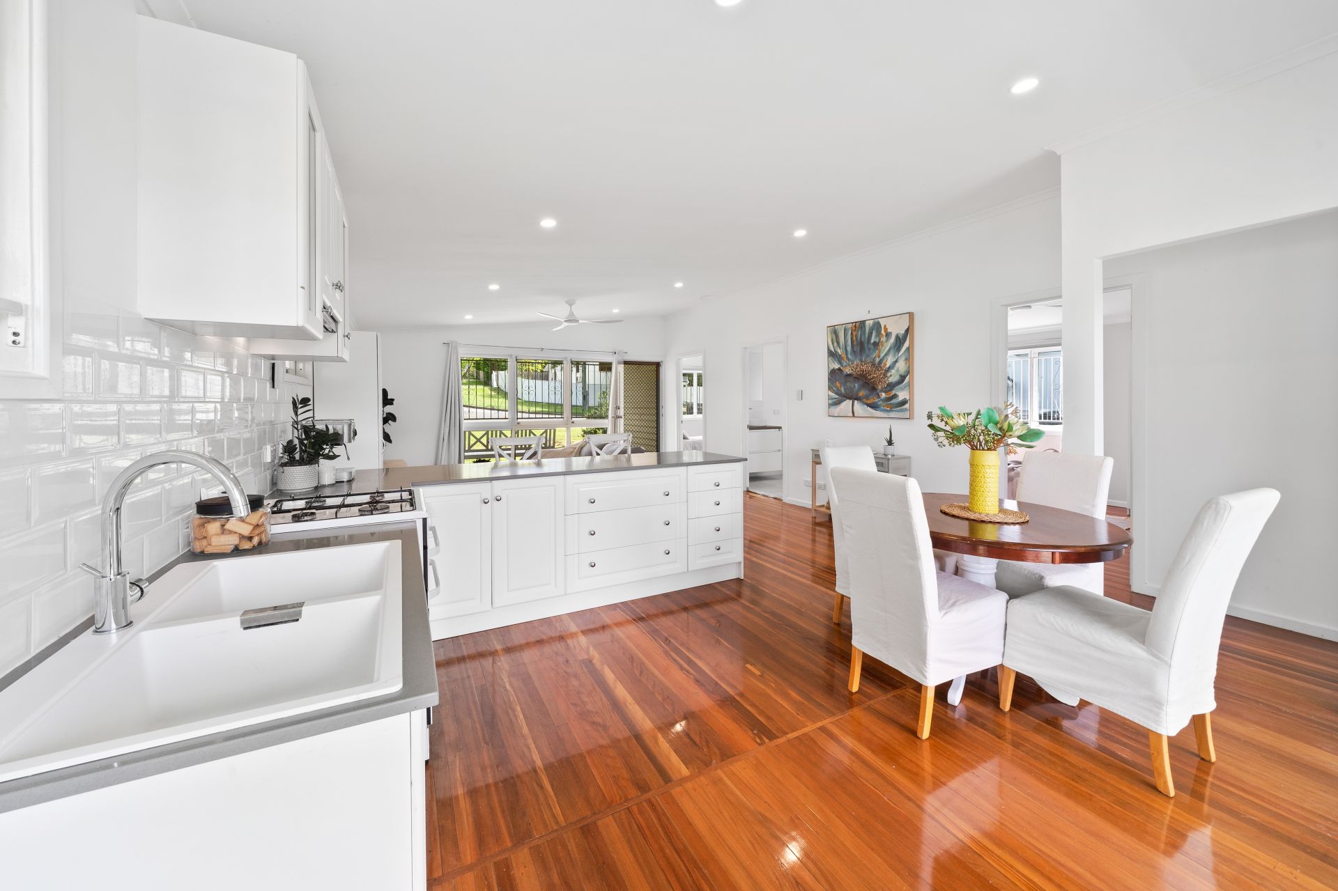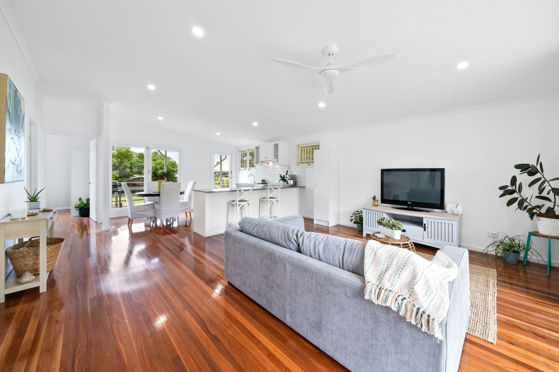 > The living area flows effortlessly to the kitchen/dining and through to the rear deck. Featuring raked ceiling, polished timber flooring, down-lighting, casement and fixed windows, security bars, curtains, and with access to the front porch a seamless flow of living space.