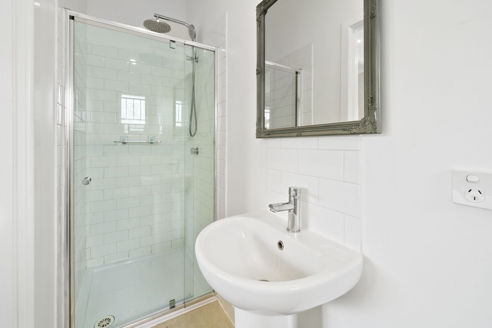 > The master ensuite features shower with raindrop and detachable showerheads, shelf, single pedestal basin, wall mounted mirror, tile splashback, down-lighting, heater, casement window with frosted glass and security bars, tile flooring, and toilet.