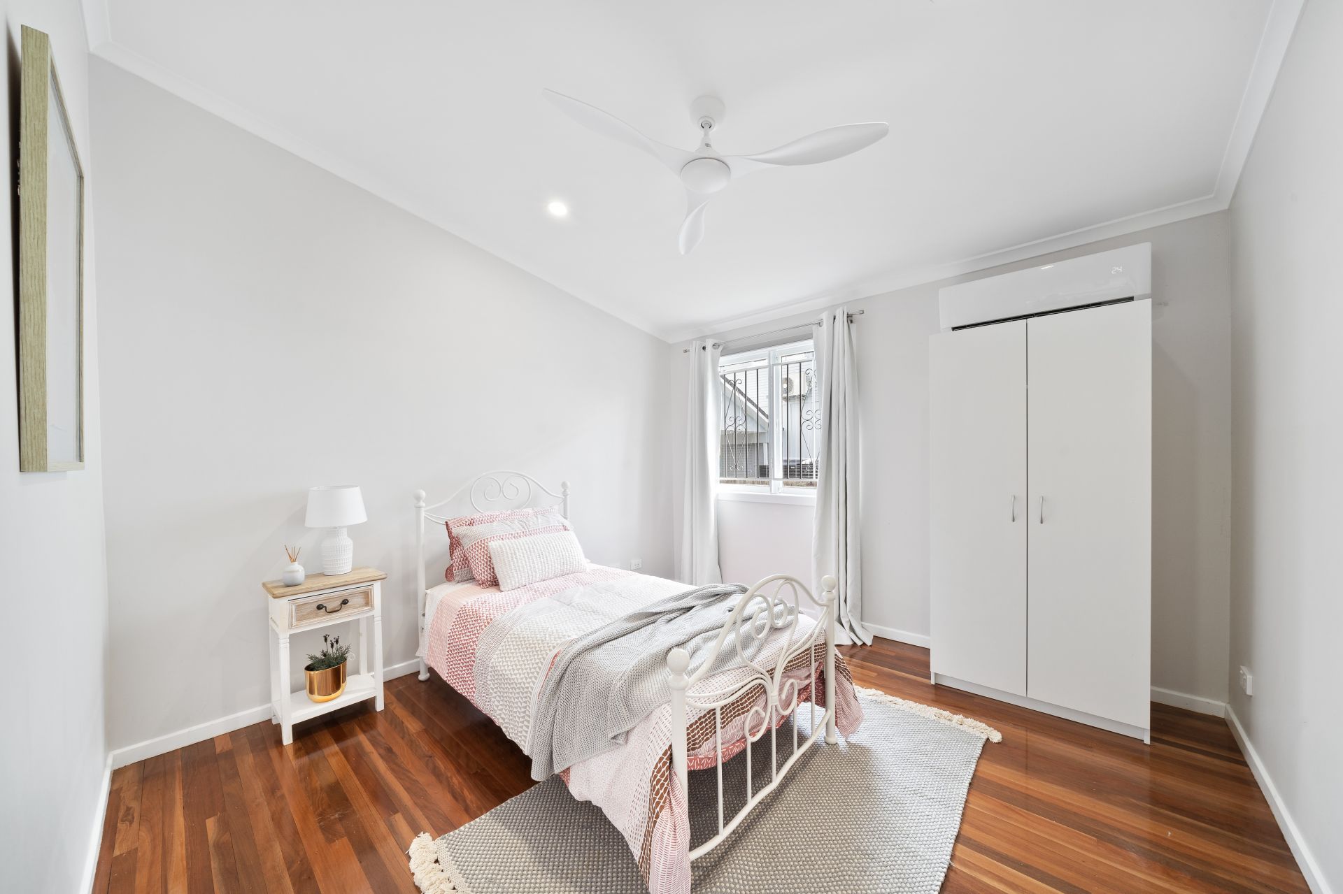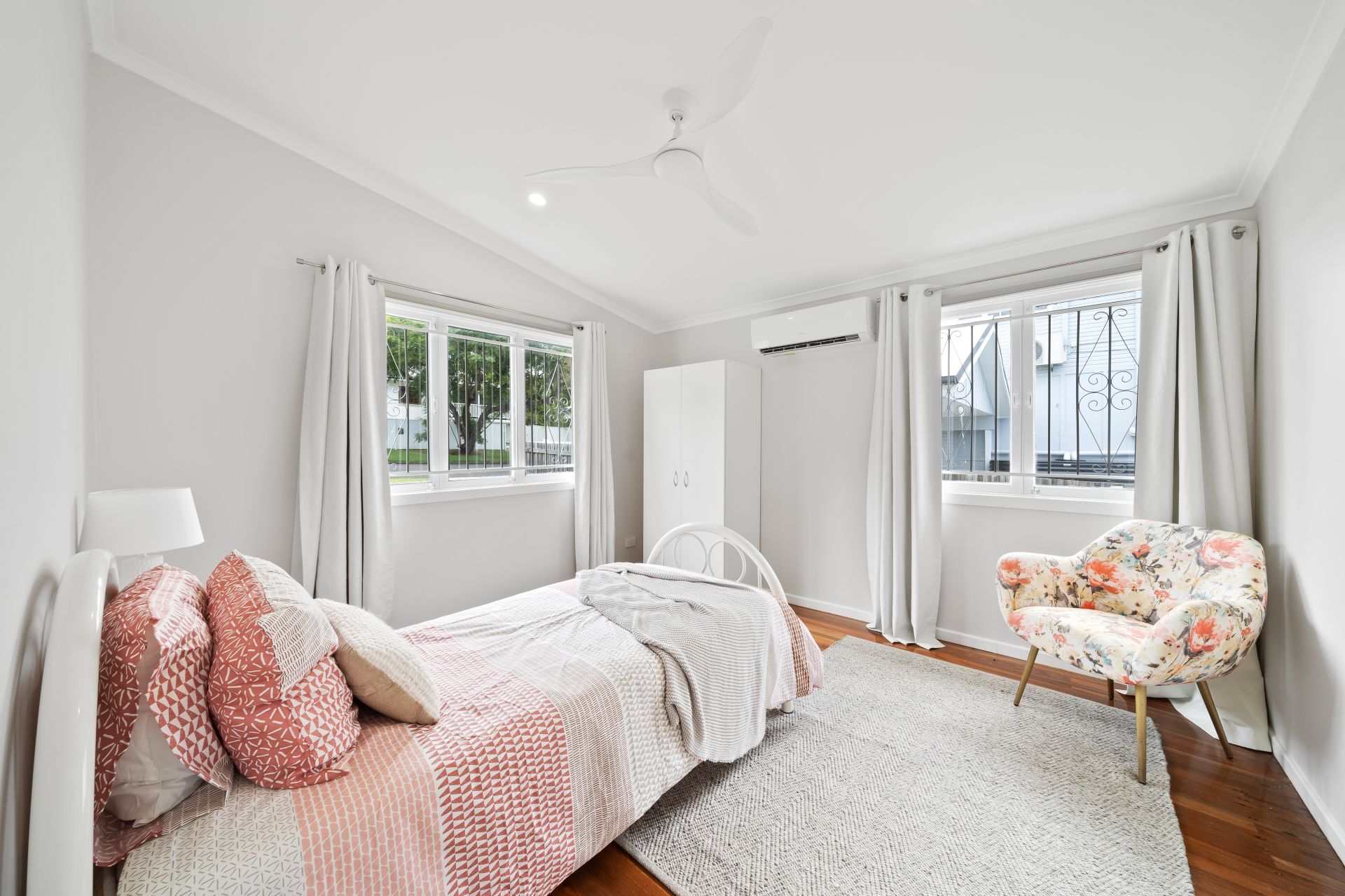 > Bedrooms 2 and 3 feature polished timber flooring, raked ceilings, Gree split system air-conditioning, casement windows with security bars, curtains, roller blinds, ceiling fans and down-lighting.