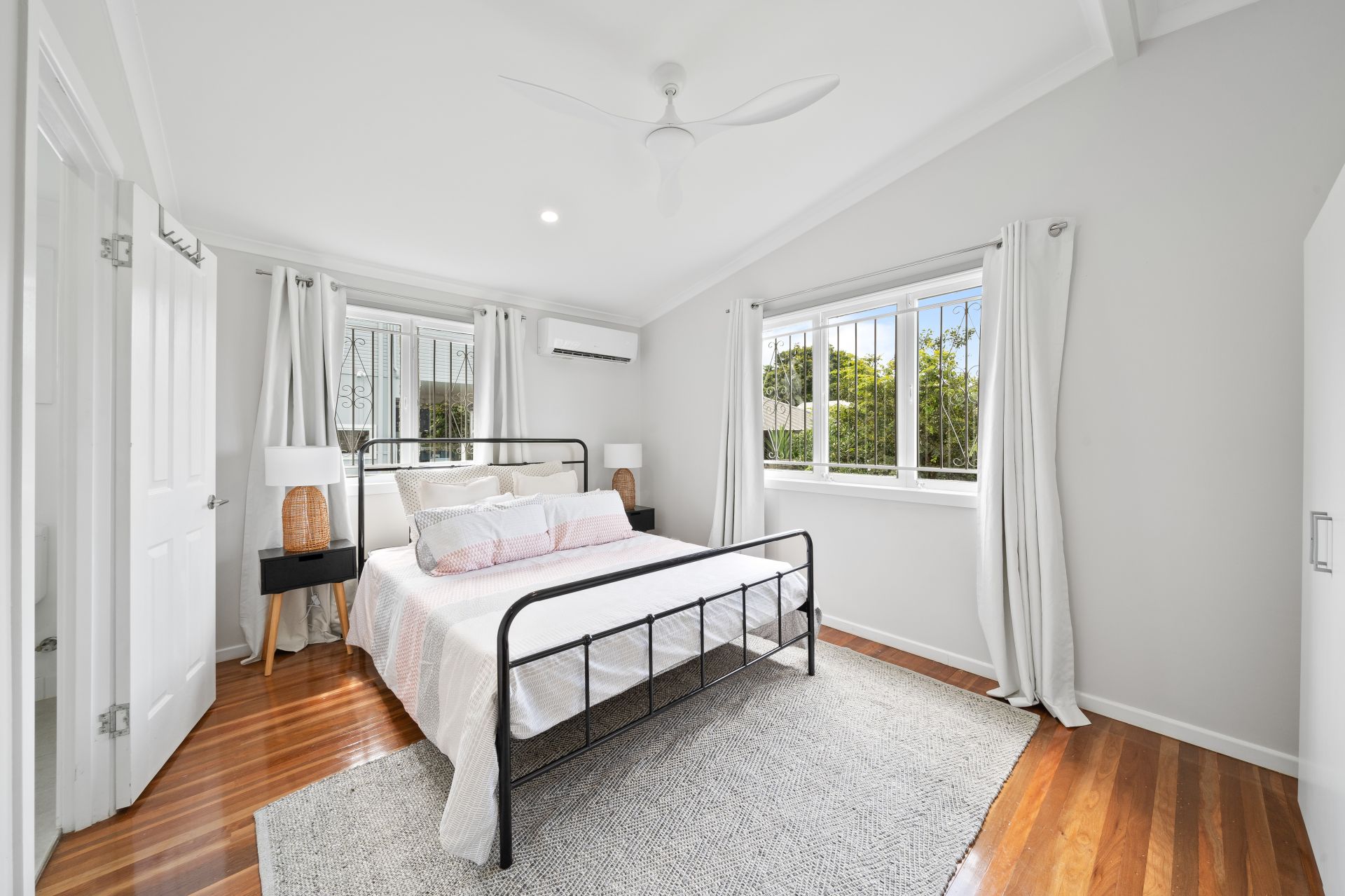 > Bedroom 1 master is a light-filled space offering Gree split system air-conditioning, polished timber flooring, raked ceiling, casement windows, security bars, curtains, roller blinds, ceiling fan, down-lighting and ensuite.