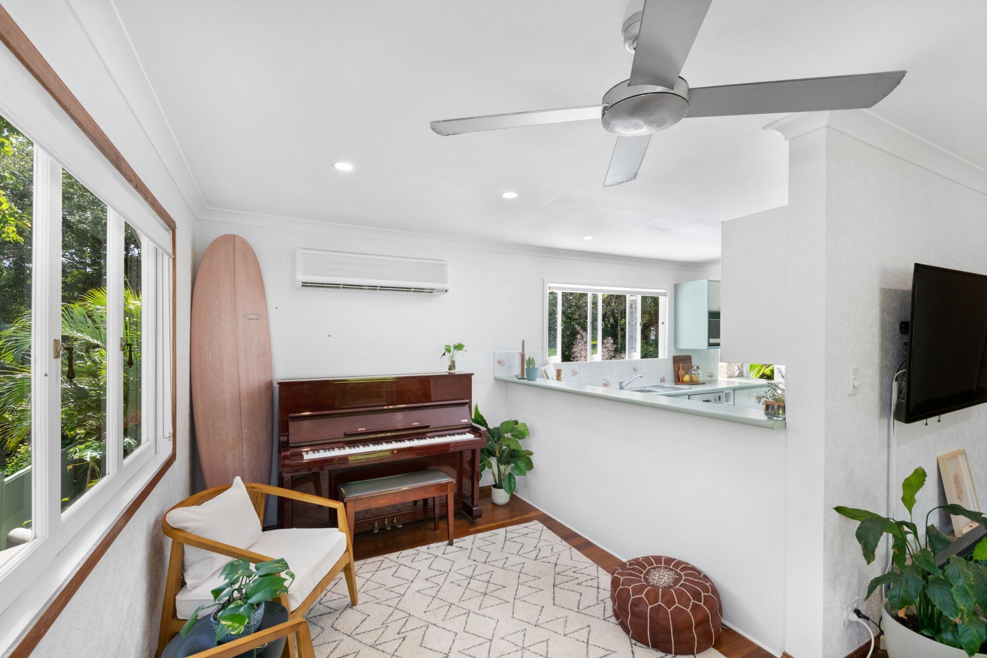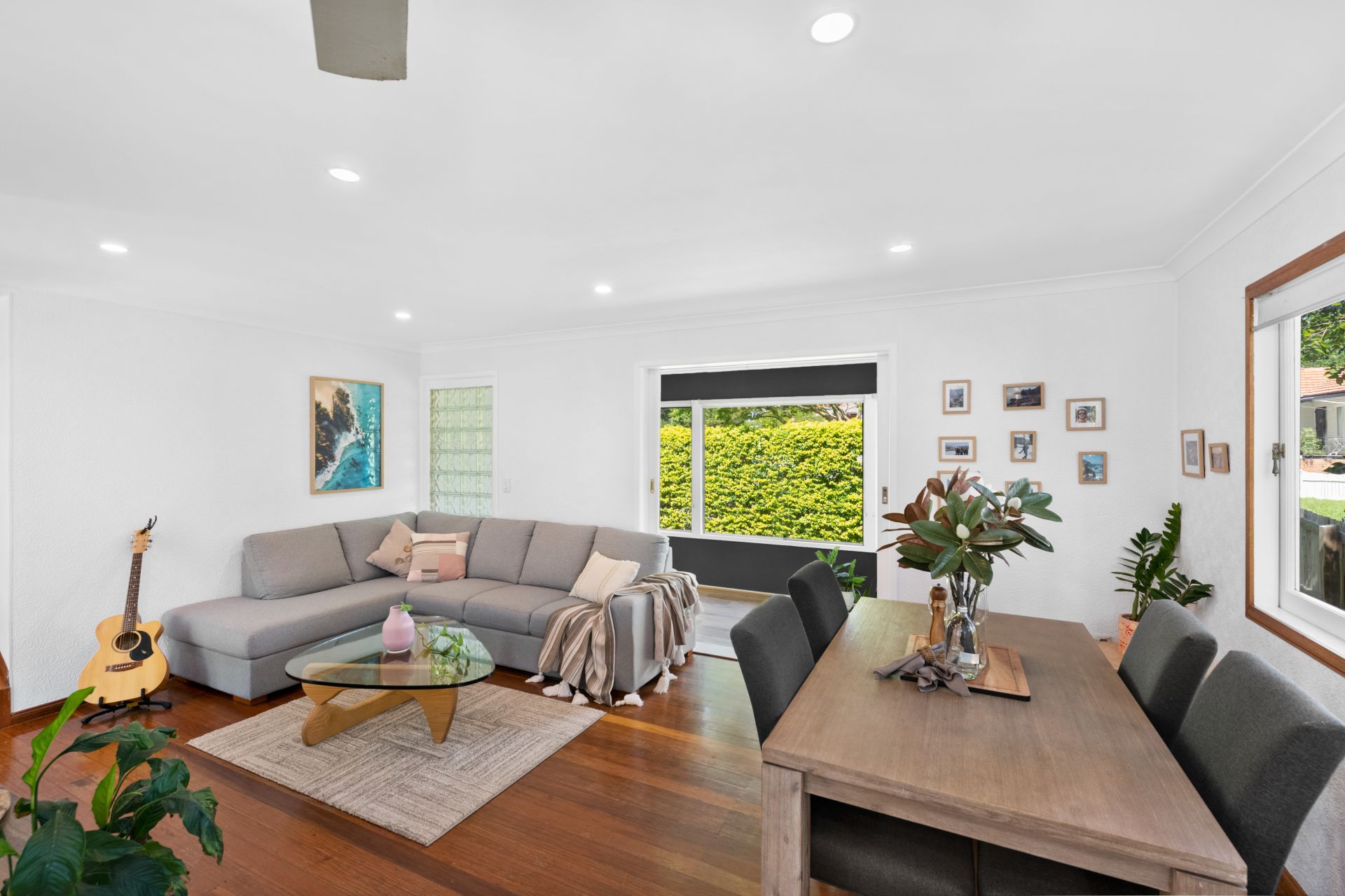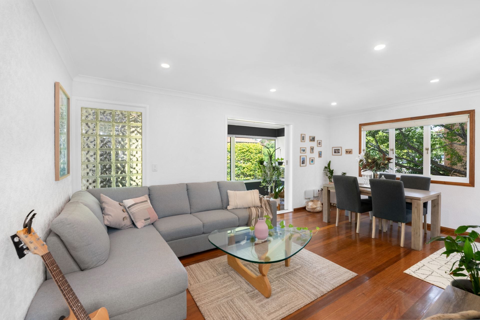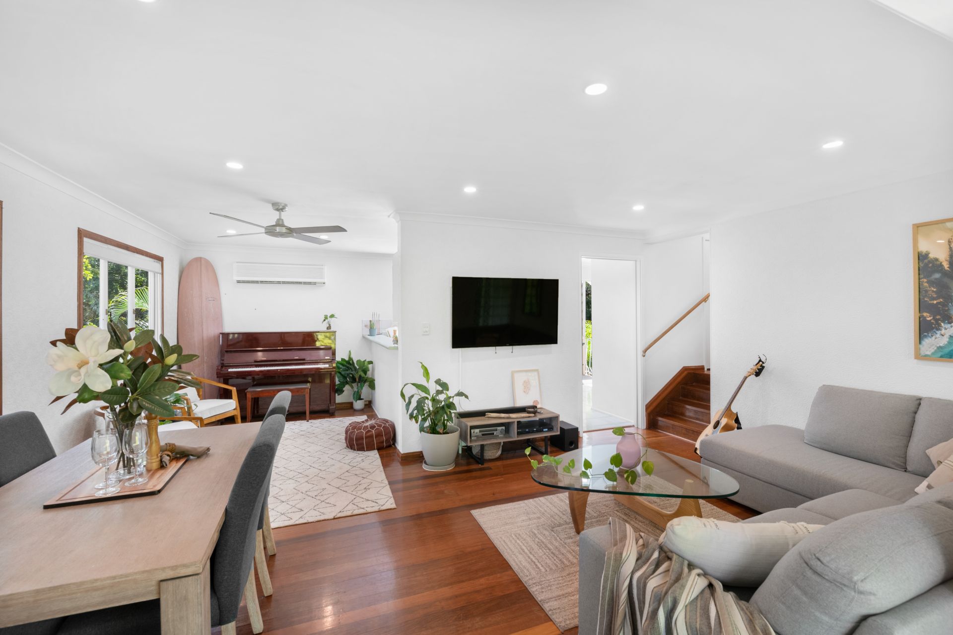 - The lounge and dining rooms follow on from the sunroom at the front of the home and share a large combined space featuring timber flooring, split system air-conditioning, ceiling fan and LED down-lights.