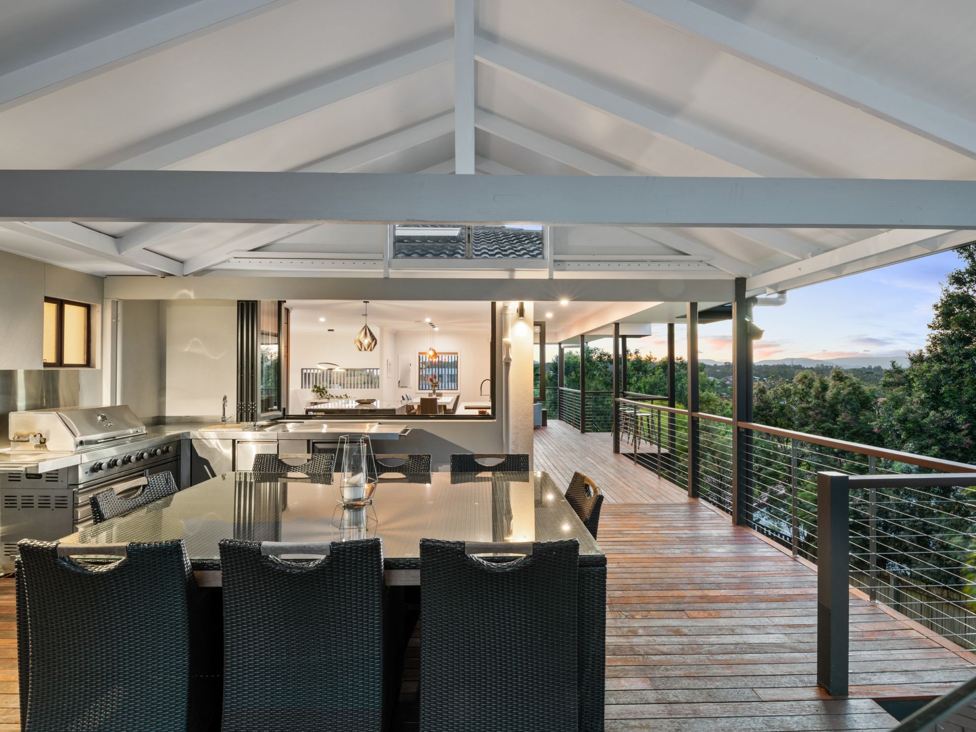 - The large entertainer's deck enjoys panoramic mountain views from its elevated perch while adjoining the homes amazing swimming pool. This incredible outdoor space features timber decking, high ceiling, stainless outdoor kitchen/BBQ with sink, servery from kitchen, lighting and power. Capturing the amazing breezes that flow throughout the region, it truly is a wonderous place to spend time outdoors.
