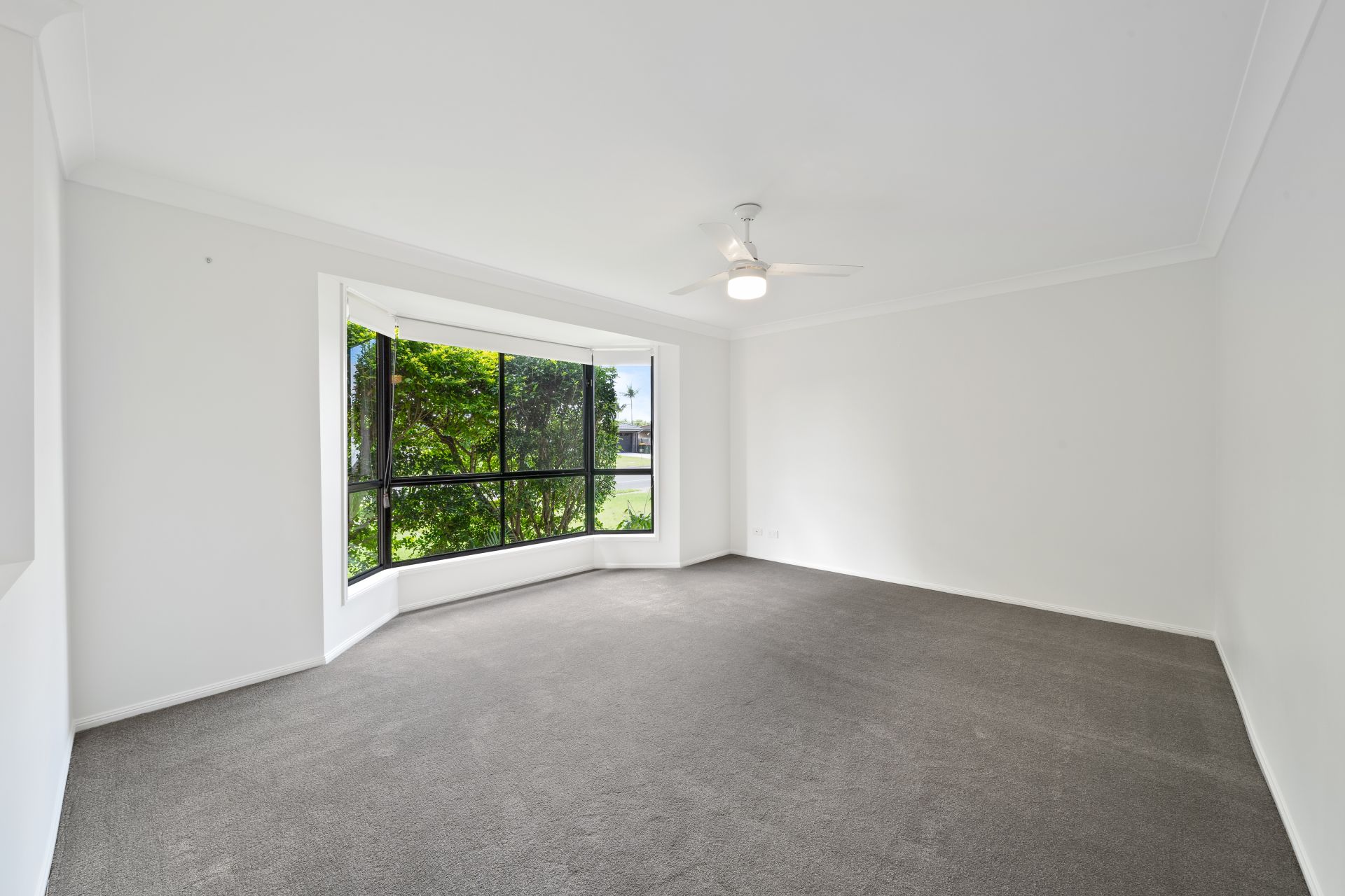 > Large loungeroom with bay window, fresh paintwork, ceiling fan, security screens, new carpeted flooring and new roller blinds