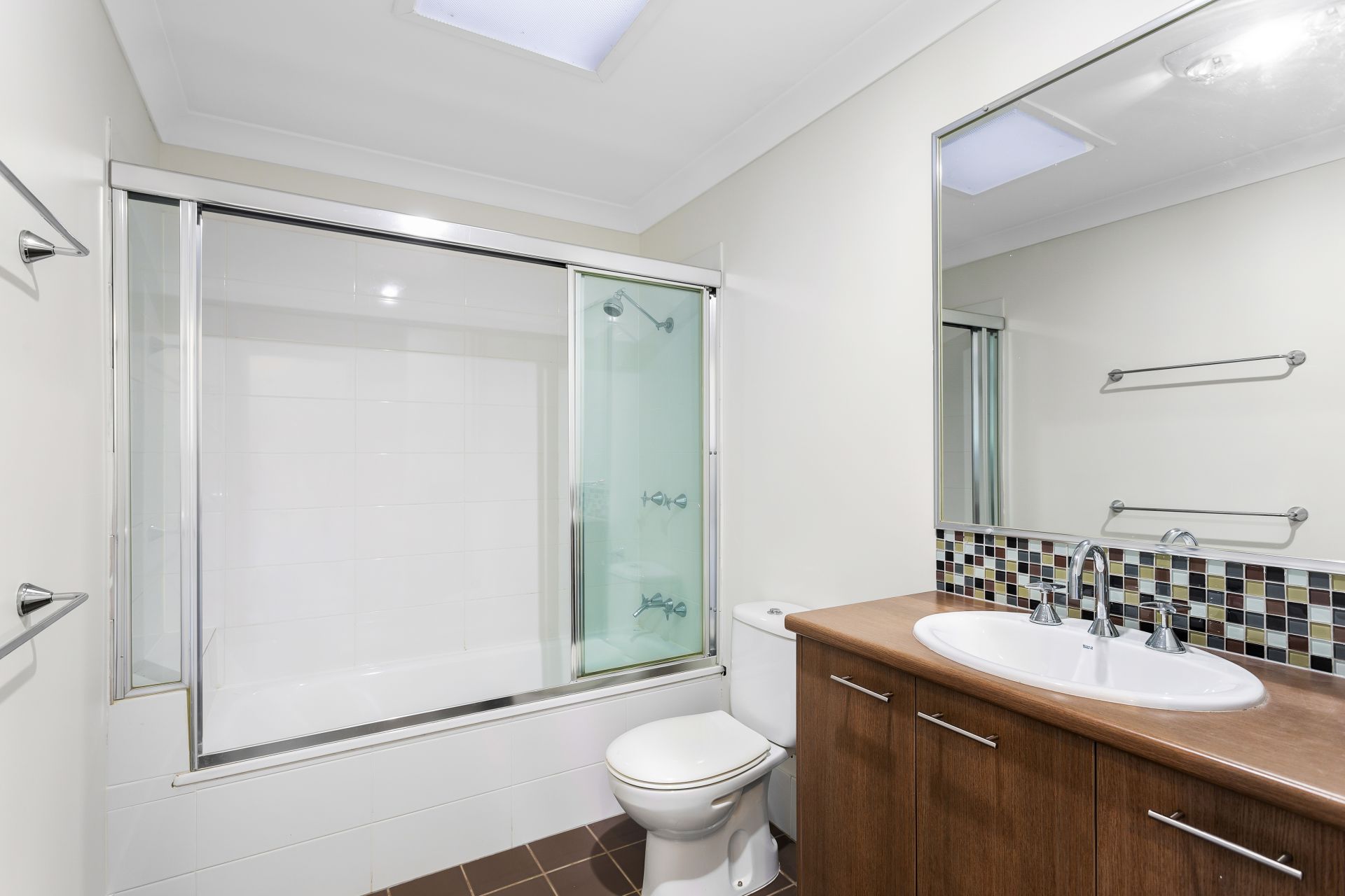 > The main bathroom is well appointed with a modern shower over bath which is soaked in natural light thanks to the skylight. A large mirror and vanity with loads of storage, toilet, combination heat/exhaust fan and two towel rails