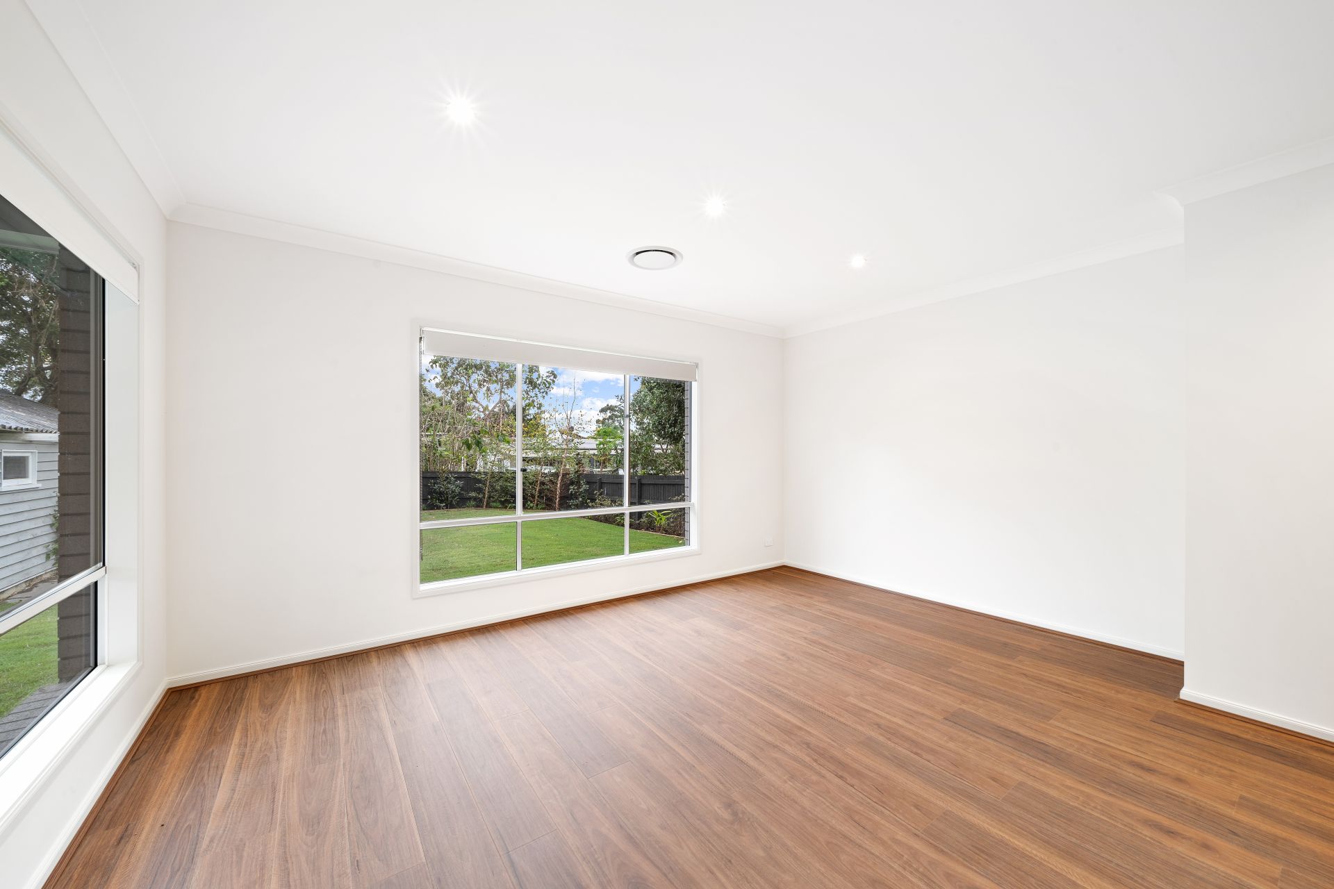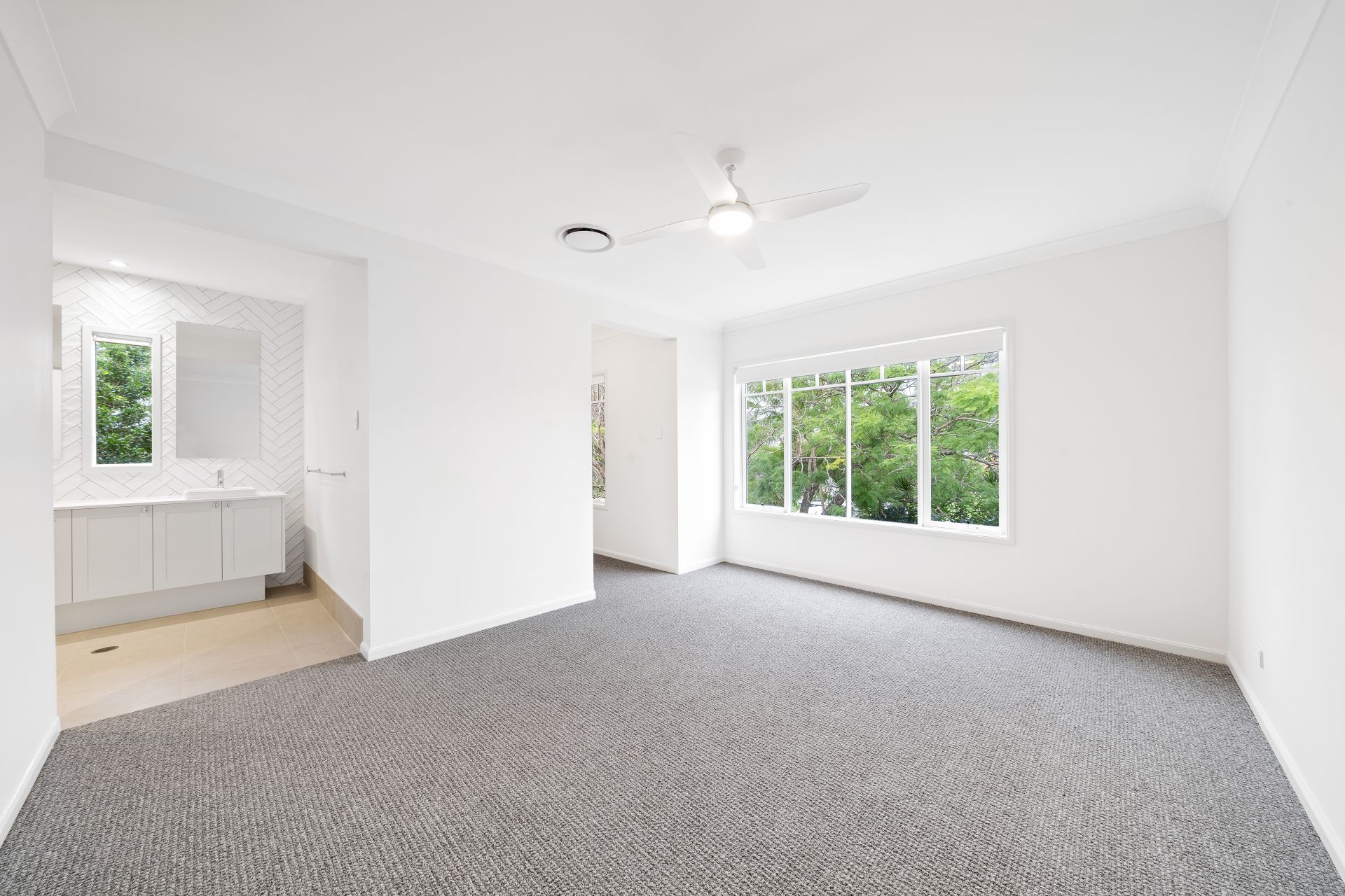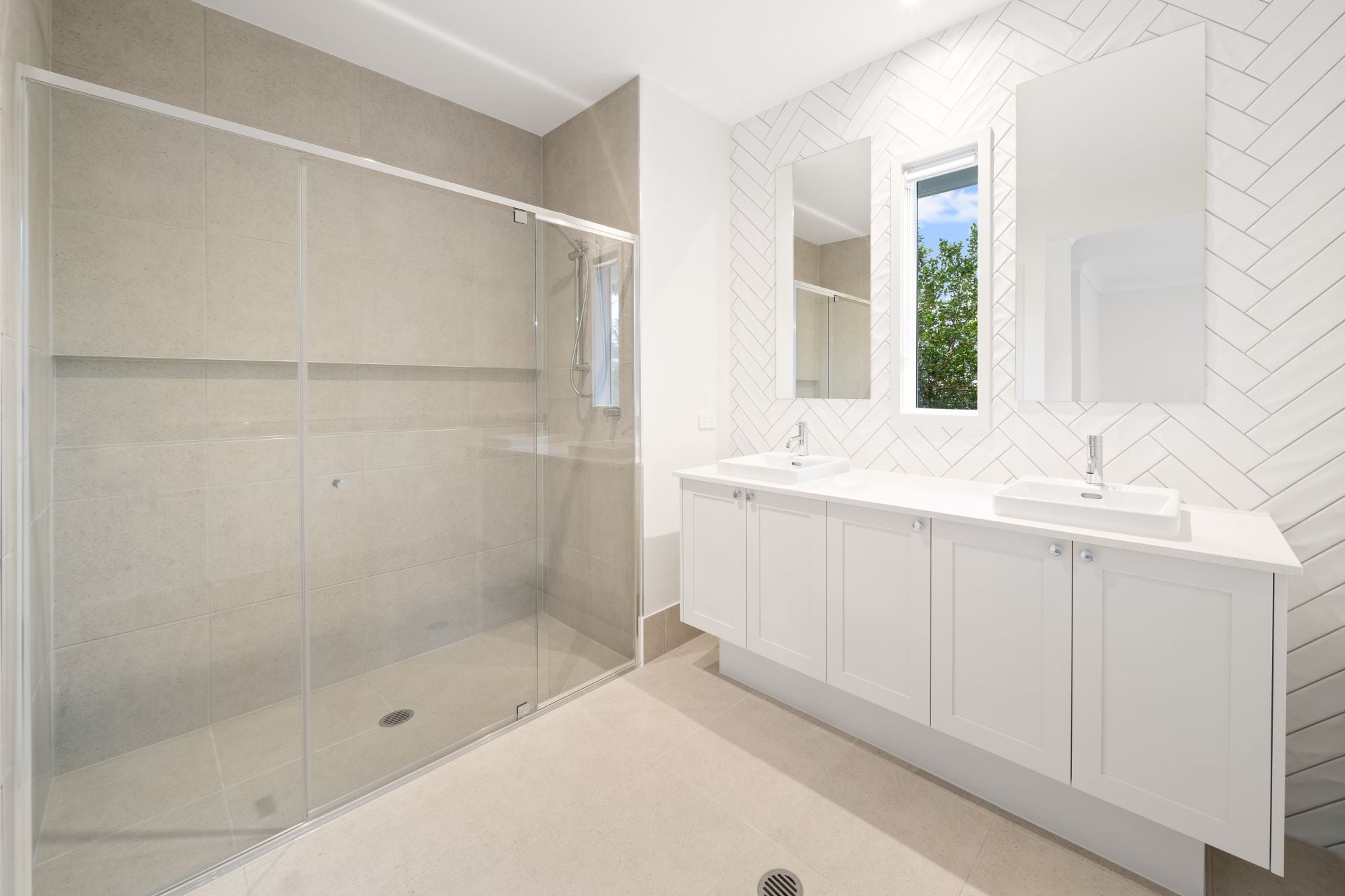 > The master ensuite features chic floor-to-ceiling tiles, shower with detachable showerhead, wall niche, dual basin 20mm stone topped floating vanity with 2pac cabinetry, plenty of storage, dual frameless vanity mirrors, down-lighting, towel rack, extra-high ceilings, fixed window and separate toilet.