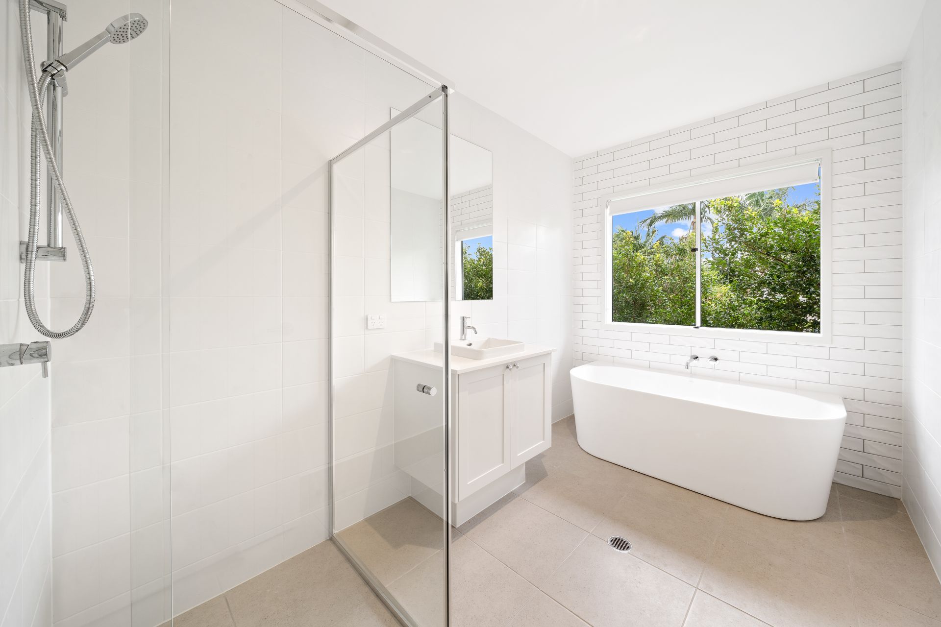 > The main bathroom located on the top level features chic floor-to-ceiling tiles, semi-freestanding bath, shower with detachable showerhead, single basin 20mm stone topped floating vanity with 2pac cabinetry, plenty of storage, frameless vanity mirror, down-lighting, towel rack, extra-high ceilings, sliding window and separate toilet.