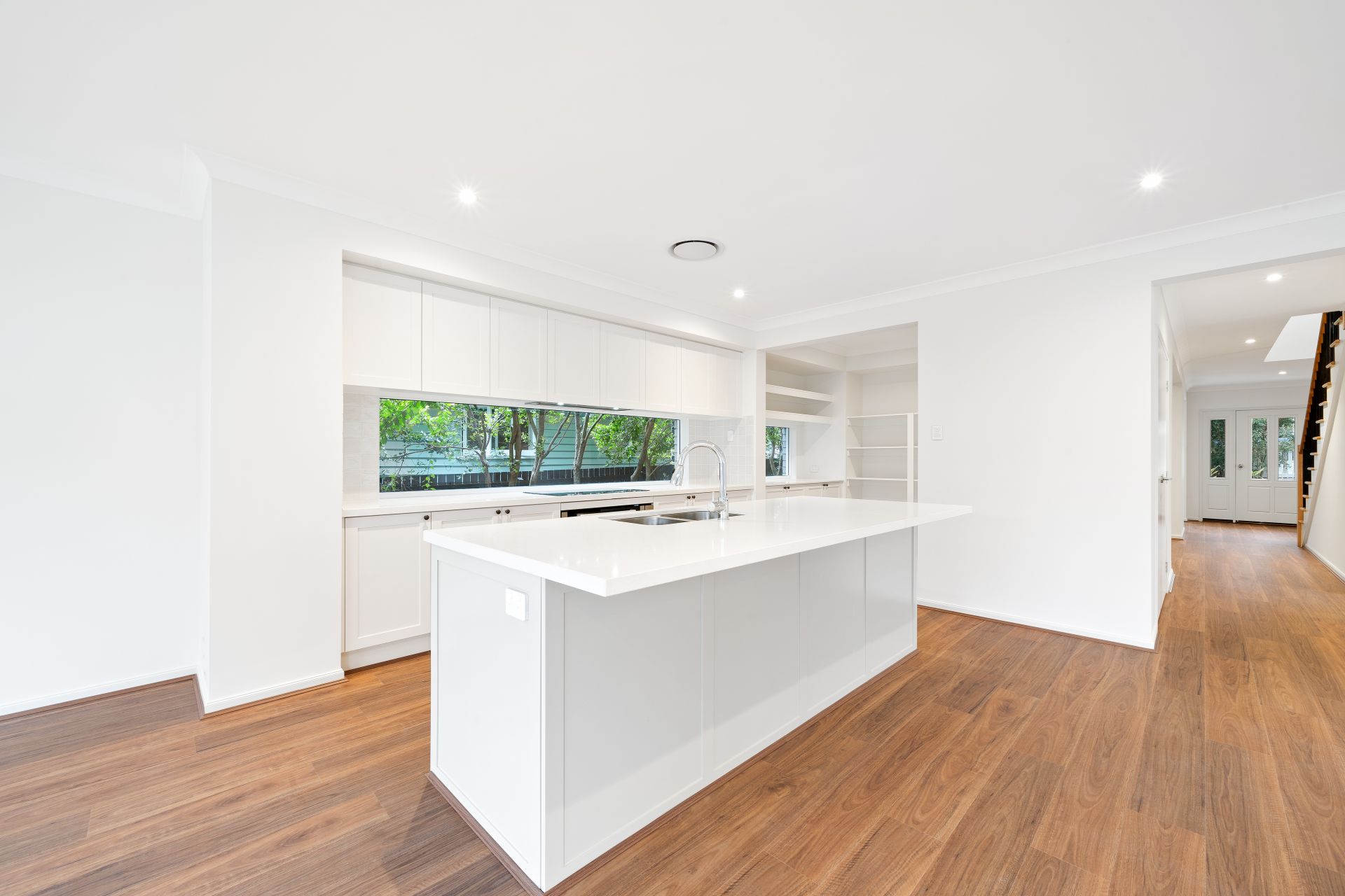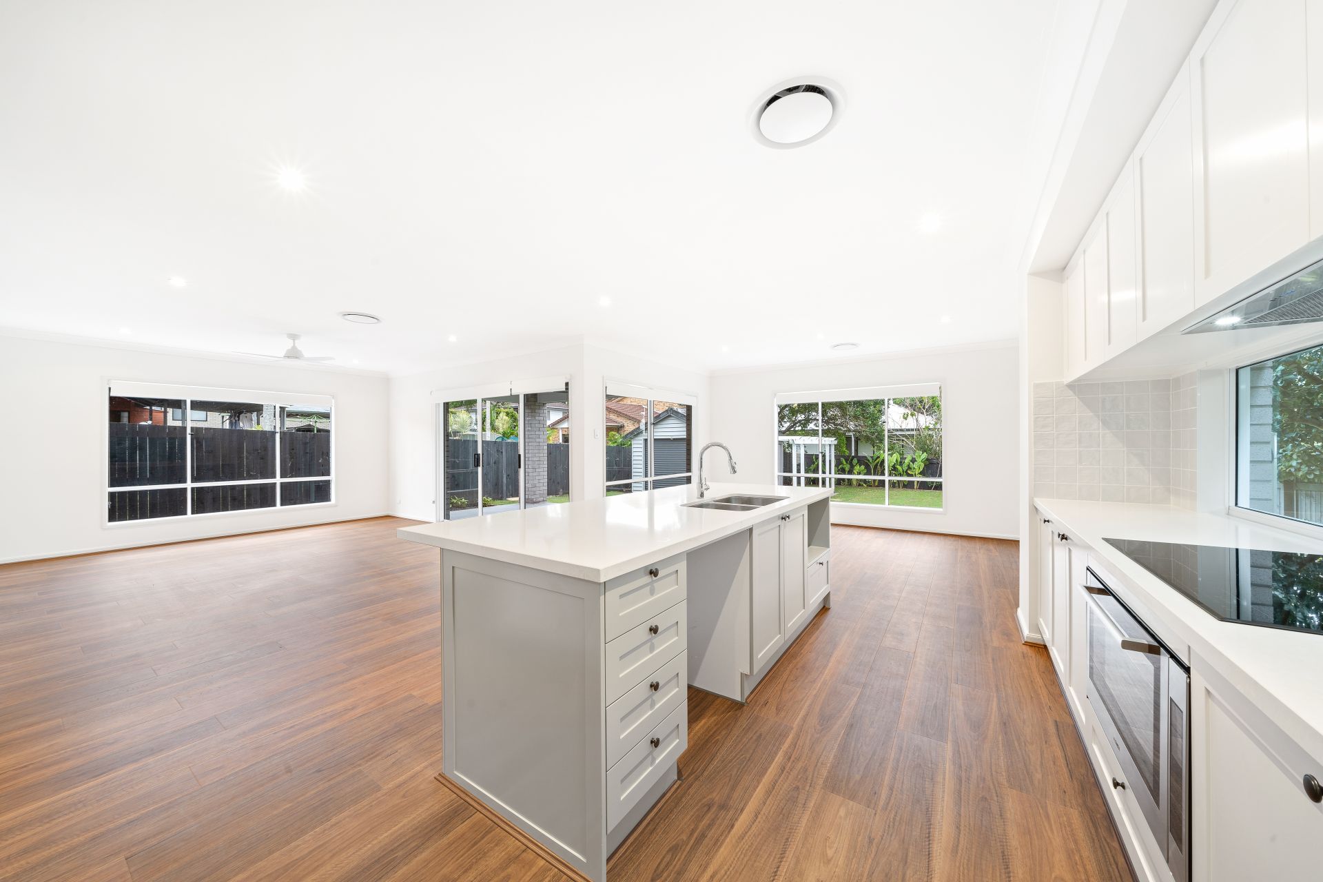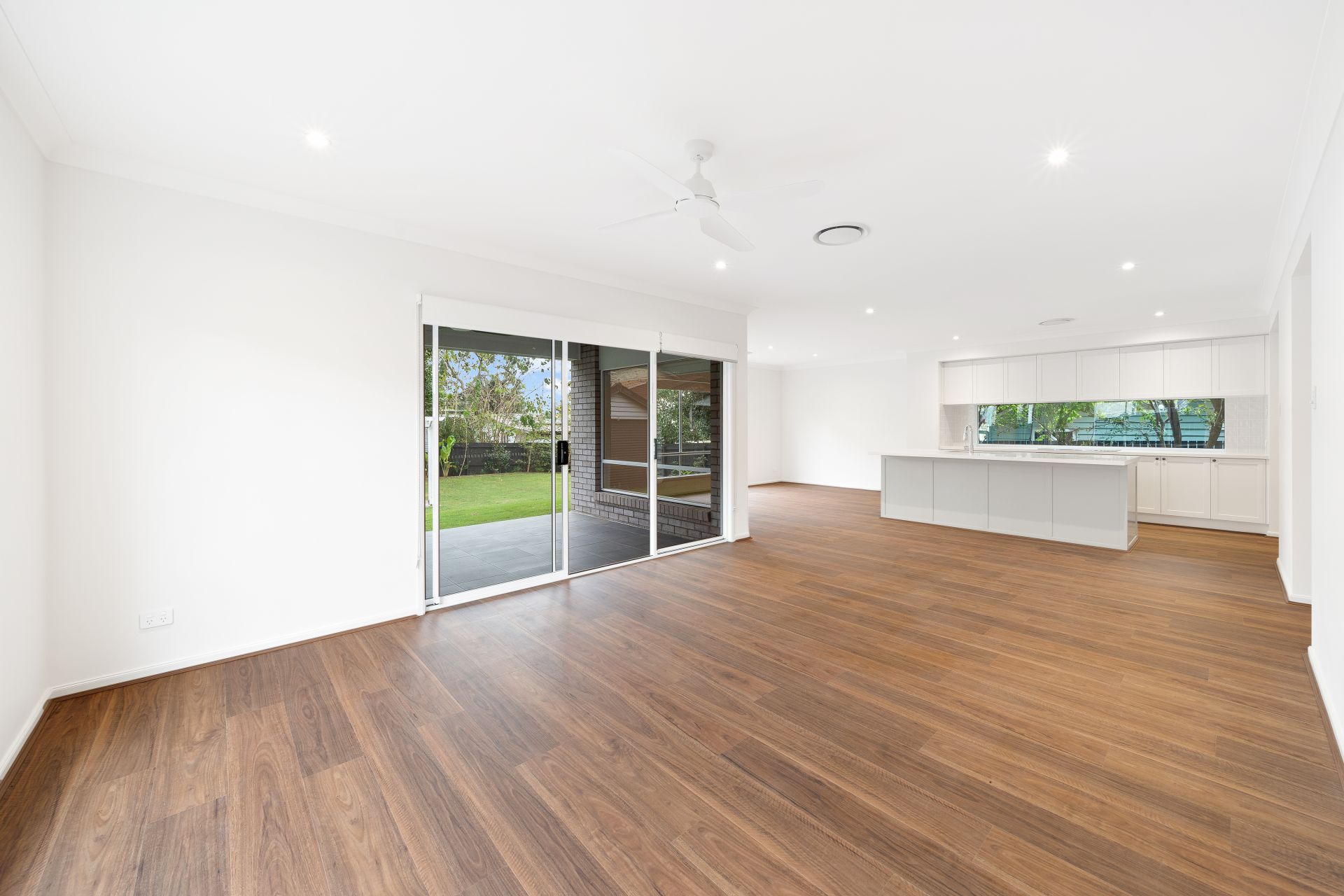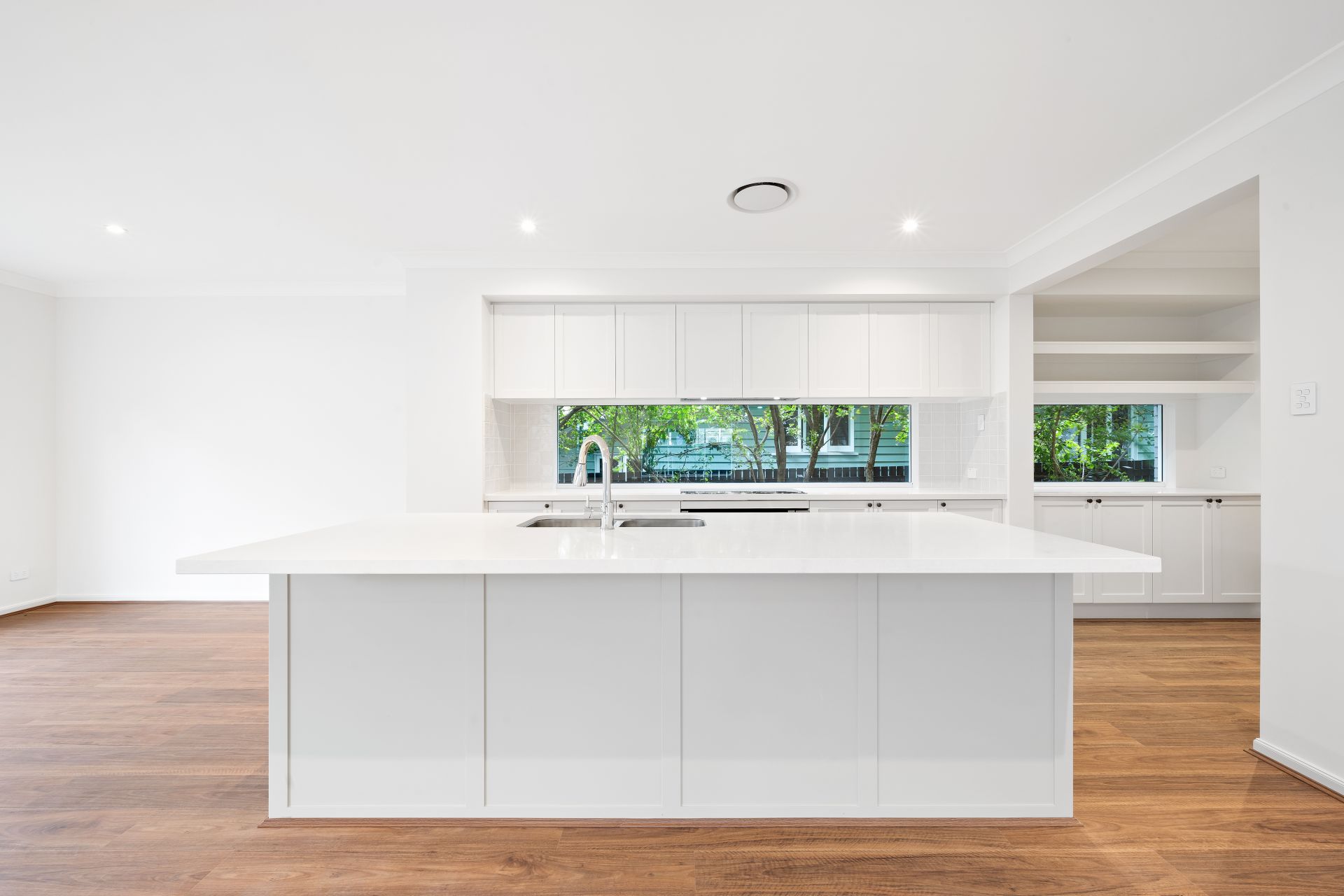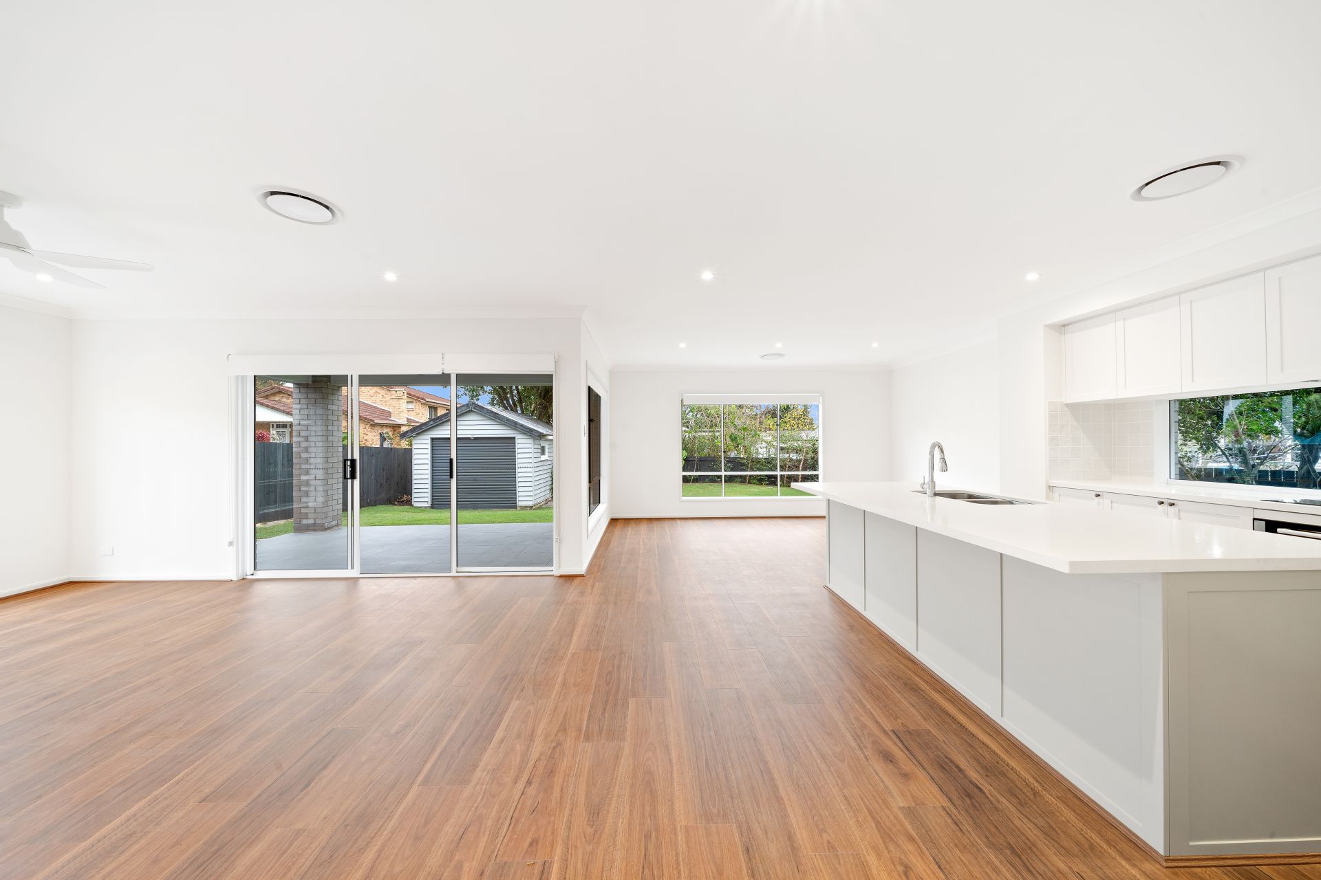 > The open plan main living/dining areas located at the back of the home flows effortlessly to the kitchen and through to the outdoor entertaining area. The light and contemporary colour scheme adds to the expansive nature of the home, featuring ducted air-conditioning, down-lighting, timber look hybrid flooring, sliding windows, roller blinds and large glass sliding doors allowing access to the outdoor entertaining.